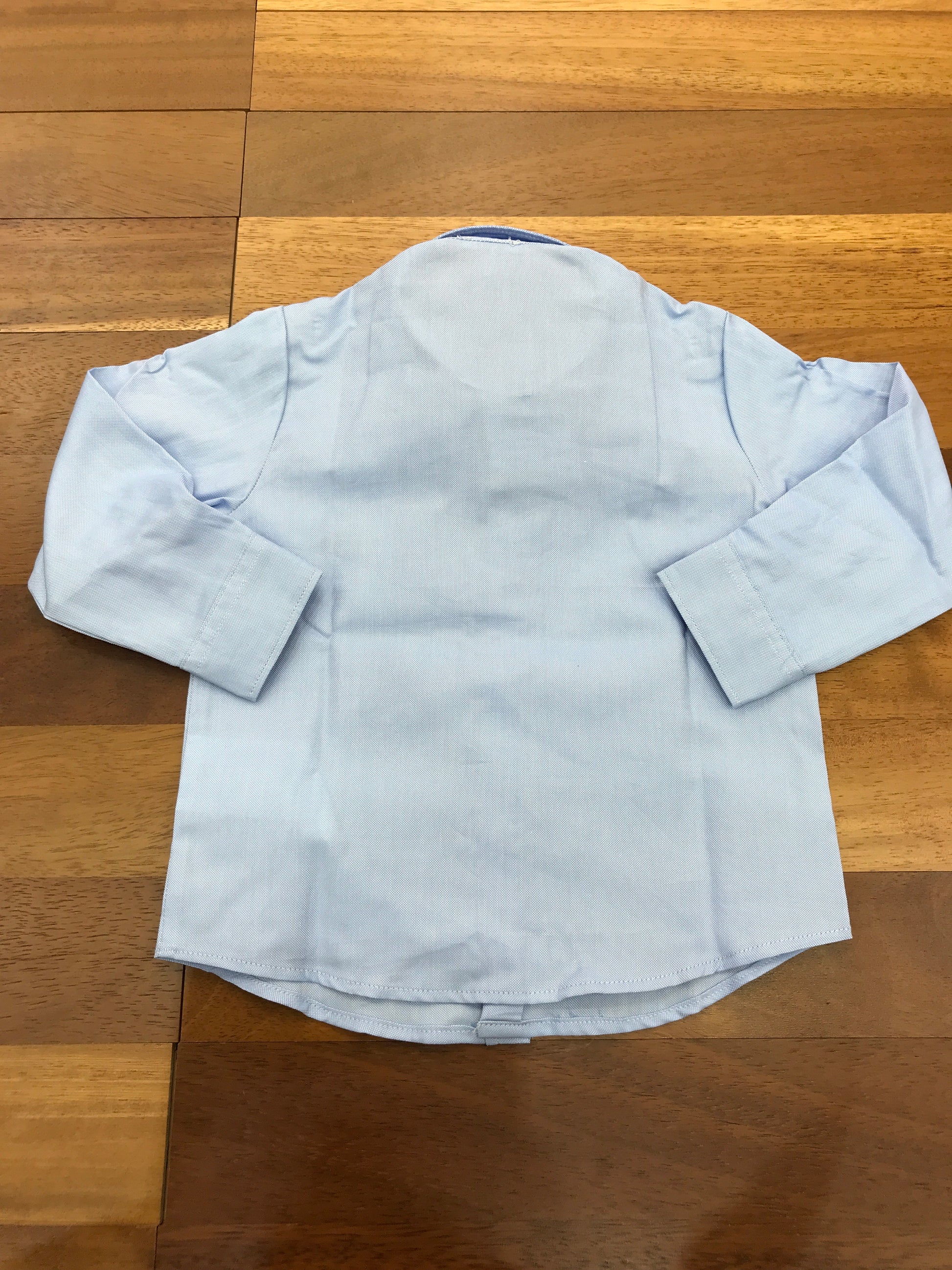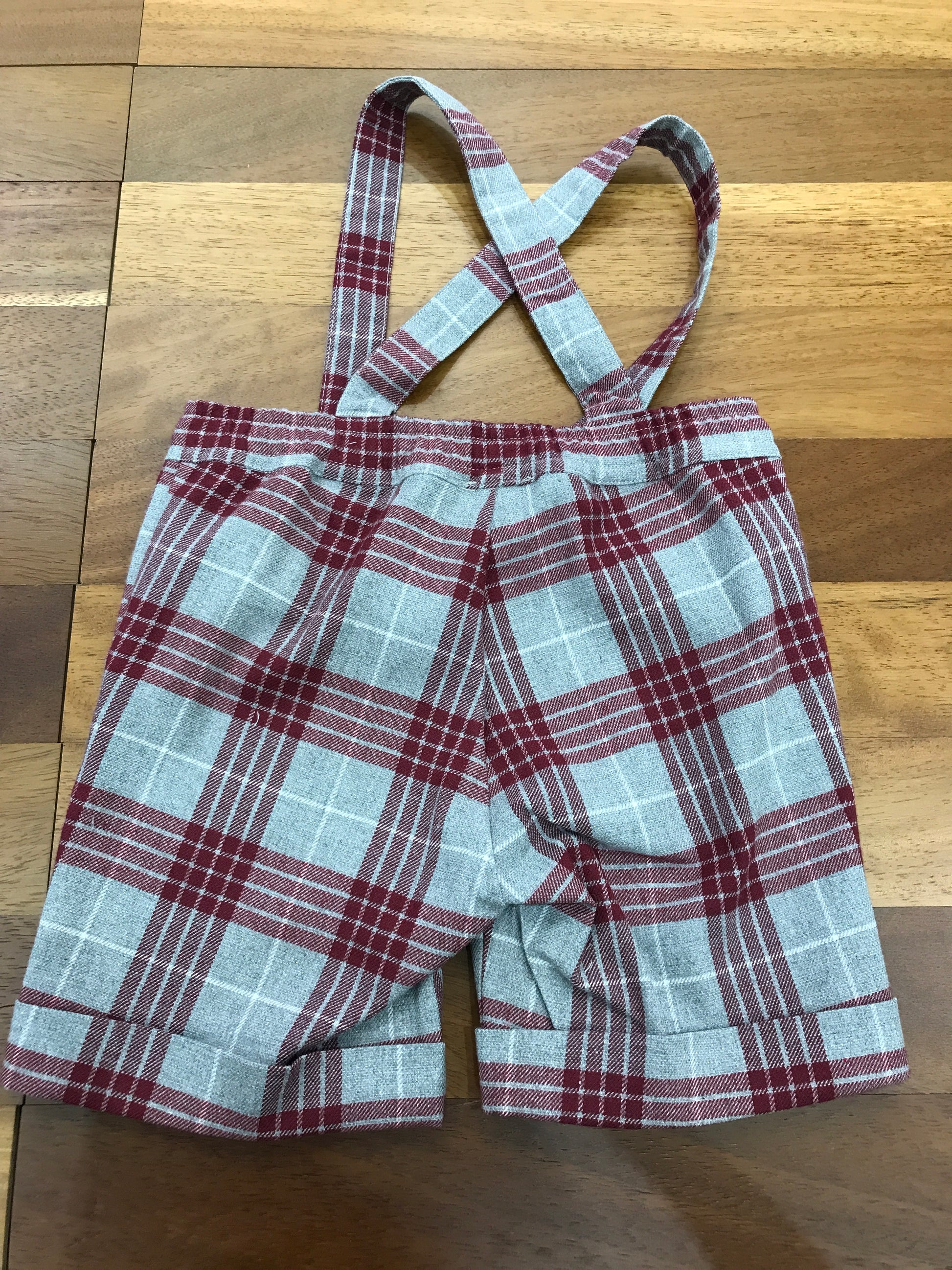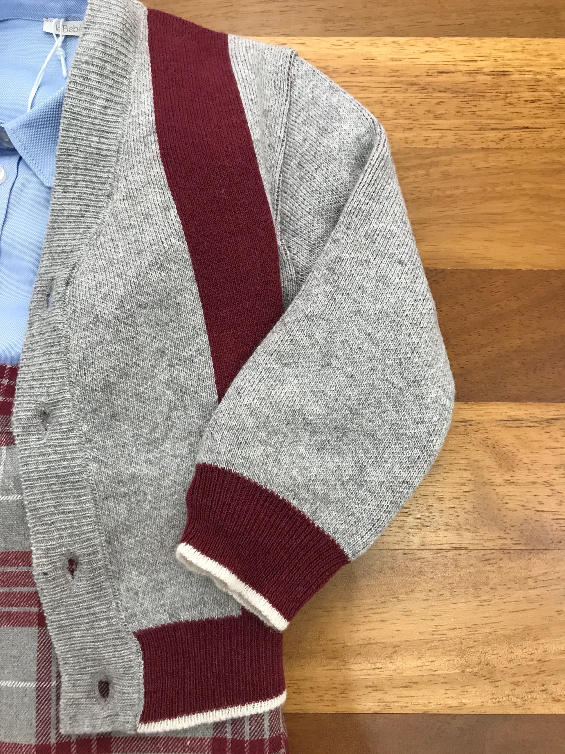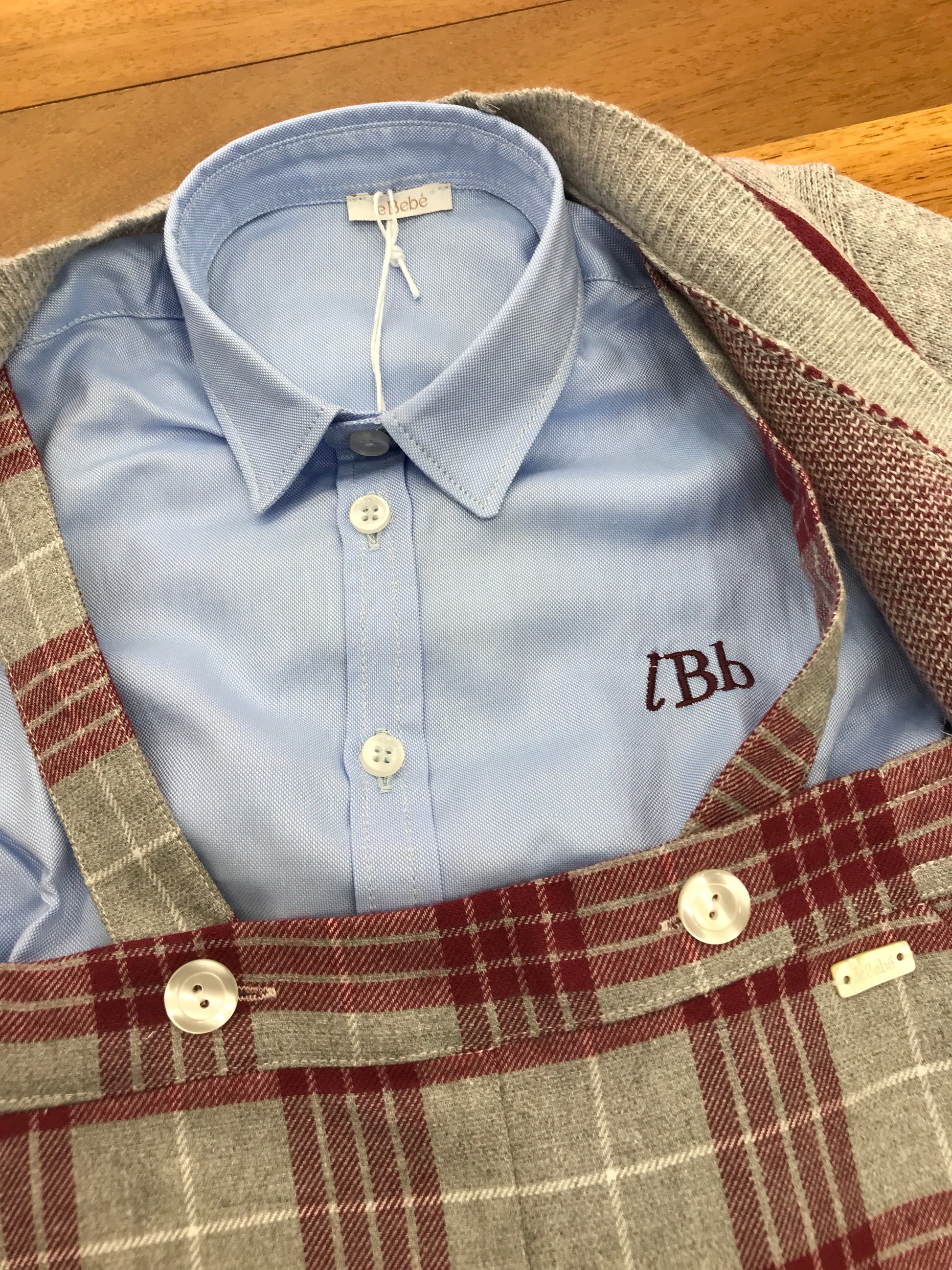 Set completo composto da tre capi: una salopette grigia con bretelle e dettagli bordeaux, una camicia celeste a maniche lunghe con bottoni, e un cardigan grigio arricchito da rifiniture bordeaux e chiusura con bottoncini.