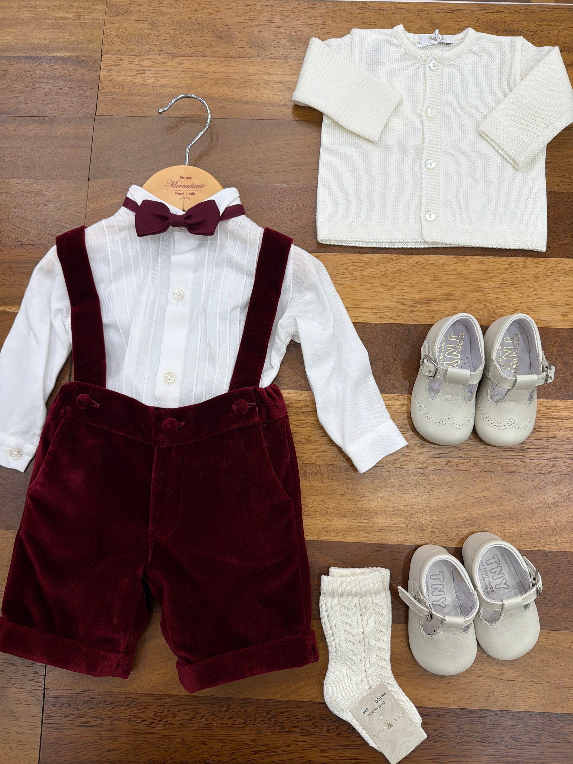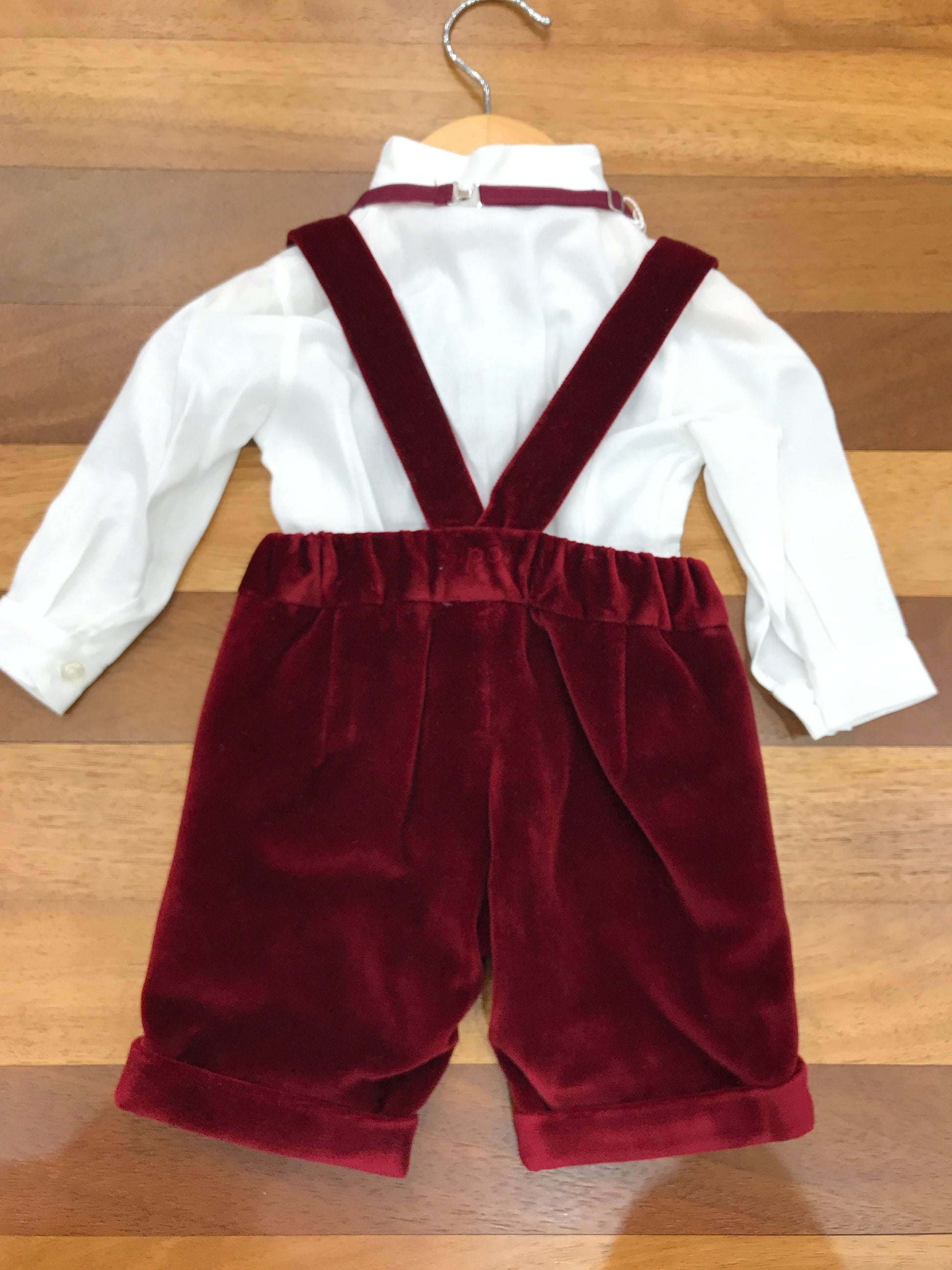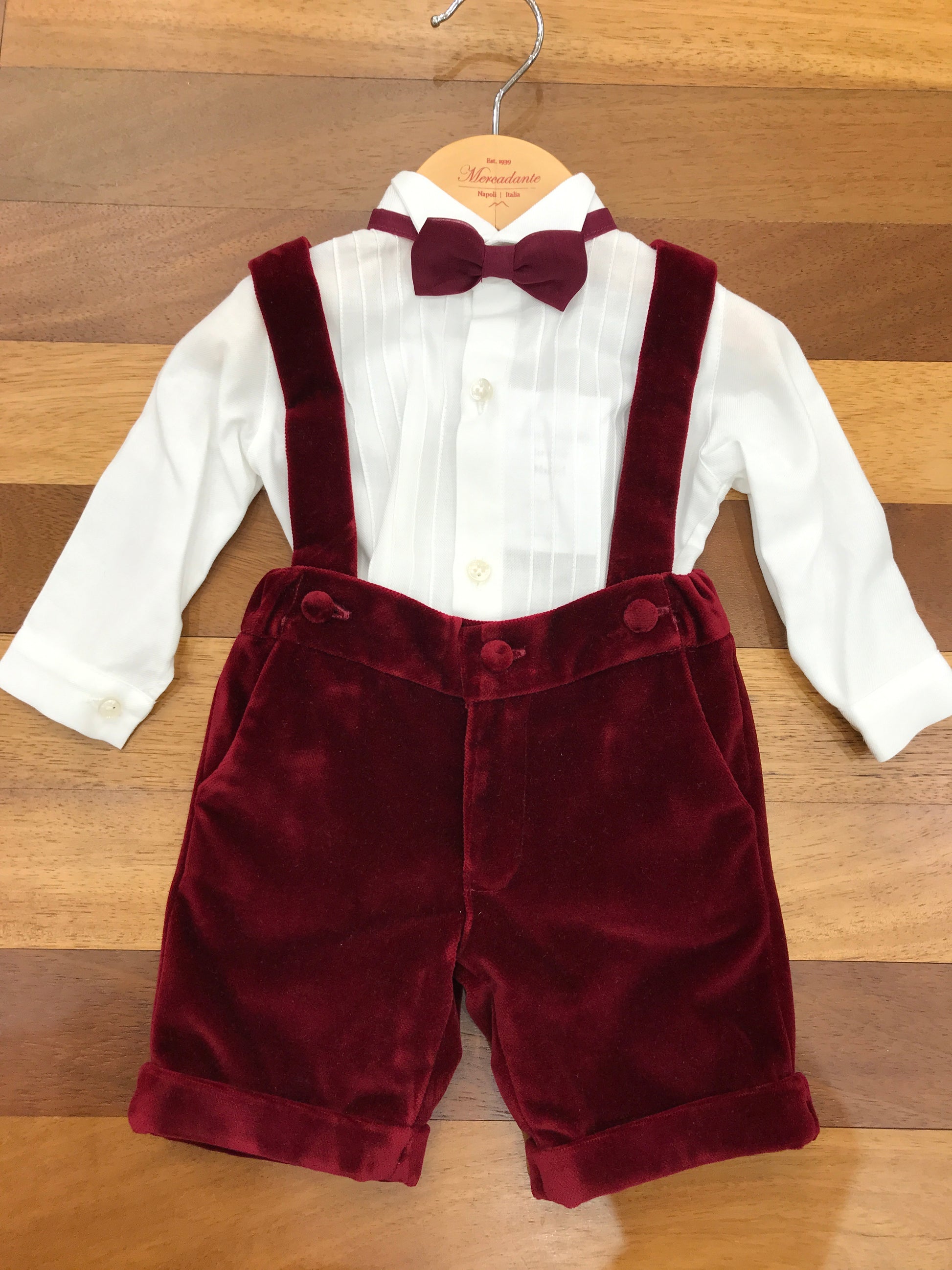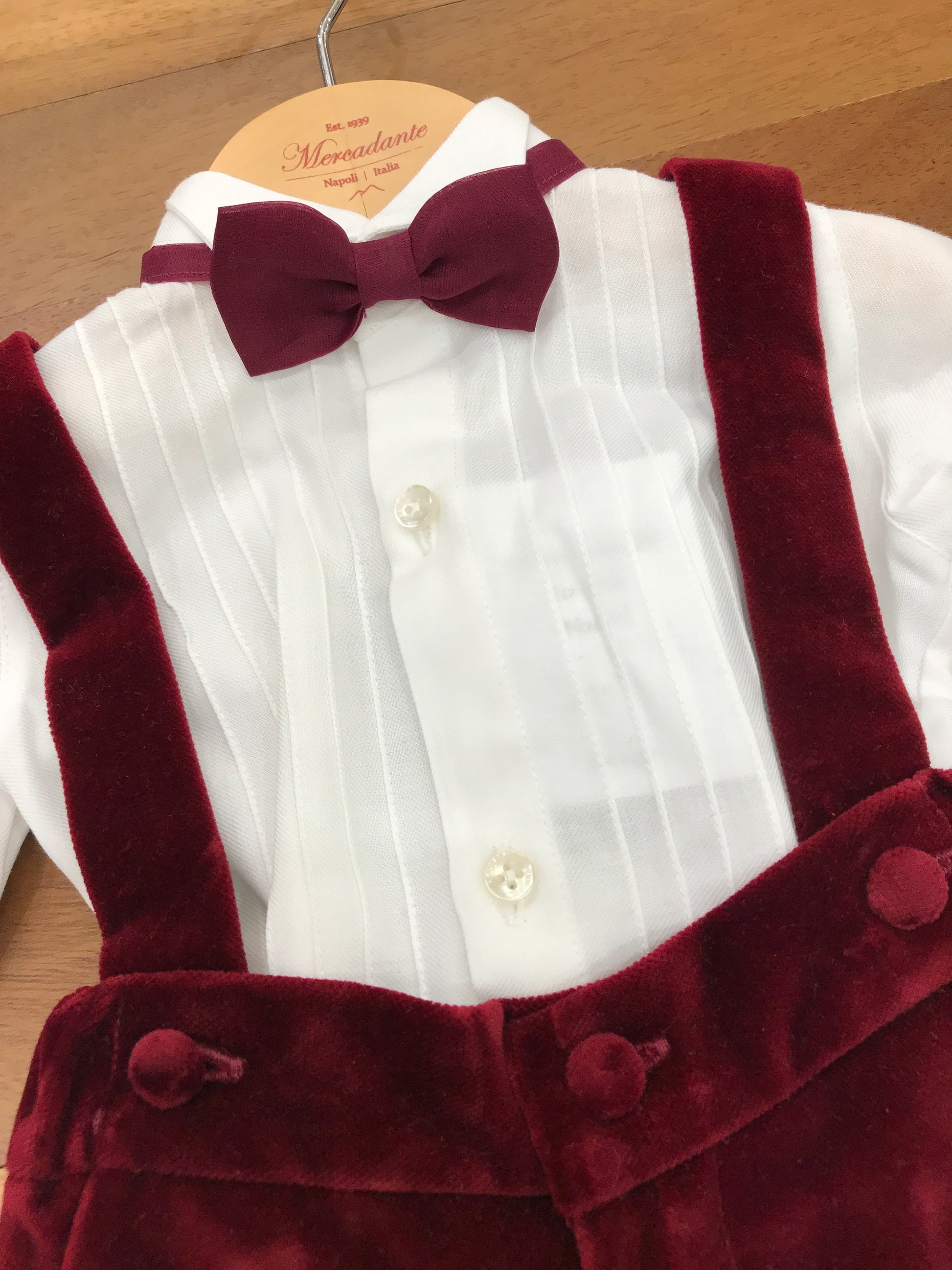Elegante salopette in velluto con bretelle regolabili, abbinata a una raffinata camicina in cotone caldo con maniche lunghe e plissettature strutturate. Completa l'insieme un delicato papillon in organza tono su tono, che conferisce un tocco di sofisticatezza e distinzione al capo. Un outfit coordinato perfetto per occasioni speciali, dove qualità dei materiali e attenzione ai dettagli si incontrano in un'armonia senza compromessi.
