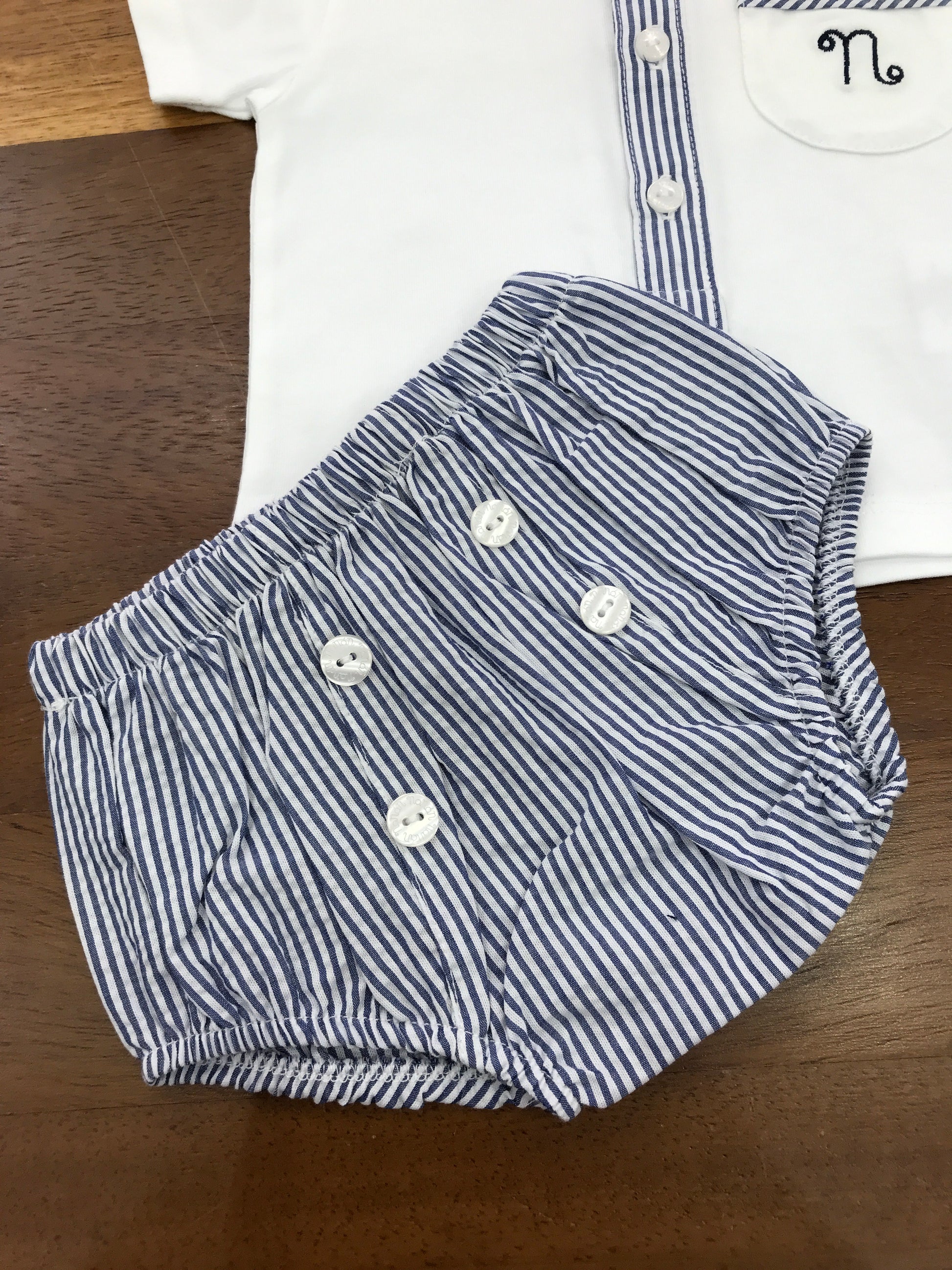 Completo Nanan due pezzi culotte a righe bianche e blu con bottoncini con t-shirt bianca mezza manica con collo blu a righe