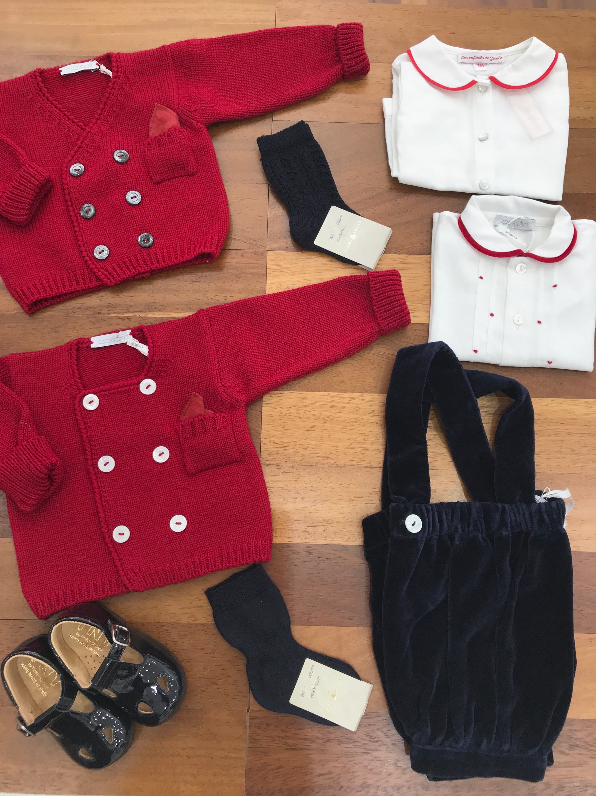 Questo elegante completo festivo combina un cardigan rosso con una camicia coordinata a profilo rosso, completato da pantaloni blu e accessori abbinati tra cui scarpine e calzini blu. Un insieme raffinato e armonico, perfetto per celebrare le festività natalizie con stile e coordinamento cromatico impeccabile.