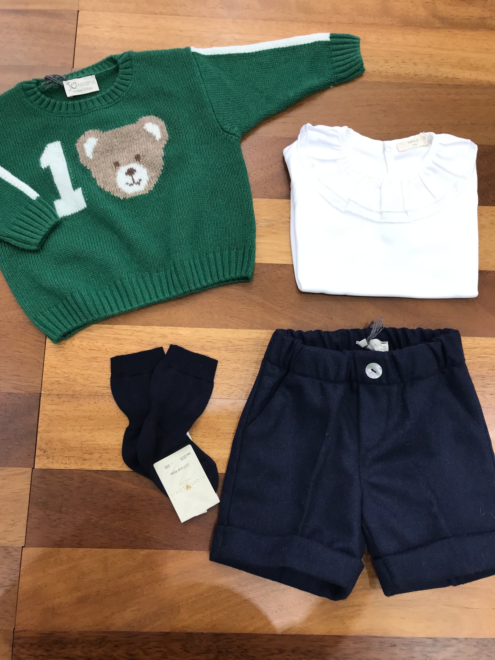Elegante ensemble natalizio composto da un raffinato maglioncino in lana verde, abbinato a un body bianco con dettagli a ruches, completato da calzini blu scuro e bermuda coordinati. Un outfit sofisticato e versatile, perfetto per le festività, che combina comfort e stile con materiali di qualità.