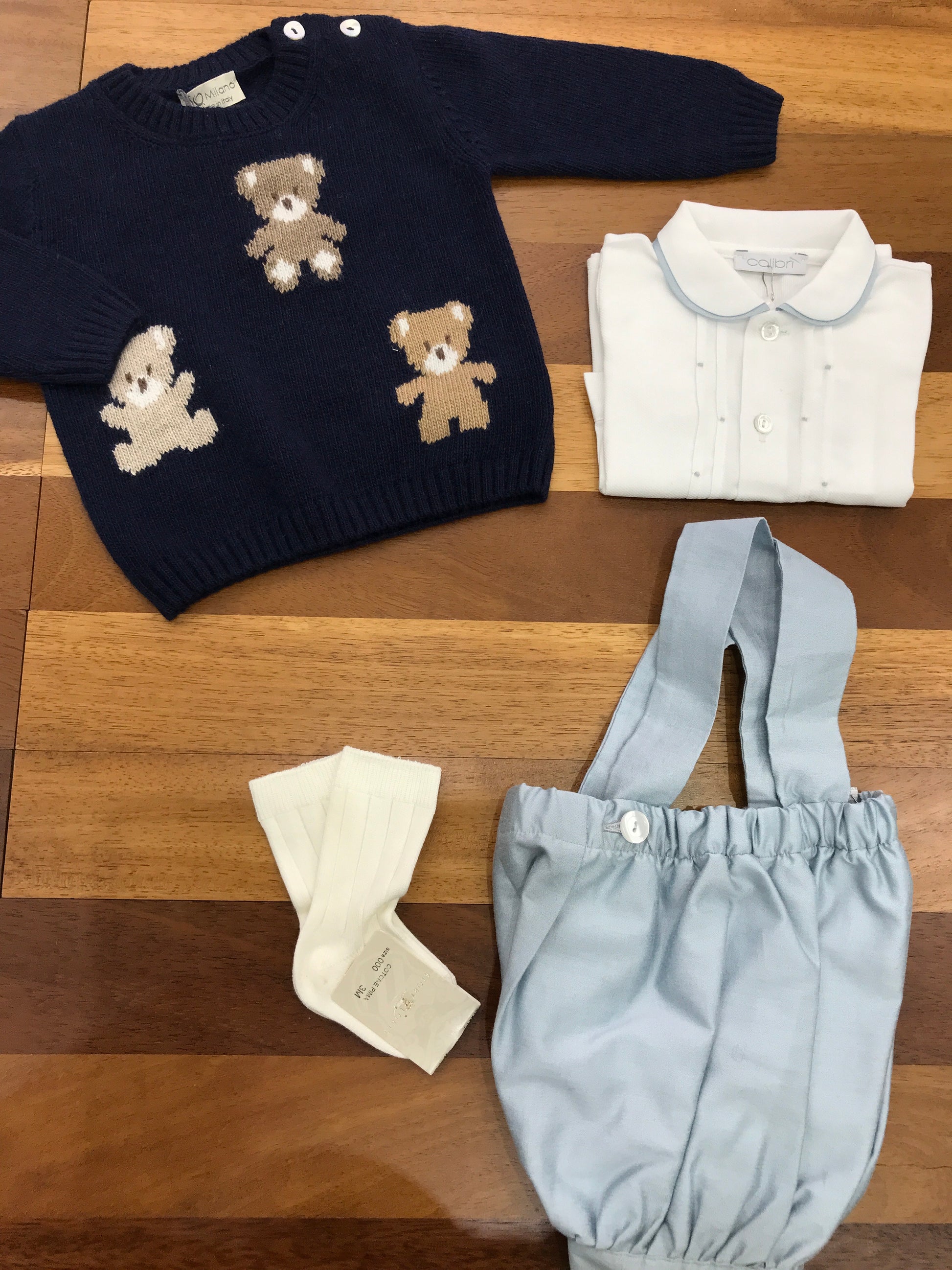 Elegante ensemble natalizio composto da morbido maglione in lana blu navy, camicia con profilo azzurro, pantaloni coordinati in tonalità celeste e calzini in panna. Un outfit raffinato e versatile, perfetto per le festività, che combina comfort e stile con dettagli ricercati e abbinamenti armoniosi.