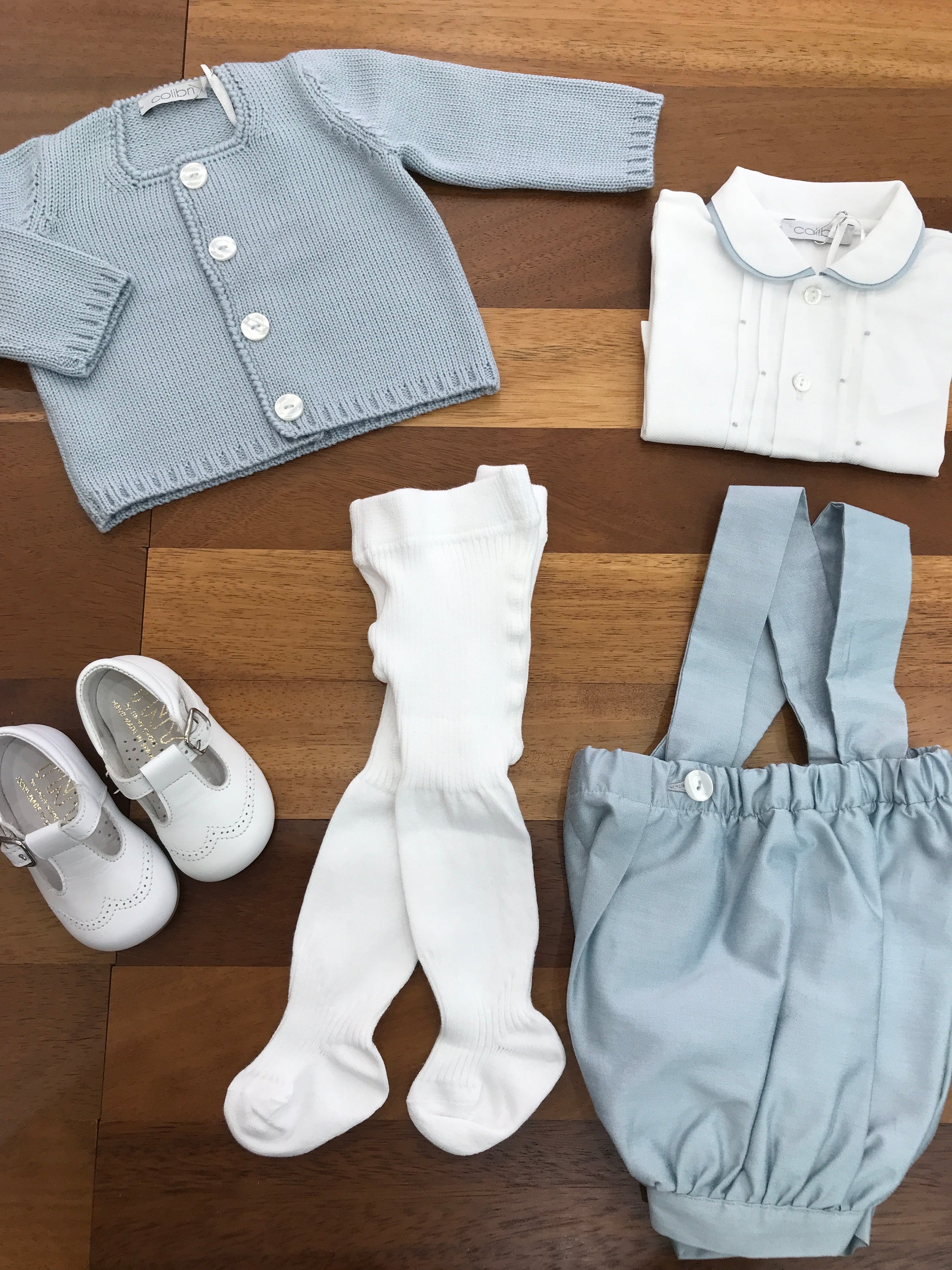 Questo elegante completo festivo combina un cardigan e pantalone in tonalità celeste con una raffinata camicia caratterizzata da dettagli coordinati. L'insieme è completato da scarpe e calze bianche, creando un look sofisticato e armonioso perfetto per le occasioni natalizie. Una scelta versatile che unisce comfort e stile con una palette cromatica equilibrata e di grande impatto visivo.