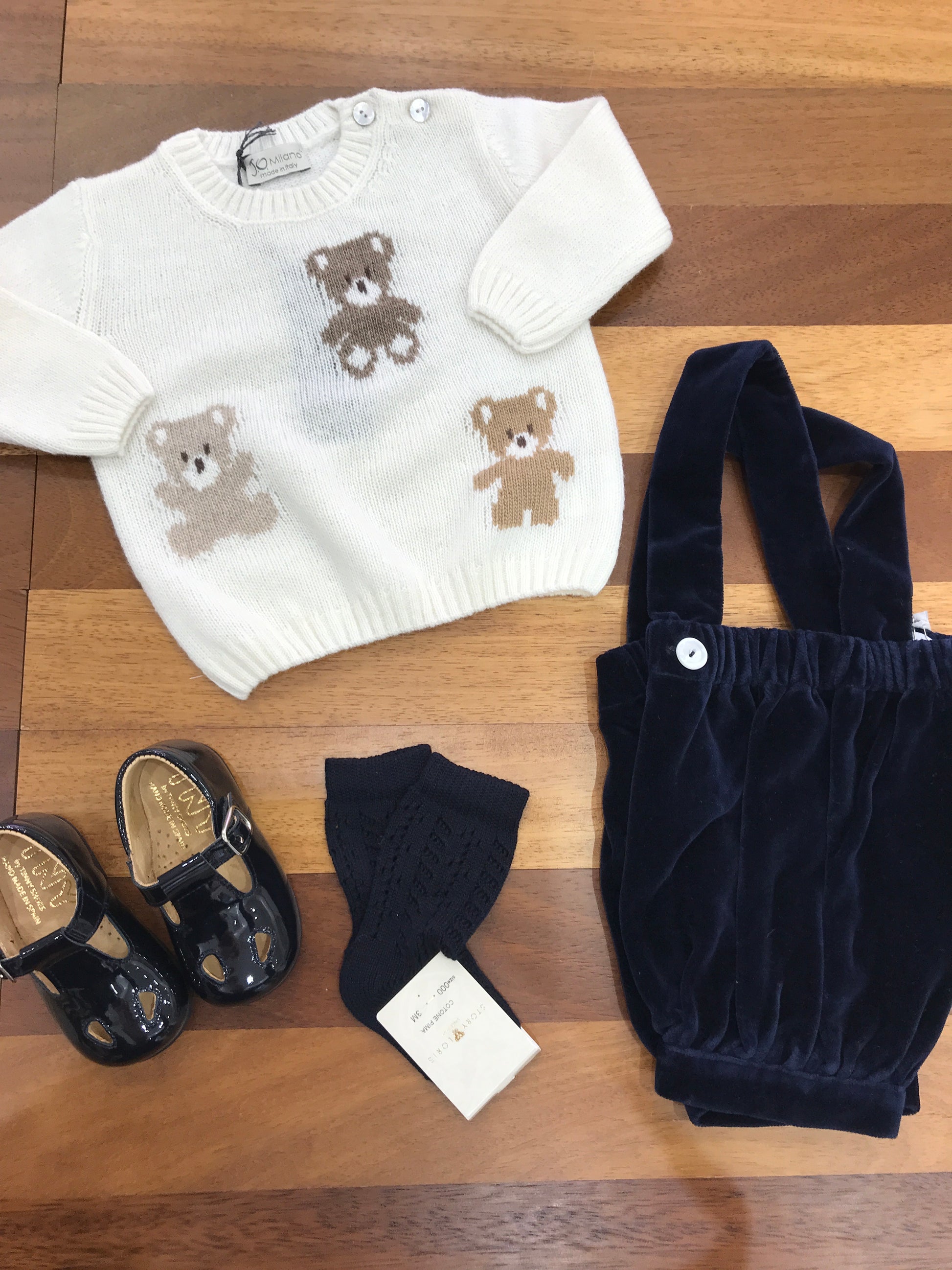 Elegante ensemble natalizio che combina un delicato maglioncino in lana color panna, arricchito da dettagli di orsetti ricamati, con un pantalone in velluto blu profondo. Completano il look un raffinato calzino traforato blu e una scarpina lucida coordinata. Un'opzione sofisticata per le occasioni festive, pensata per valorizzare lo stile dei più piccoli con capi di qualità e design curato.