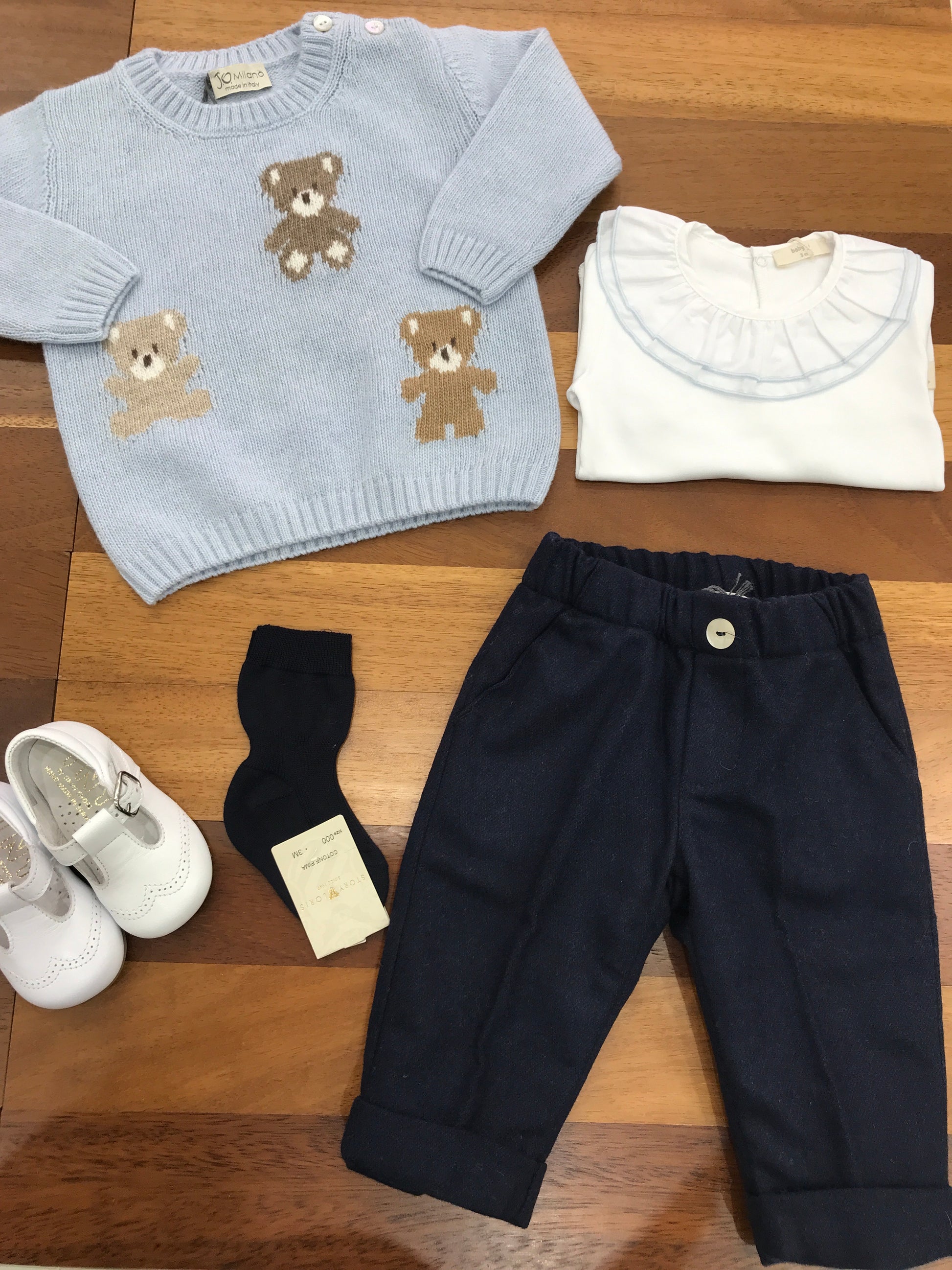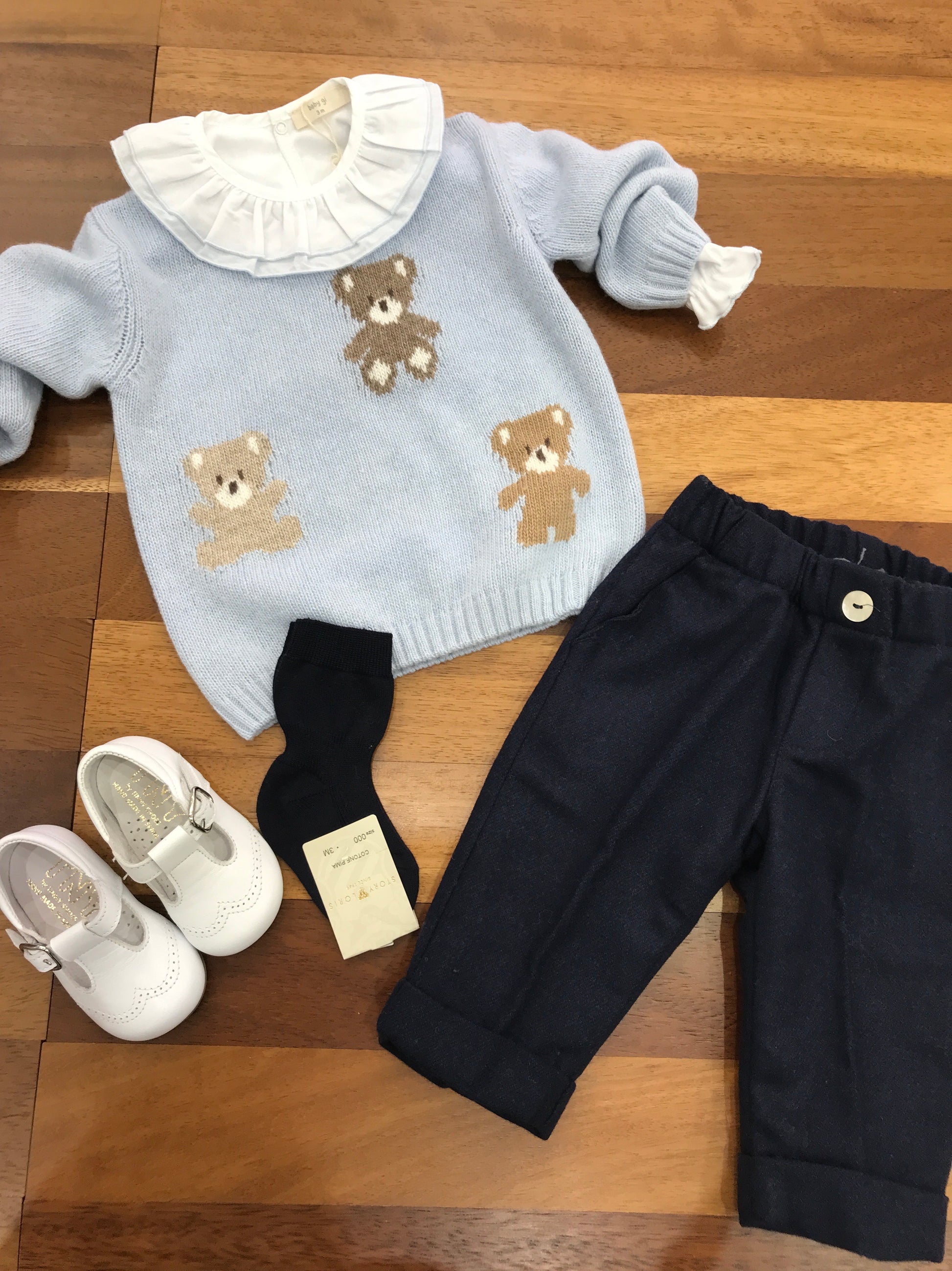 Elegante ensemble natalizio pensato per i più piccoli, caratterizzato da una raffinata composizione di capi coordinati. Il maglioncino in lana celeste presenta un delicato motivo con orsetto, abbinato a un pantalone lungo in panno blu scuro che garantisce comfort e praticità. Completano il set un body bianco con colletto arricchito da rusche celesti, calzini blu scuro e scarpine bianche, creando un'armonia cromatica sofisticata e versatile per occasioni speciali.