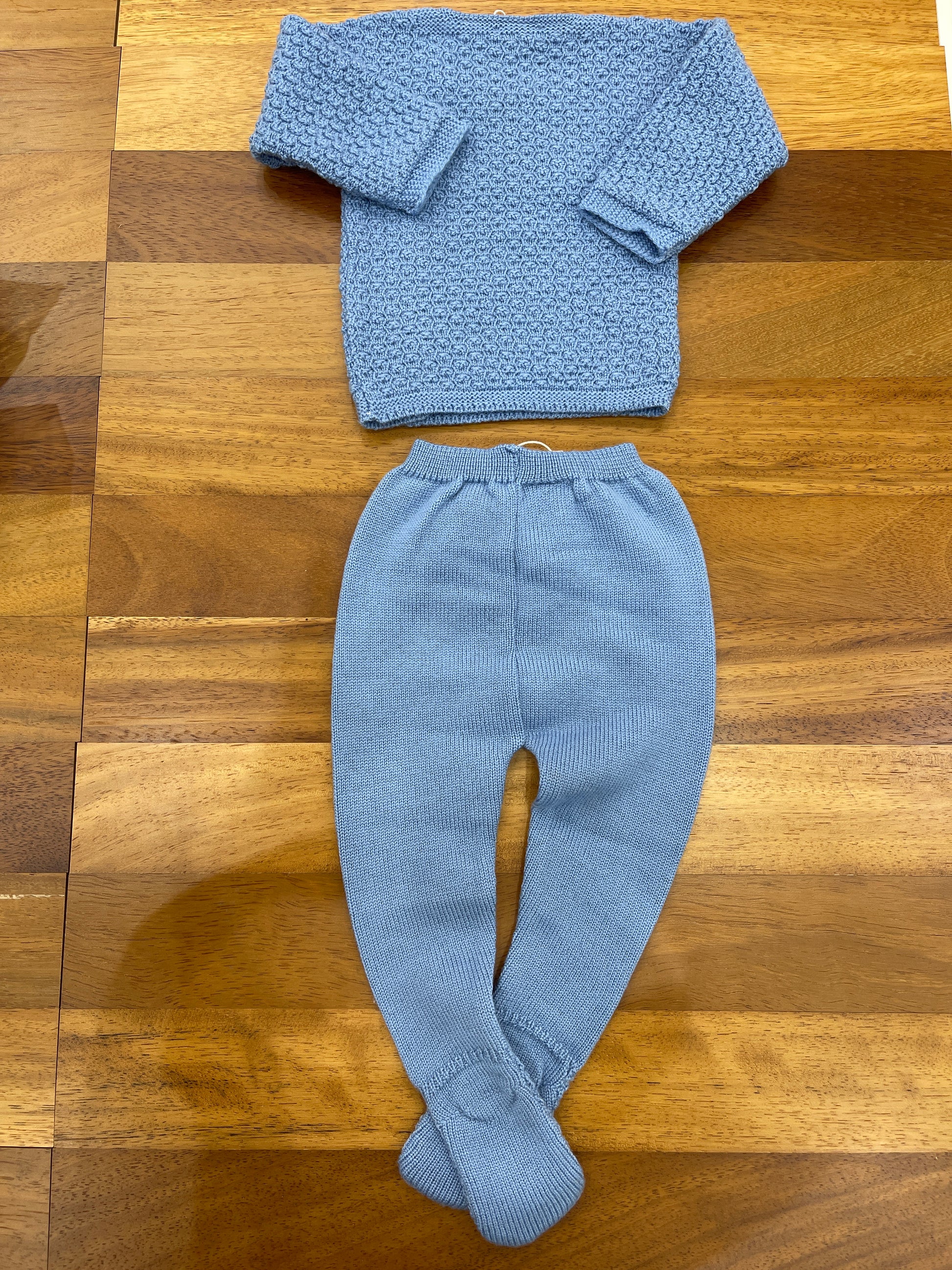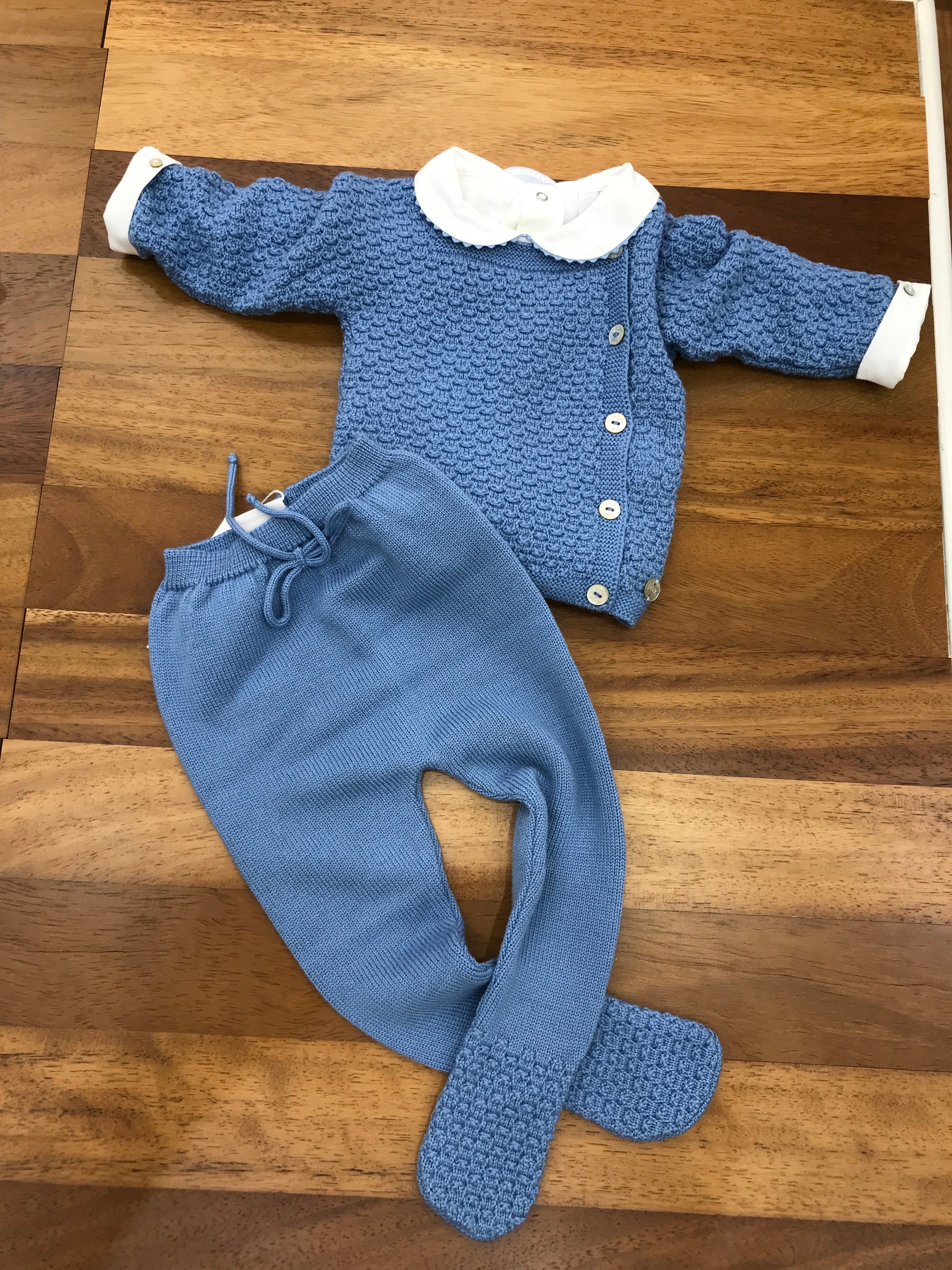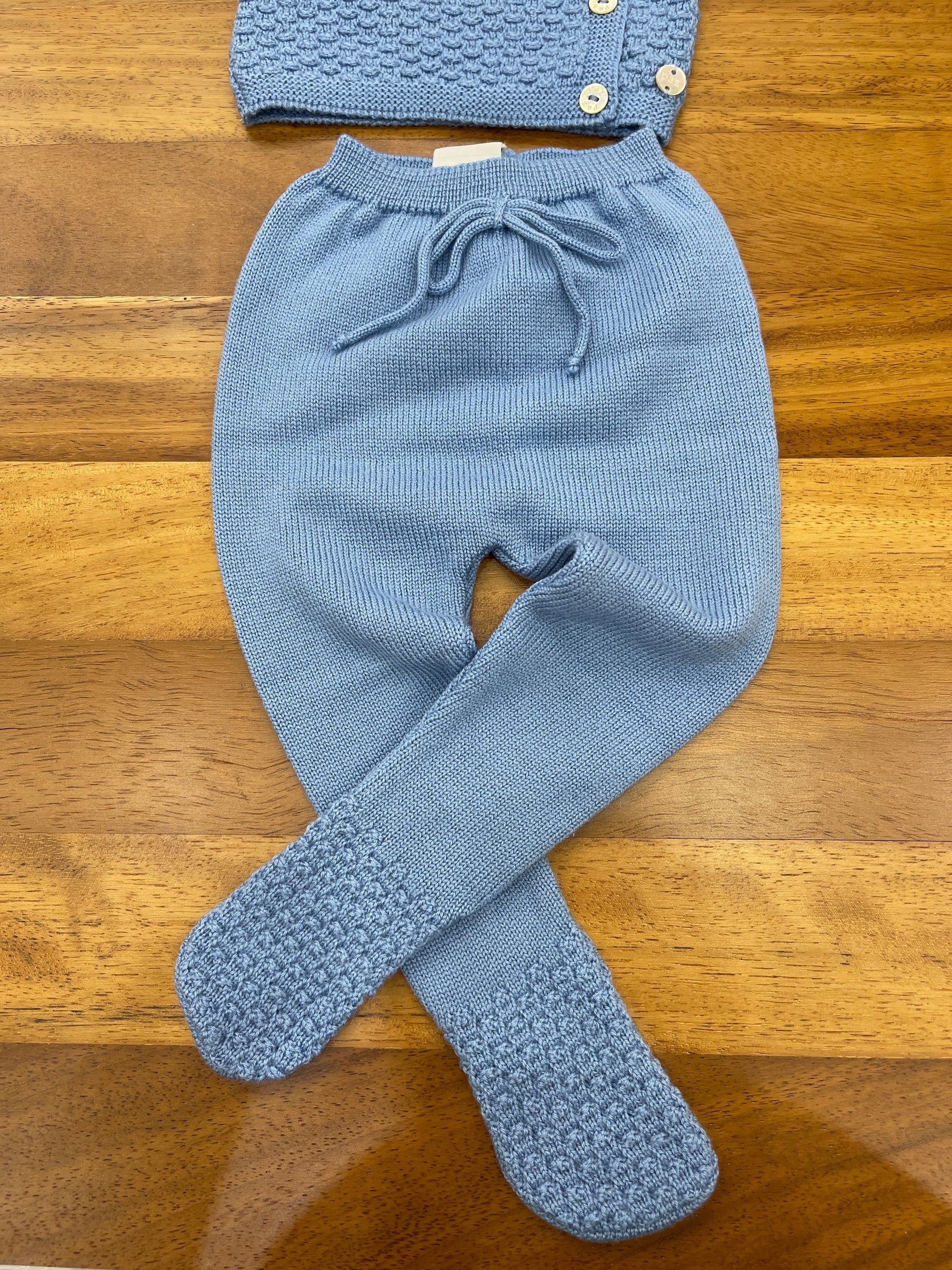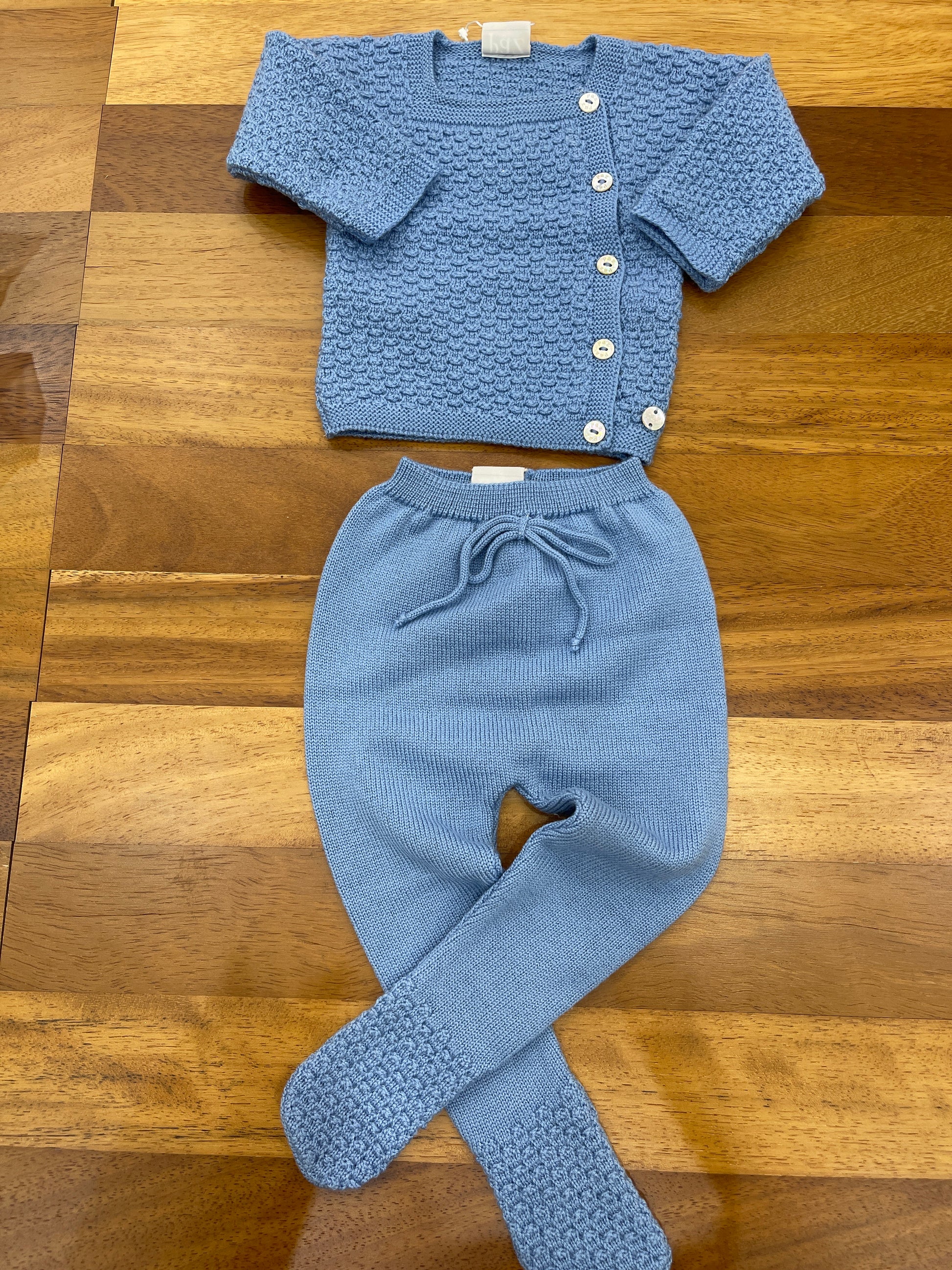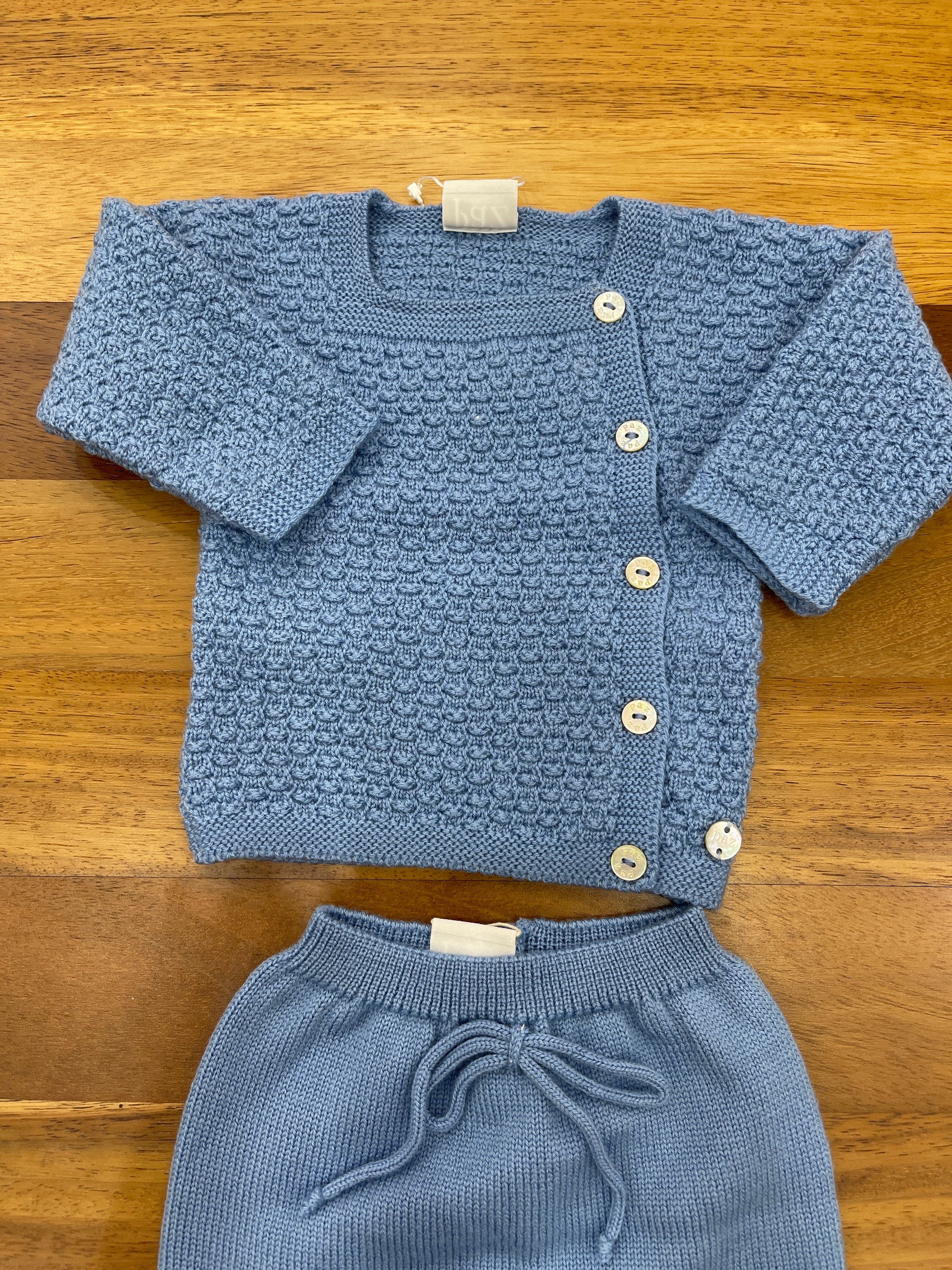Completo in lana composto da due pezzi: una maglietta con abbottonatura laterale frontale e un pantaloncino con pedini, arricchito da un elegante fiocchetto sul davanti.