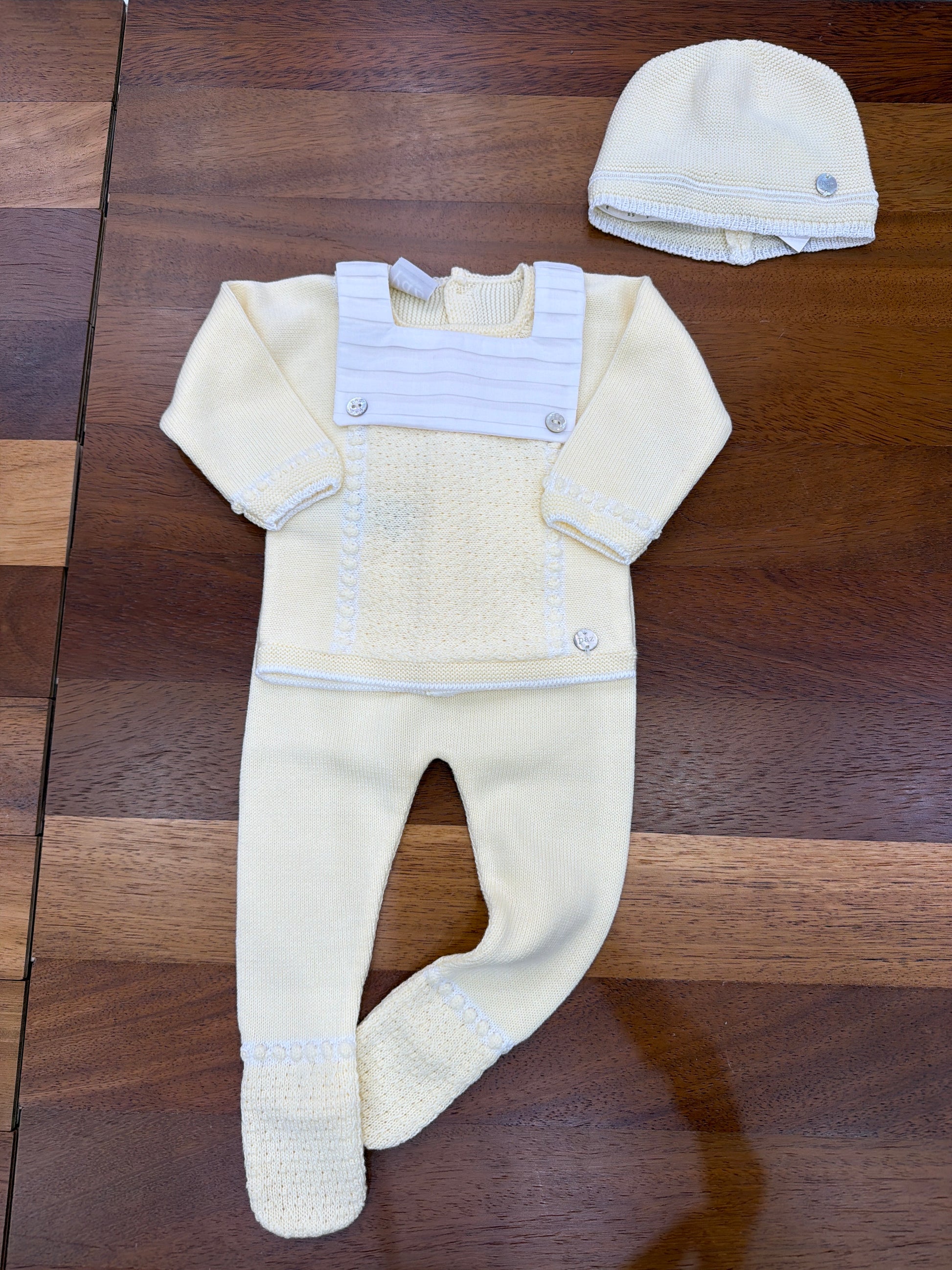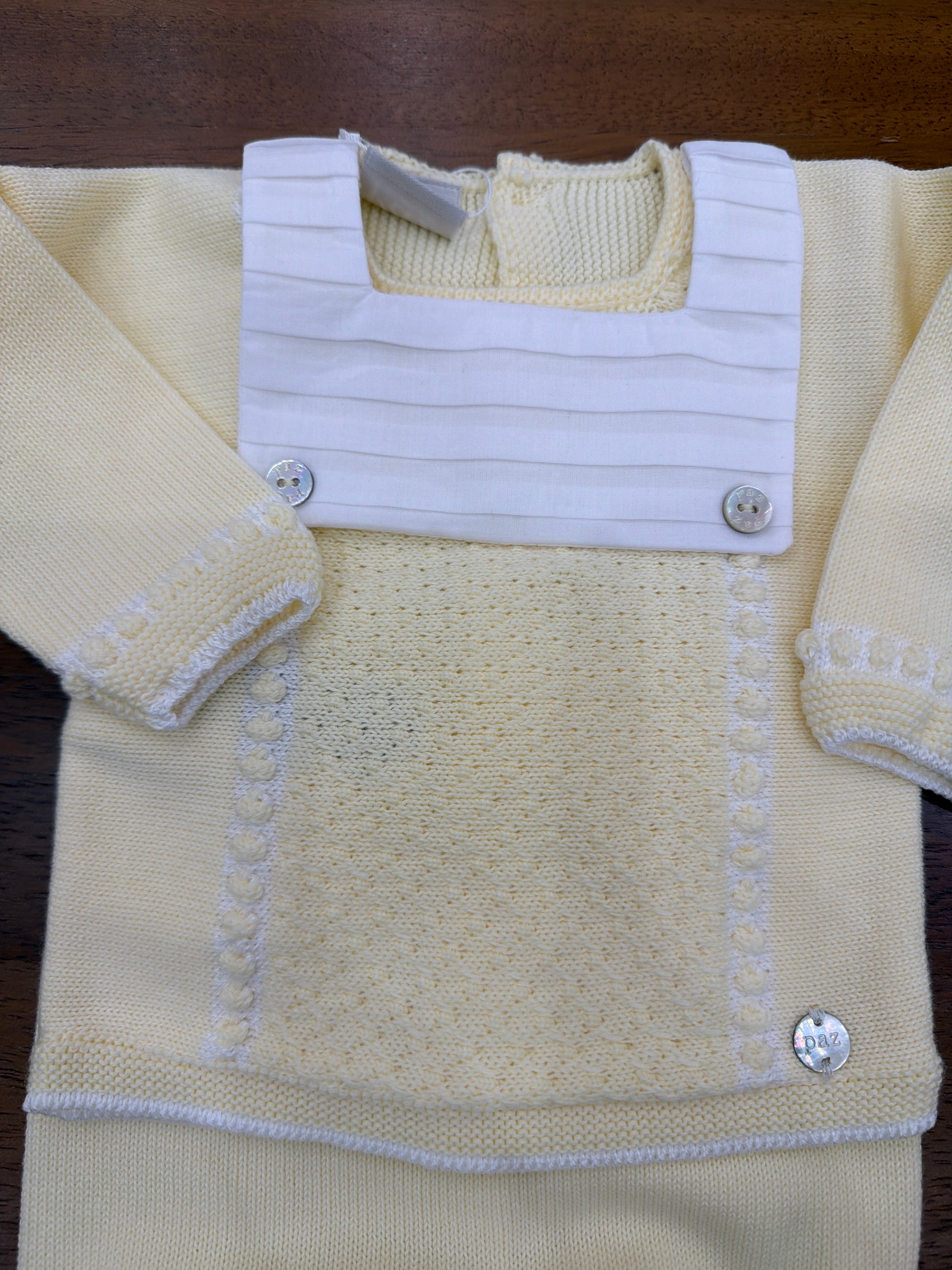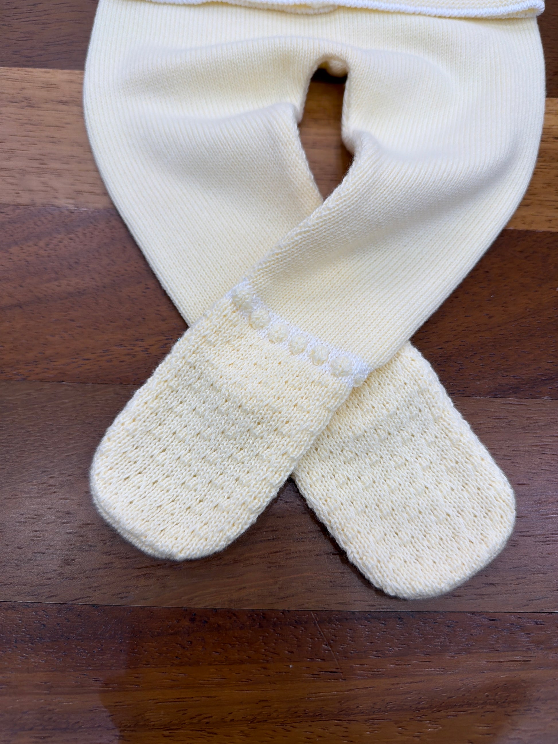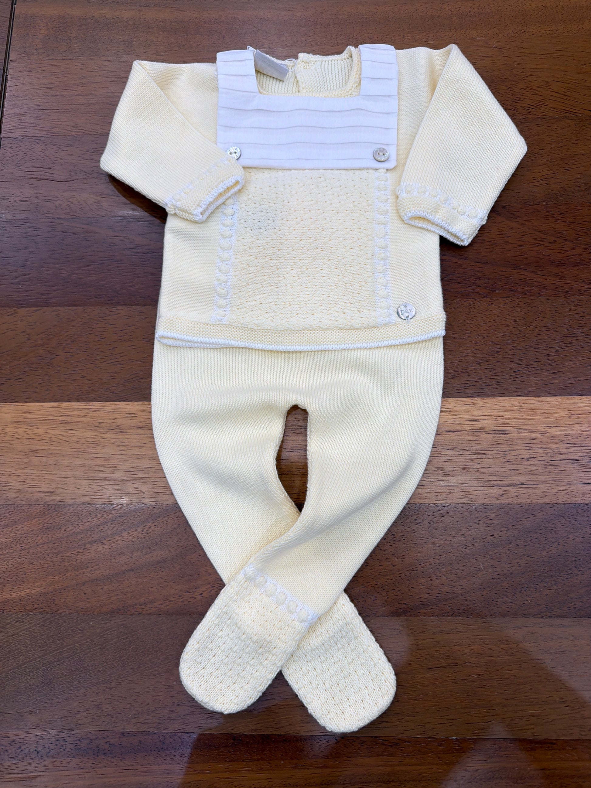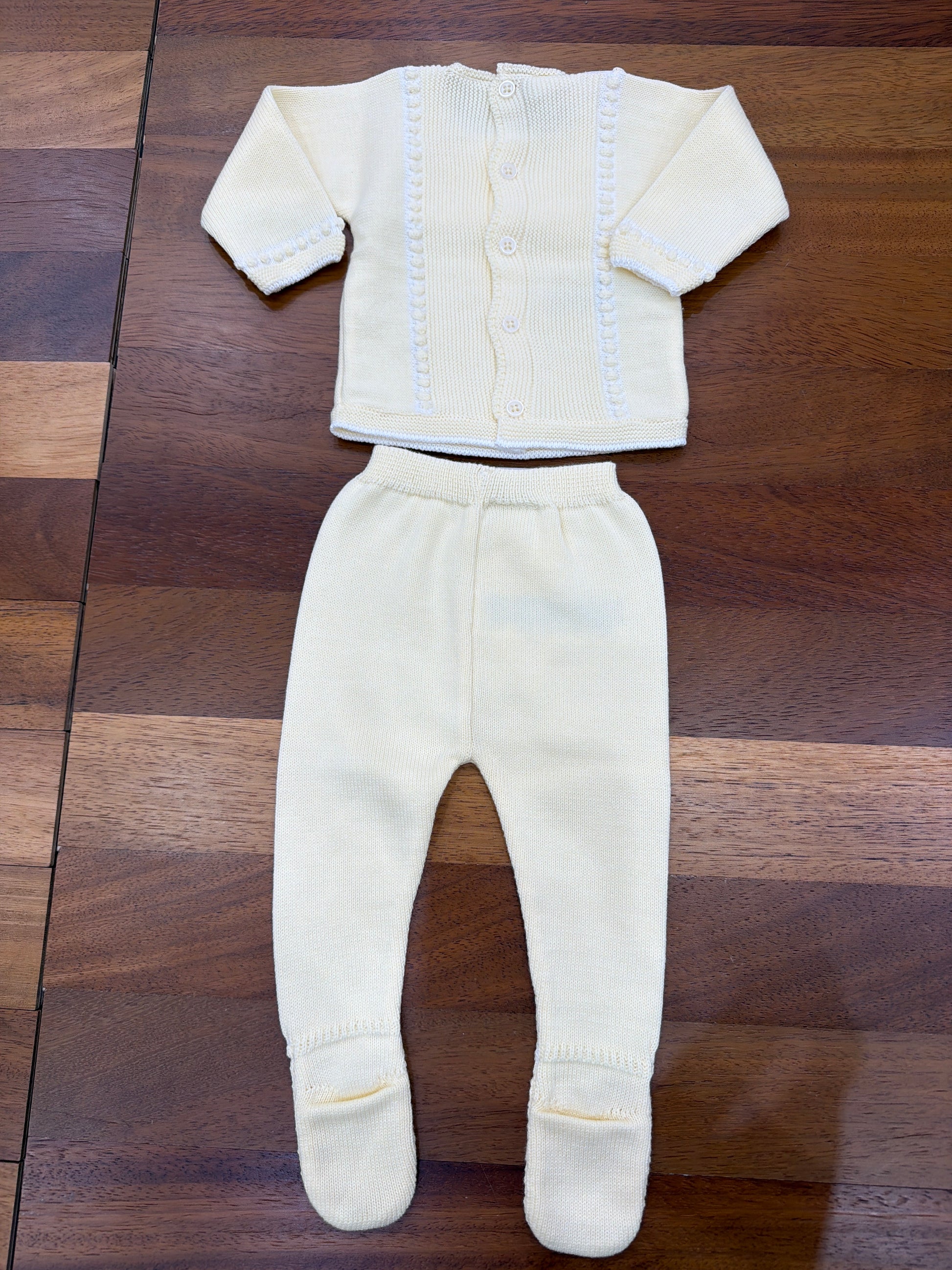Elegante completo bicolore realizzato in filato pregiato nelle sfumature del giallo tenue. La composizione include pantaloni con orli rifiniti e una maglietta caratterizzata da un dettaglio bavaglino decorativo. Un'opzione versatile e raffinata per il guardaroba della piccola.