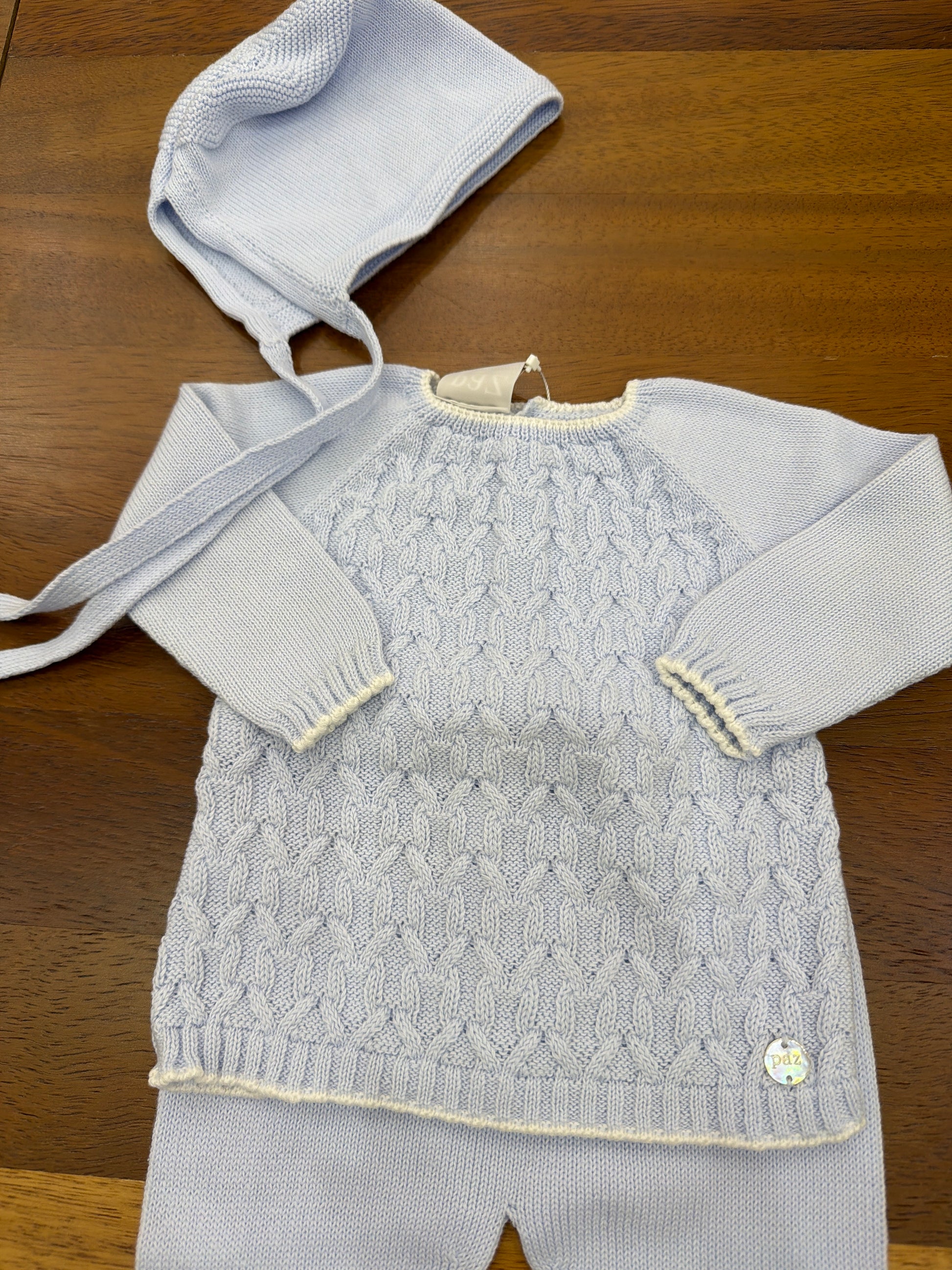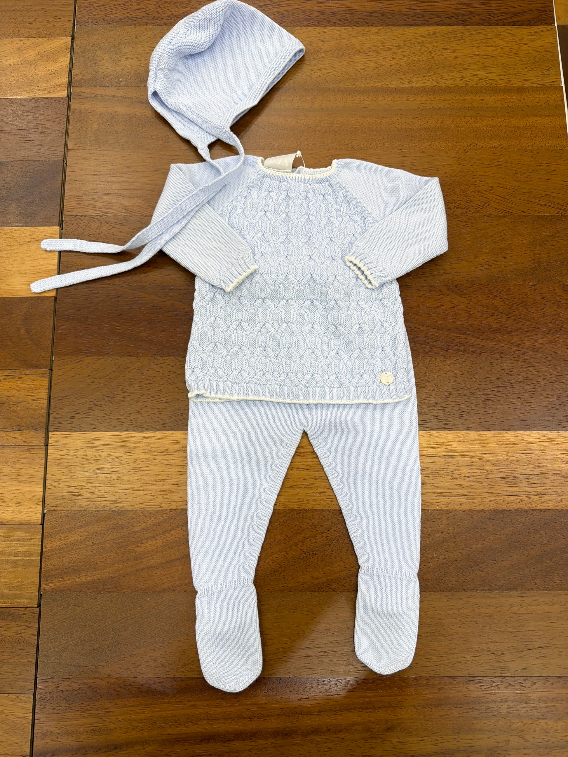 Elegante ensemble composto da tre elementi coordinati: pantaloni in filo con piedini integrati, maglietta con ricami raffinati e cuffietta abbinata. Un set completo pensato per garantire comfort e stile, ideale per le occasioni speciali dei più piccoli.