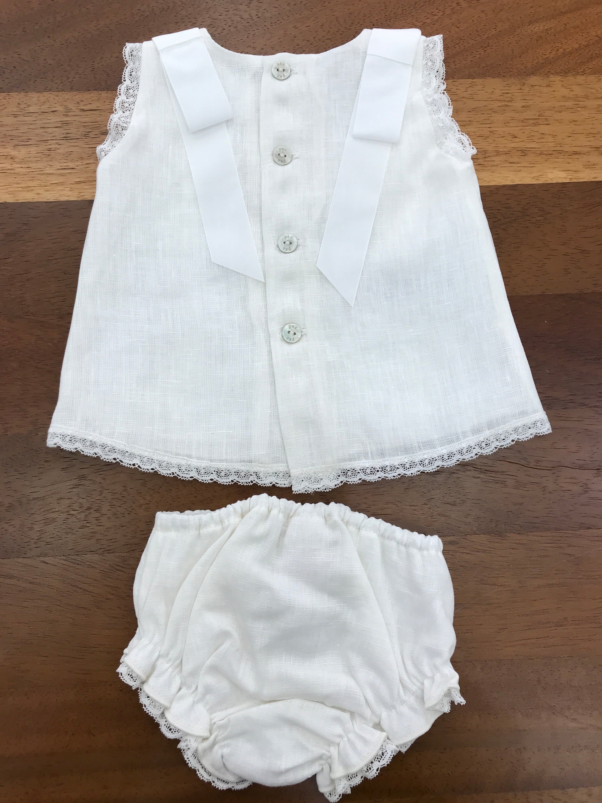 Completo Paz Rodriguez in lino bianco con fiocchi sulle spalle con merletto con fiori ricamati sul davanti con culotte e cuffia abbinata