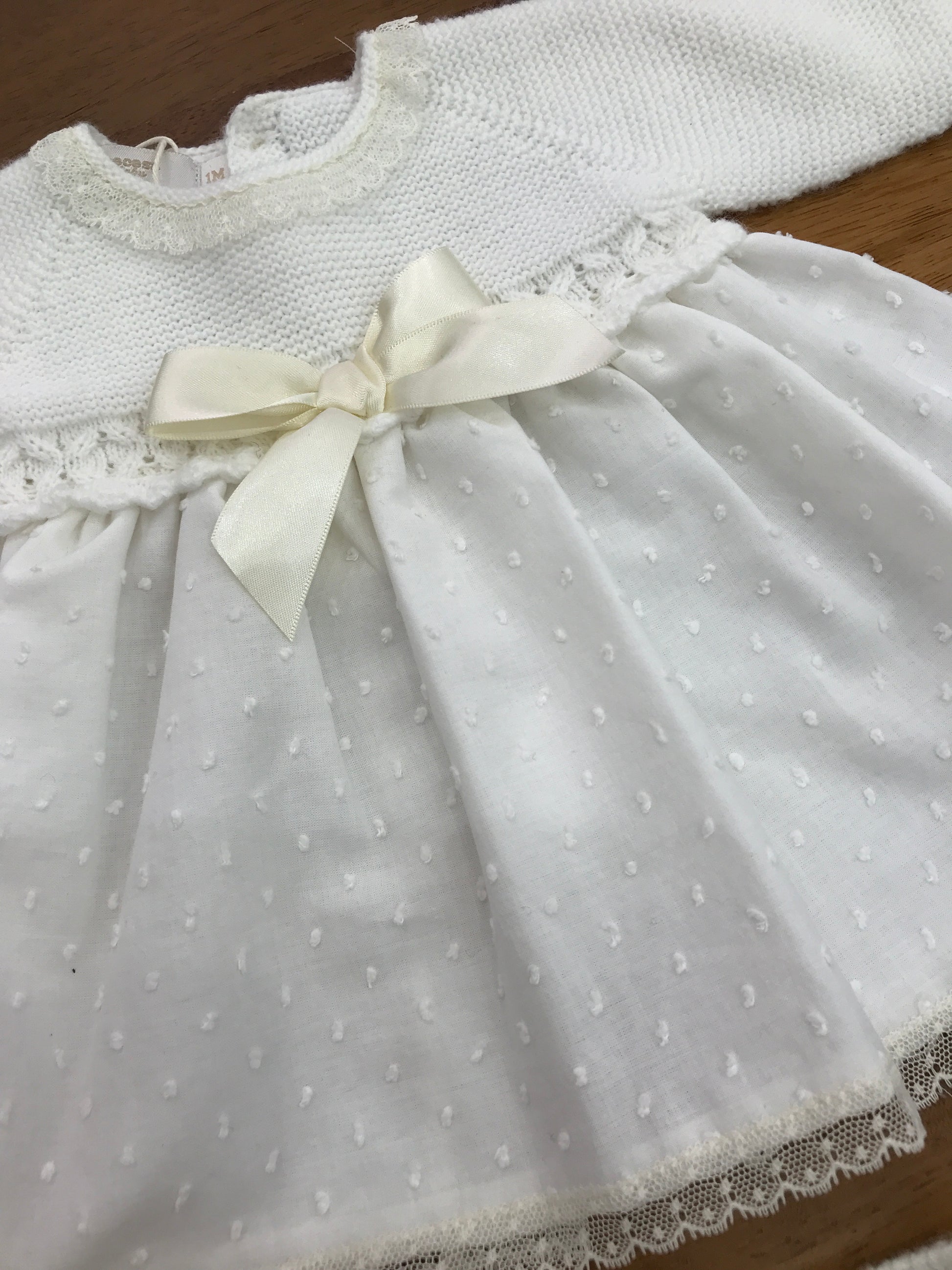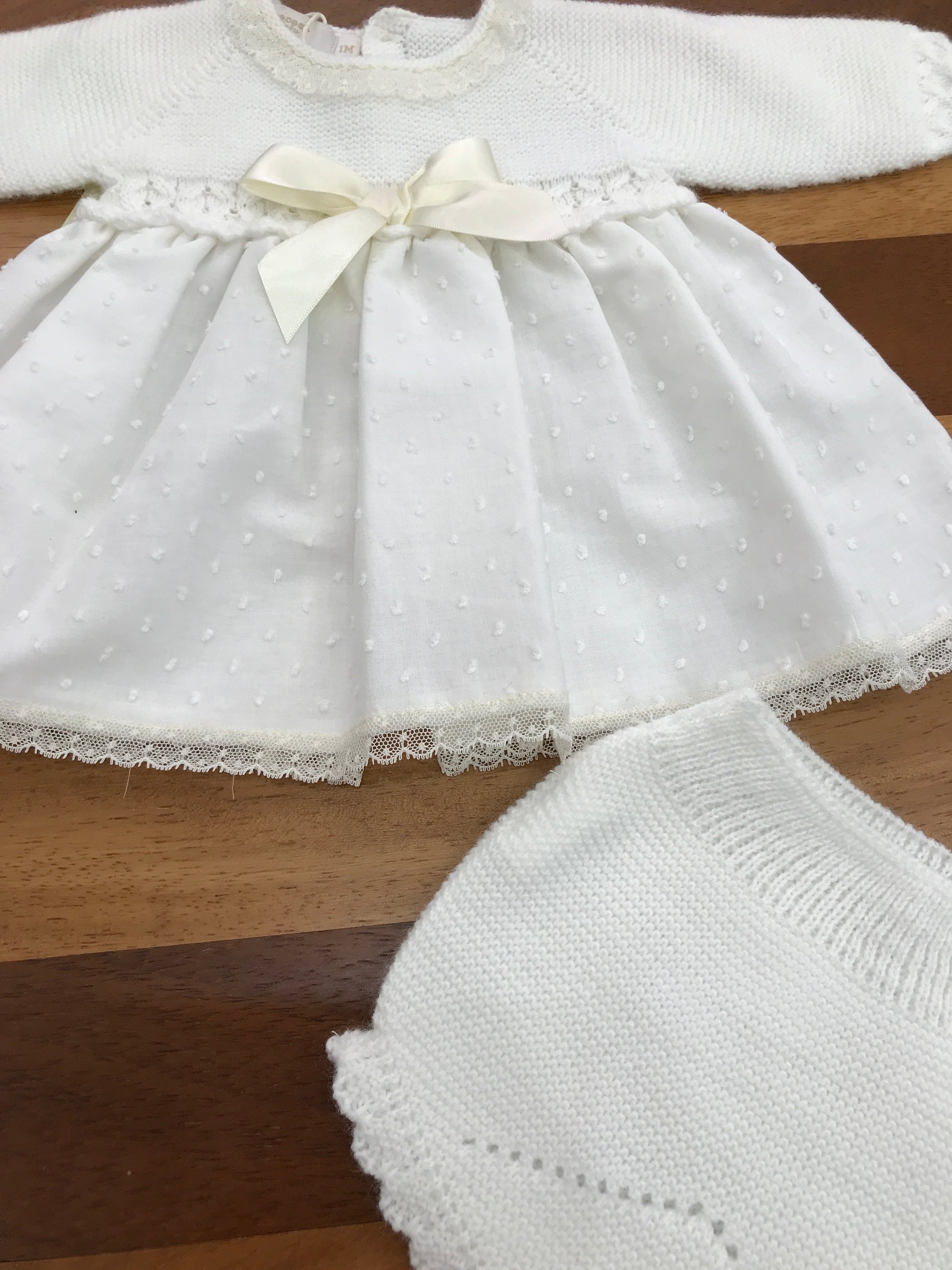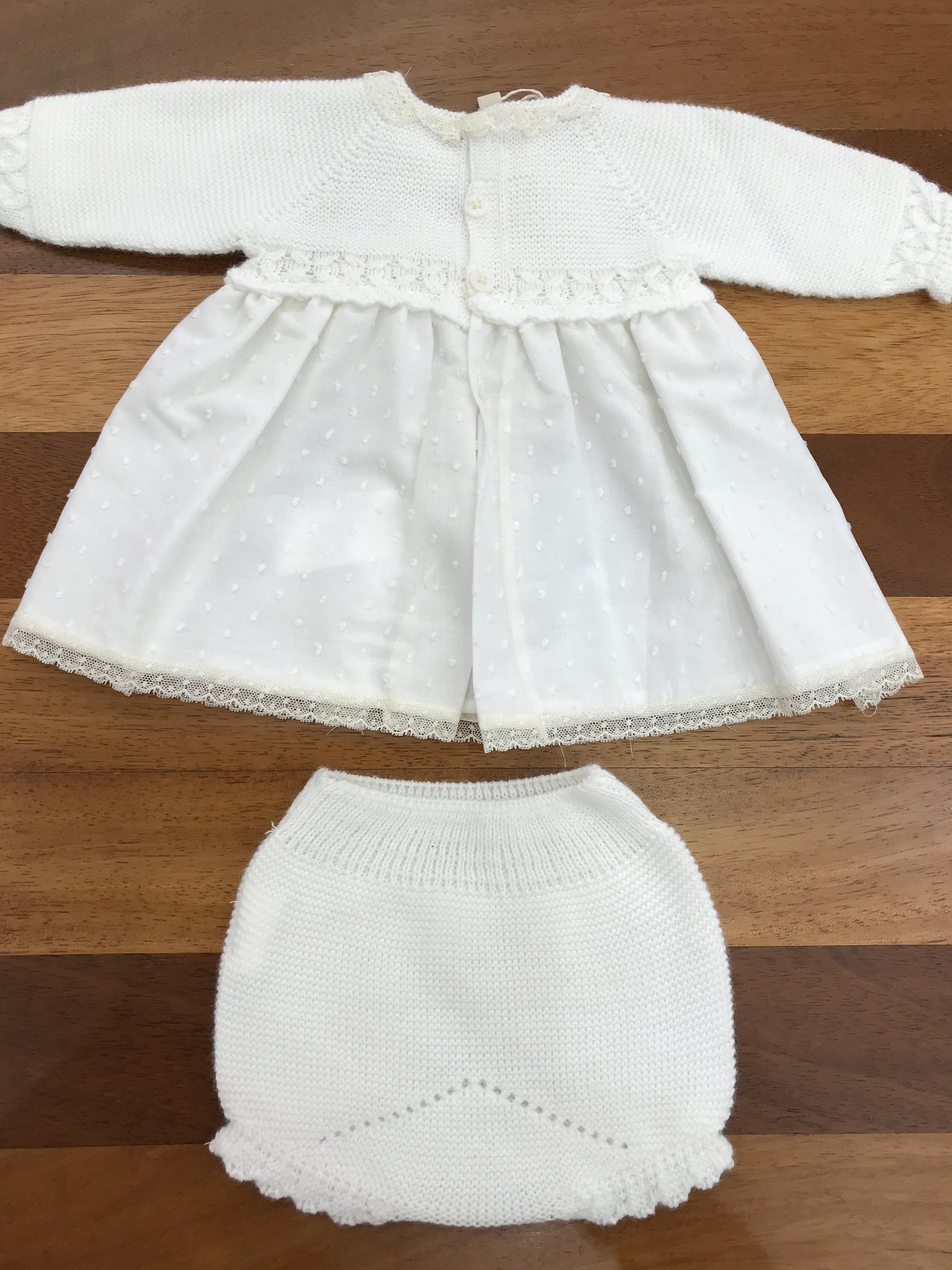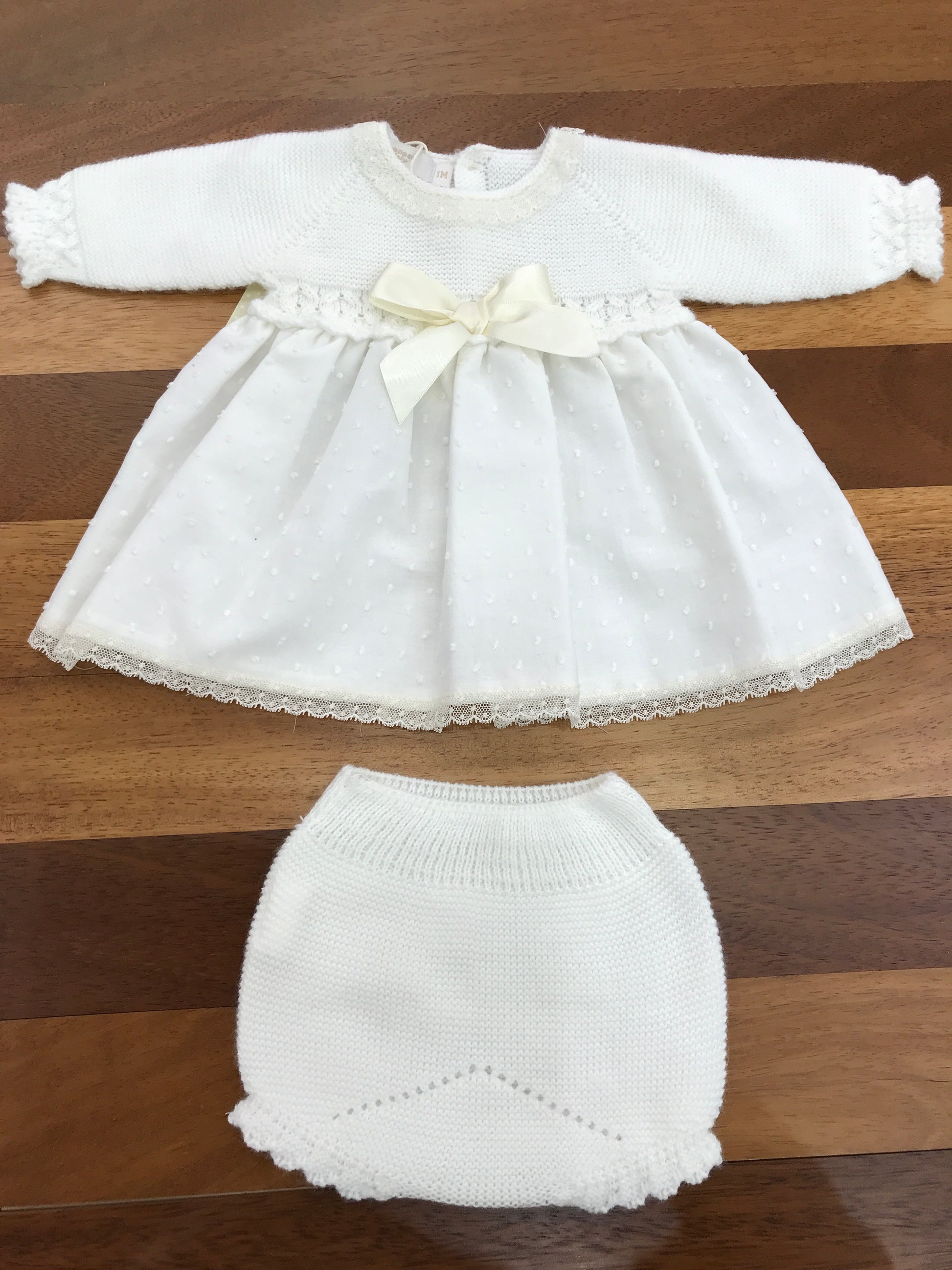 Elegante completino in acrilico caratterizzato da un corpetto strutturato e un fiocchetto centrale decorativo. La silhouette scende morbidamente trasformandosi in un abitino con culotte coordinata, creando un look raffinato e versatile per occasioni speciali.