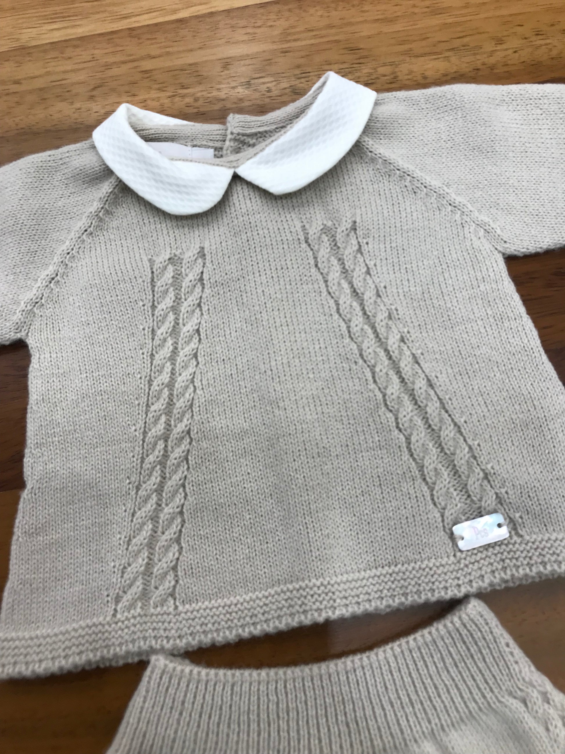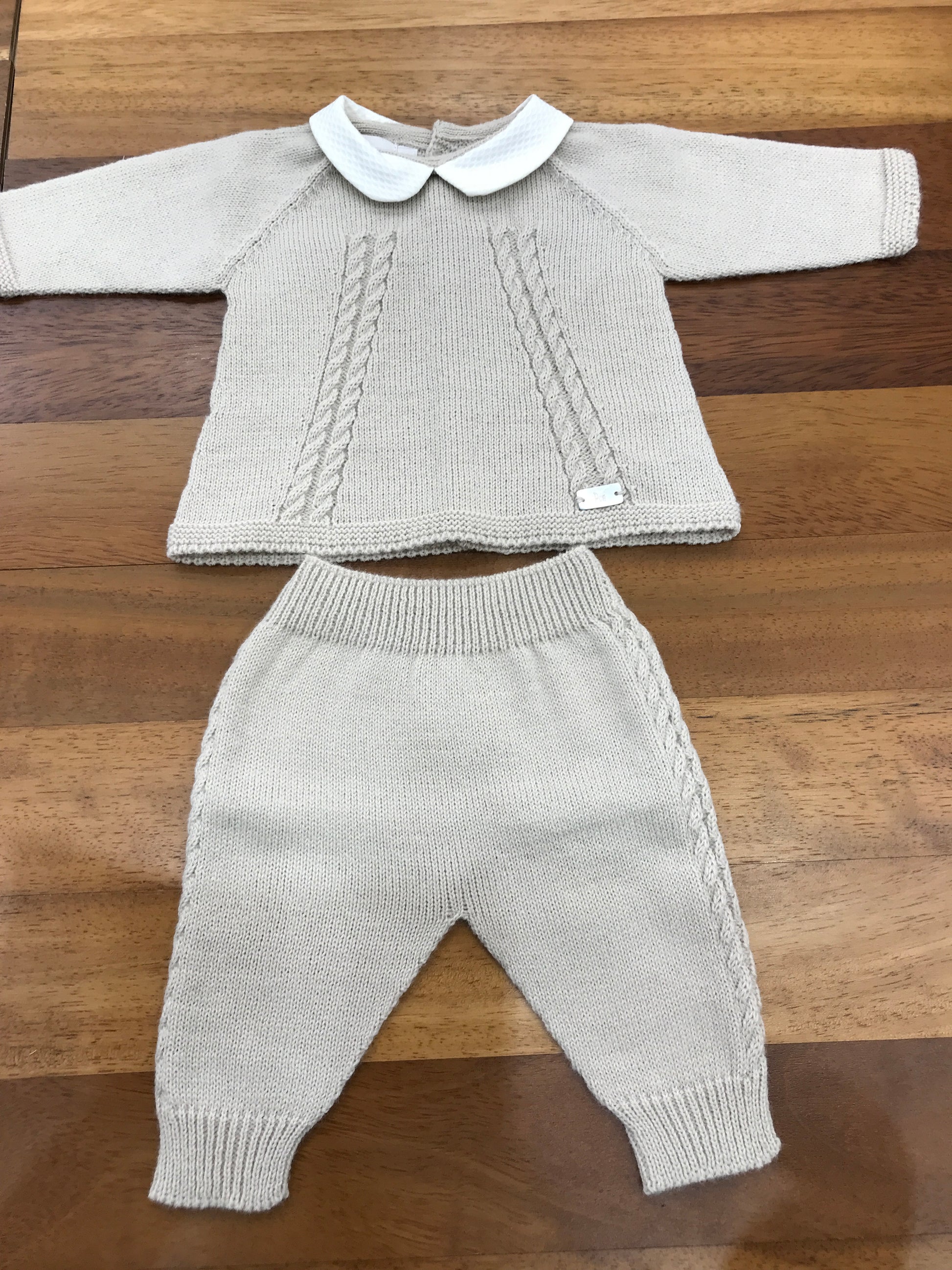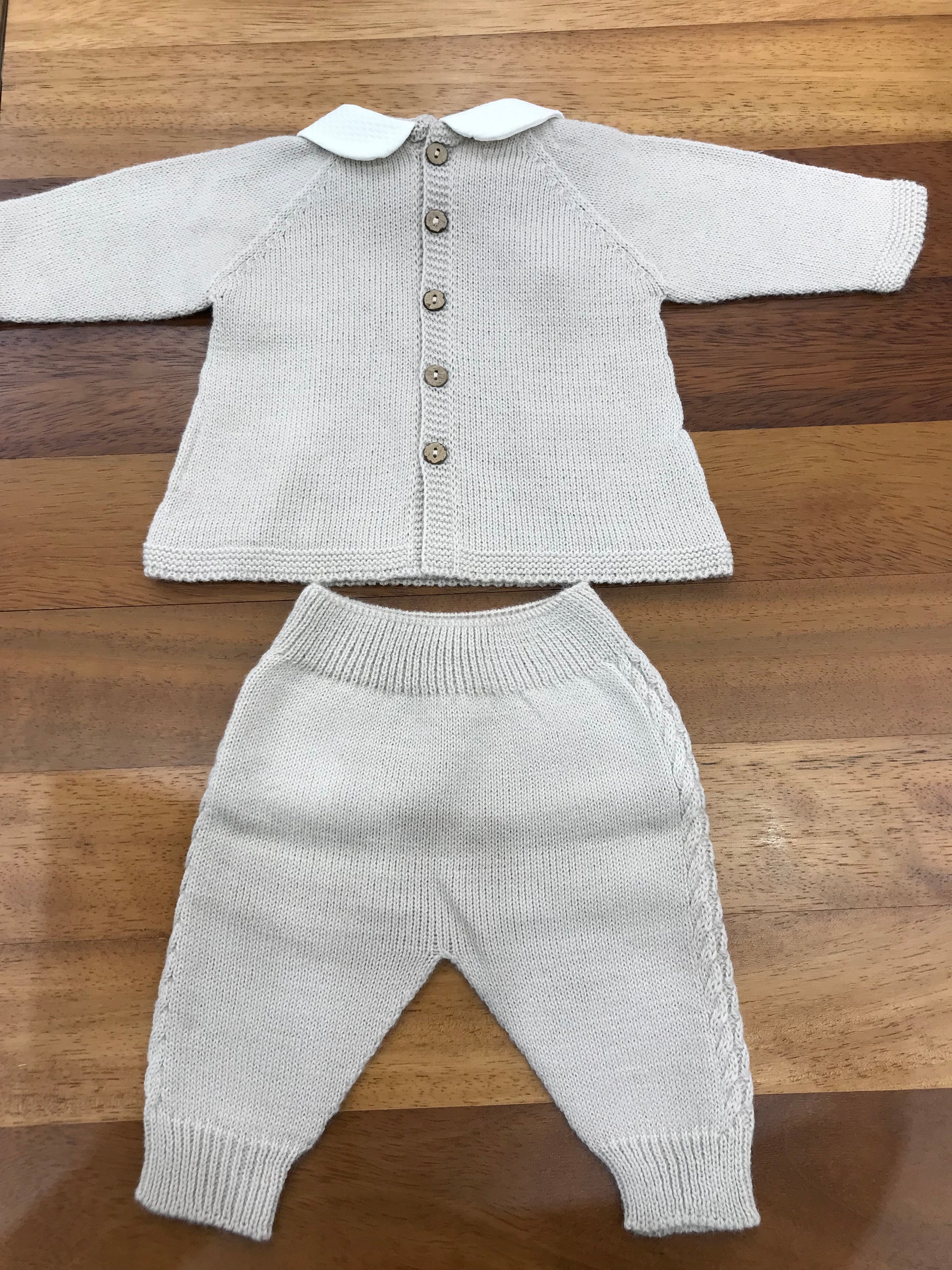 Completo baby composto da due pezzi, con pantalone senza piedini che presenta una raffinata lavorazione a trecce lungo il lato. La parte superiore è caratterizzata da un colletto bianco elegante e da una lavorazione a trecce che aggiunge un tocco di delicatezza e stile, rendendo l’insieme perfetto per i più piccoli con un design sofisticato e confortevole.