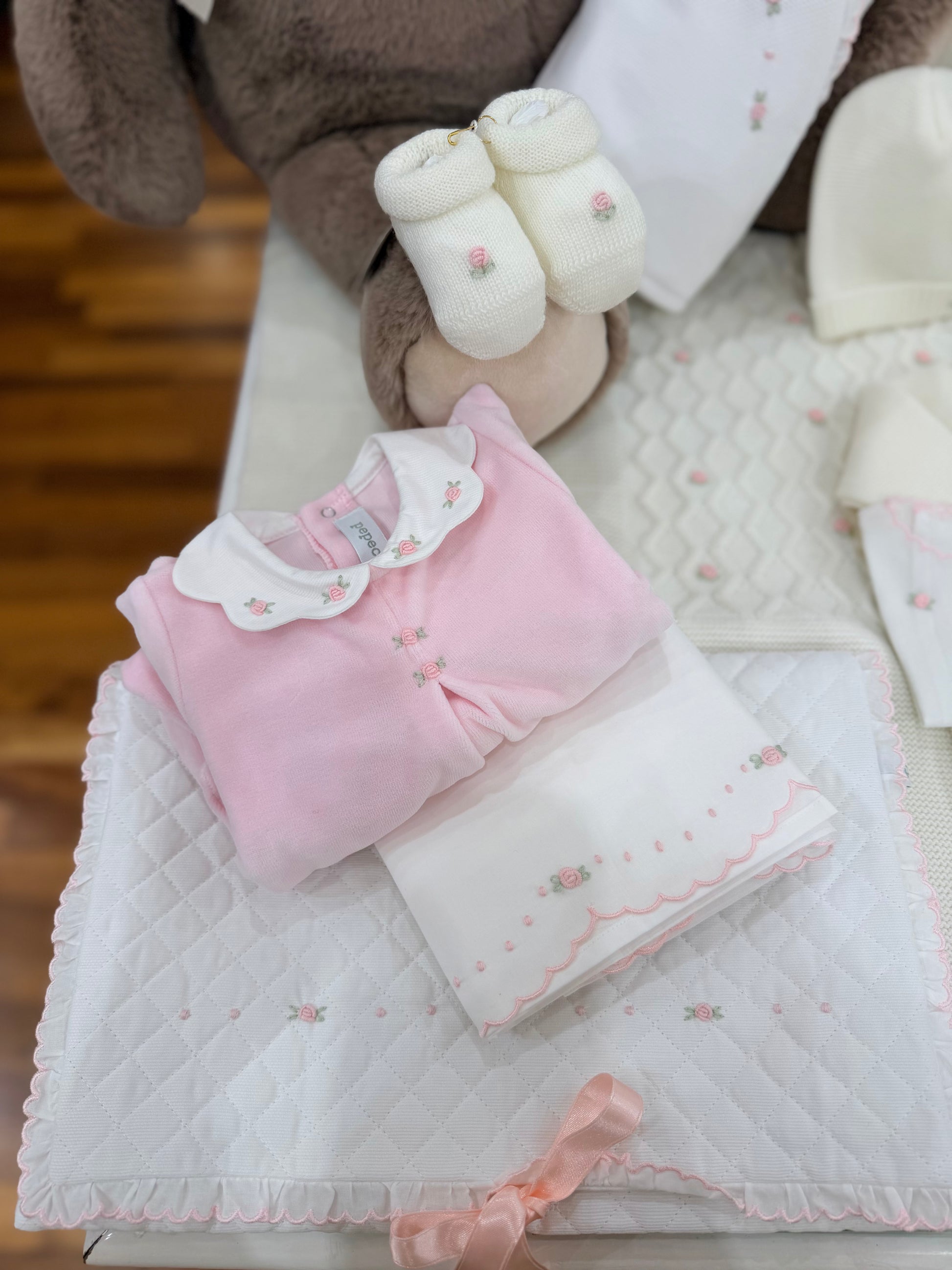 Set completo nascita pensato per accogliere il neonato con tutto ciò che serve nei primi giorni. Include coperta avvolgente, tutina comoda, cappellino e babbucce coordinate, camicino della fortuna, busta cambio pratica, bavetto assorbente, telo bagnetto morbido e lenzuolino. Una soluzione completa e coordinata che riunisce gli elementi essenziali per la cura e il comfort del piccolo.