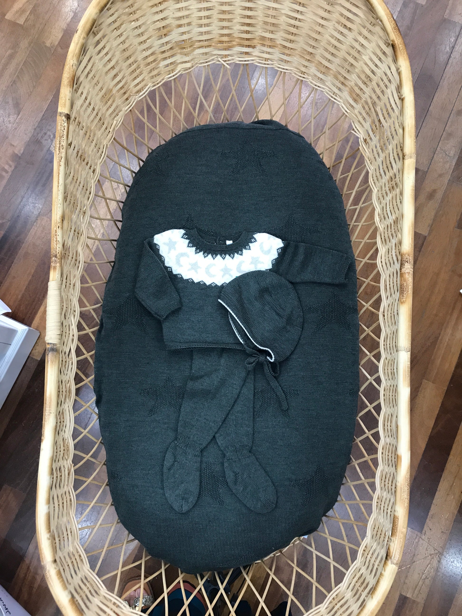 Il coordinato comprende una coperta, un completino due pezzi e una cuffietta, tutti in verde scuro. La maglietta del completino è decorata con stelle e luna, i pantaloni sono dotati di piedini integrati, mentre la cuffietta presenta una chiusura con fiocchetto e un bordo ricamato in bianco.
