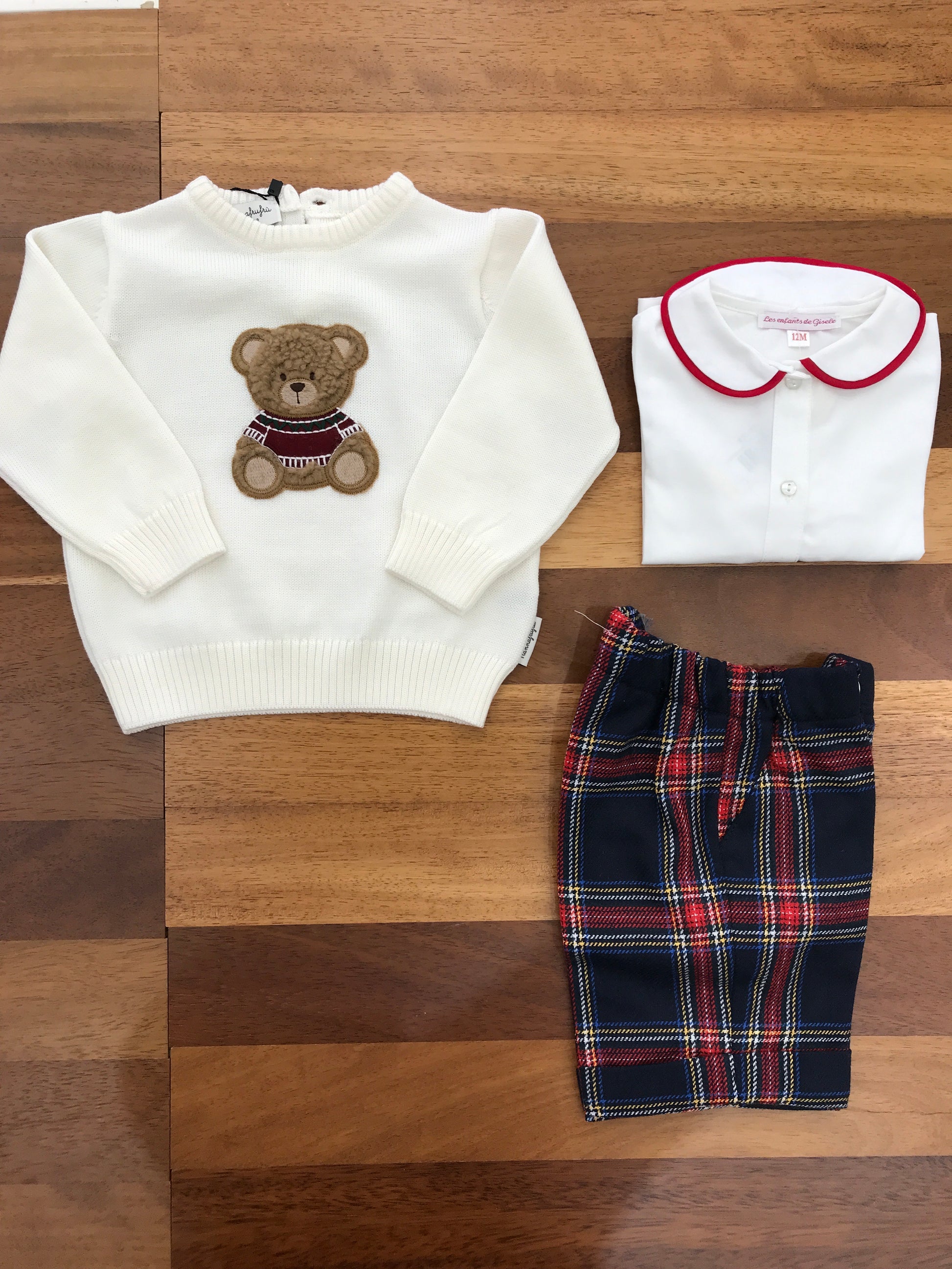 Elegante set natalizio composto da morbido maglione in tonalità avorio con adorabile applicazione di orsetto al centro, abbinato a bermuda a quadri scozzesi e camicia bianca con colletto rifinito in rosso. Un coordinato raffinato e versatile, perfetto per le festività.
