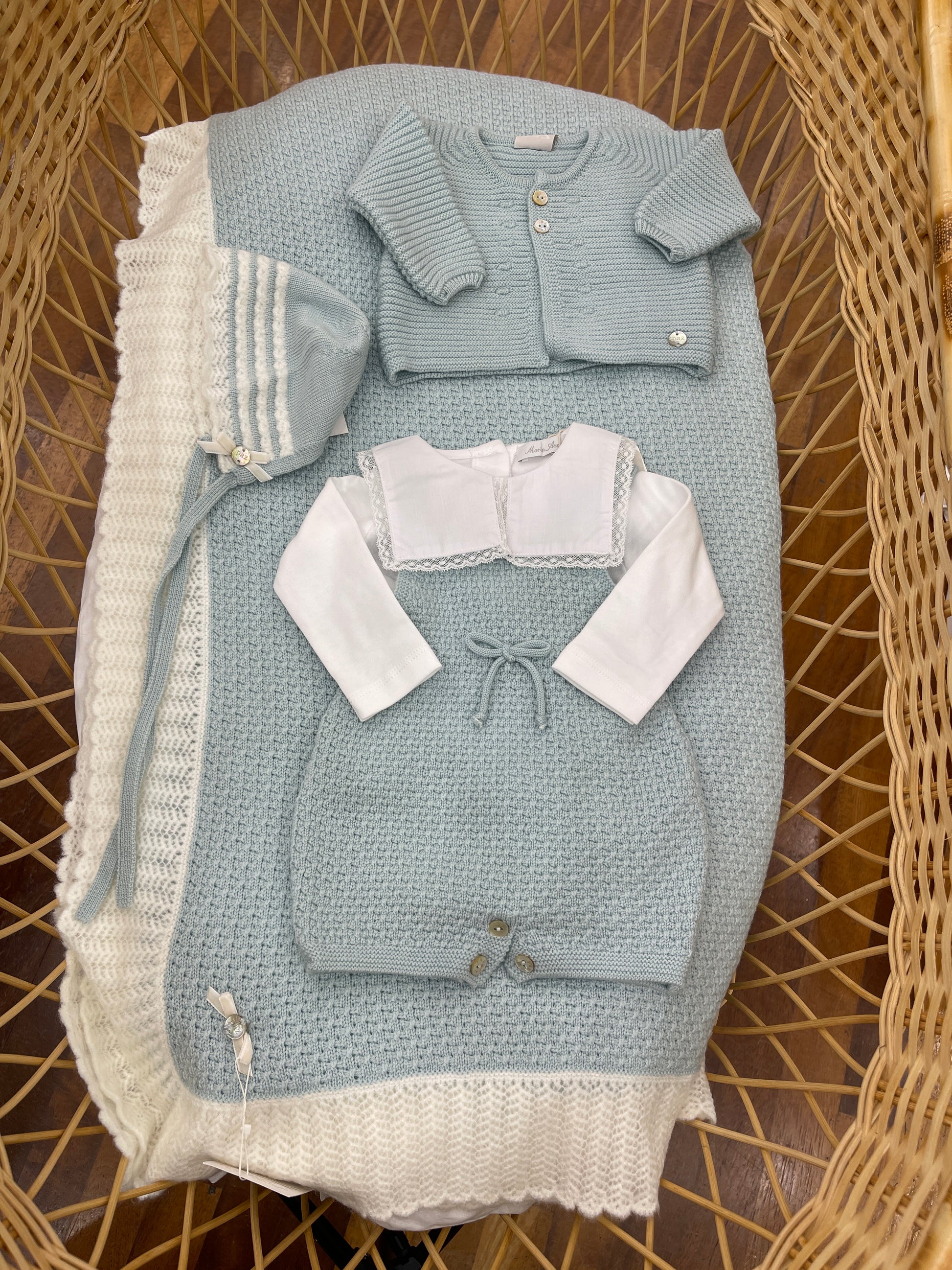 Questo coordinato in lana comprende una coperta, un pagliaccetto, un cardigan, un body e una cuffietta. La coperta è rifinita con un bordo bianco, mentre il pagliaccetto corto è decorato con un fiocchetto tono su tono al centro. Il body bianco presenta un bavettone con merletto, il cardigan essenziale si chiude con piccoli bottoncini, e la cuffietta è impreziosita da ricami bianchi.