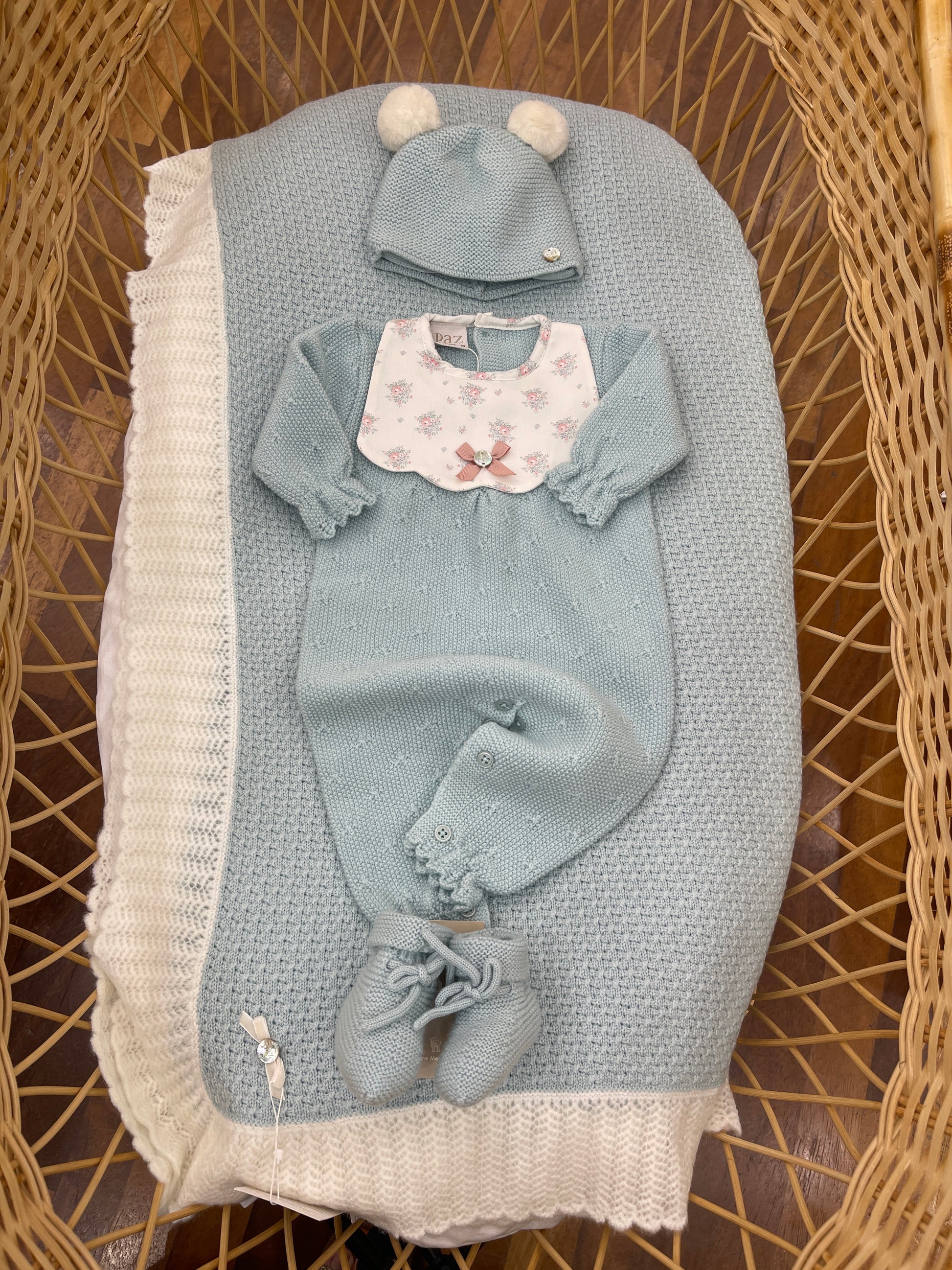 Il coordinato include una coperta con bordo bianco, una tutina completa decorata con un bavettone a fiorellini, un cappellino arricchito da pon pon bianchi e babbucce dal design semplice.