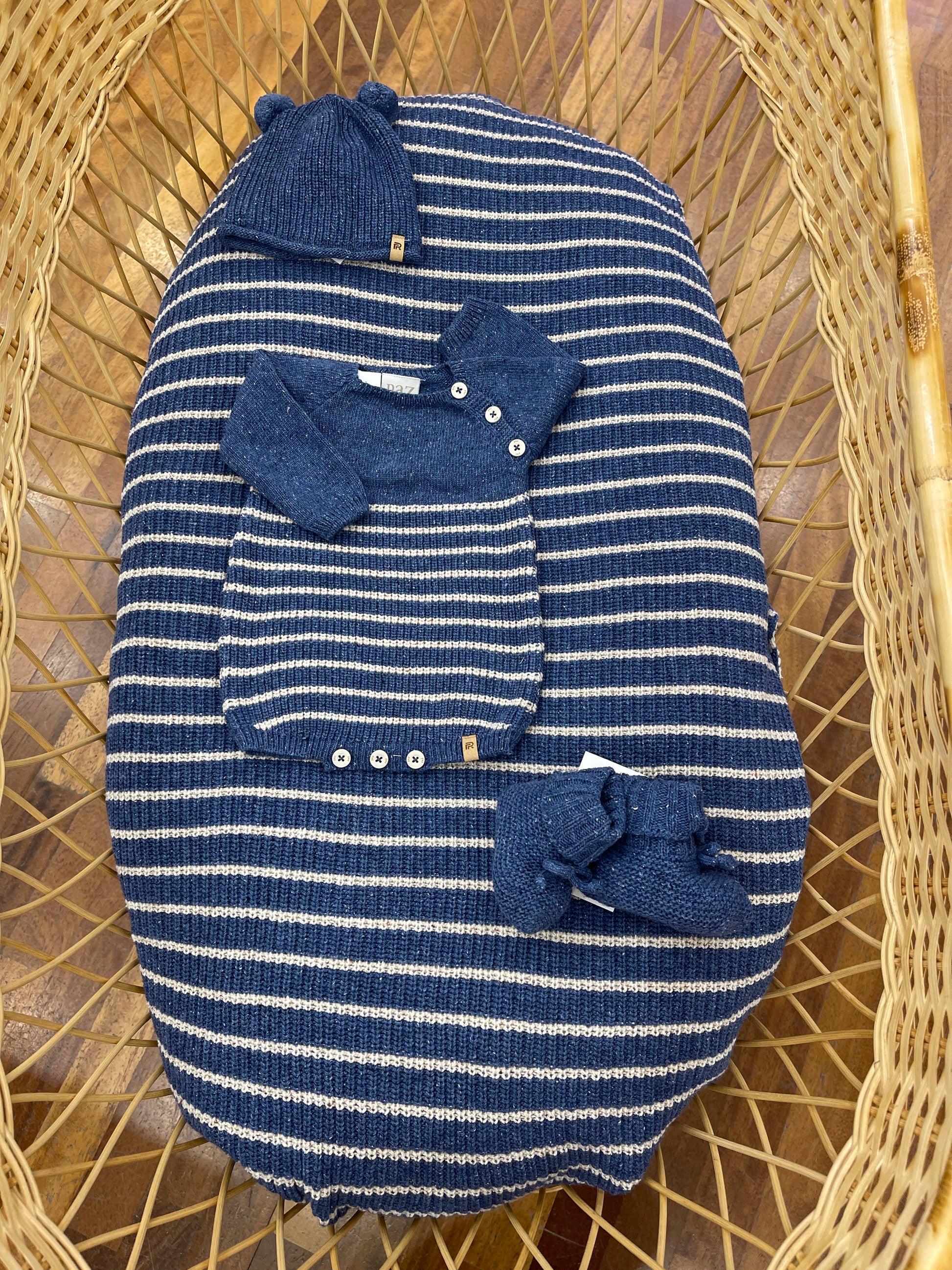 Il coordinato Paz Rodriguez include un porta coperta, un pagliaccetto , un cappellino e delle babbucce. Il cappellino è caratterizzato da due pon pon decorativi che aggiungono un tocco di originalità. Sia il pagliaccetto che la coperta presentano un elegante motivo a righe, conferendo un aspetto raffinato e coordinato. Le babbucce sono dotate di un pratico risvolto, pensato per garantire comfort e una vestibilità ottimale. Questo set è ideale per chi cerca un abbinamento funzionale e stiloso per i più piccoli.