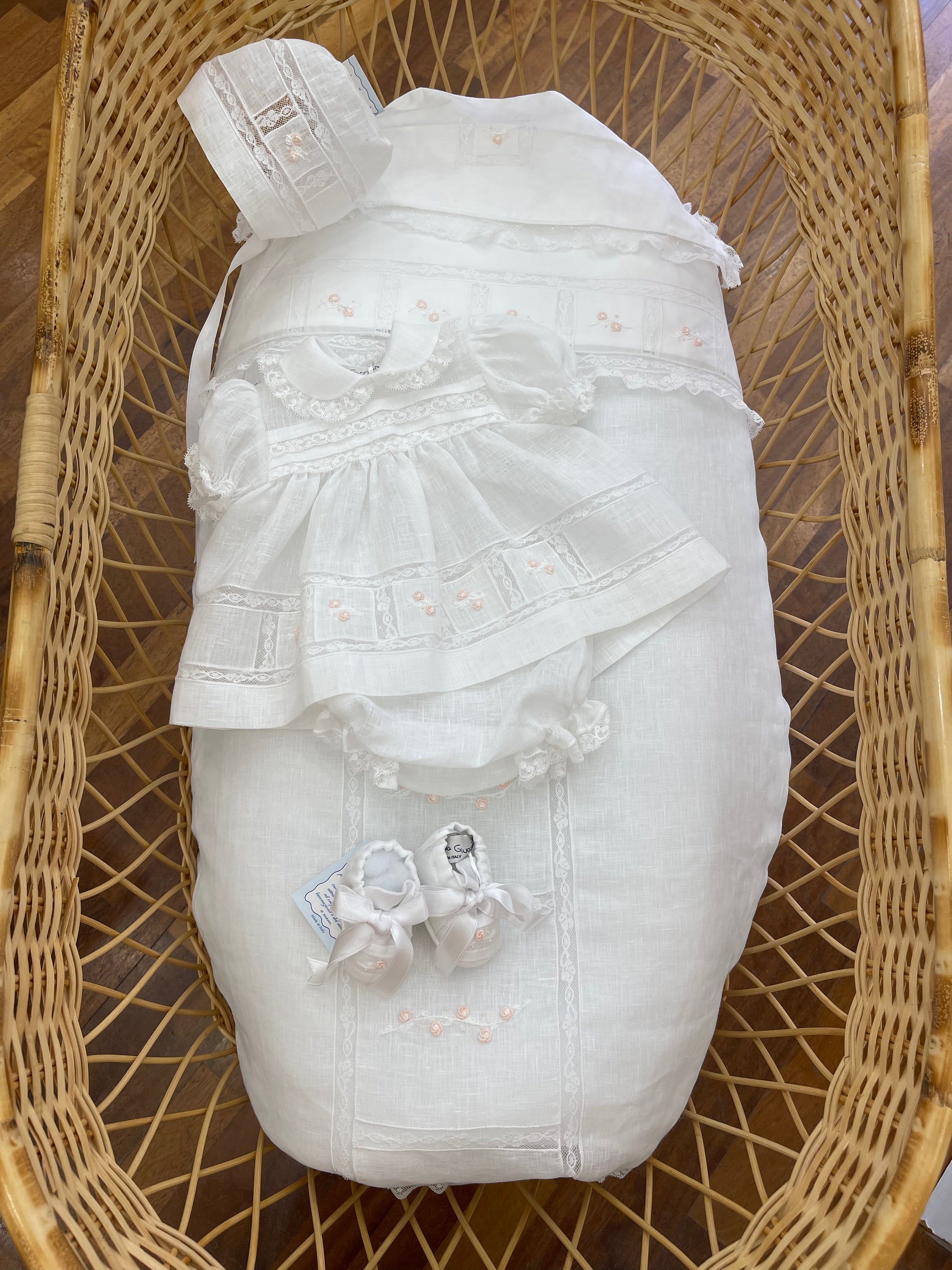 Il coordinato in lino di piccola giuggiola comprende un abitino con coulotte, entrambi arricchiti da delicati ricami e roselline, che conferiscono un tocco di eleganza e raffinatezza. La cuffietta e le scarpine, realizzate anch’esse in lino e decorate con ricami coordinati, completano l’insieme con cura artigianale. Il set include inoltre un lenzuolino in battista, impreziosito da ricami e roselline ricamate, che garantisce morbidezza e comfort. Infine, porta piumoncino con la stessa decorazione armoniosa assicura un coordinato completo e di alta qualità, ideale per chi cerca un prodotto raffinato e curato nei dettagli.