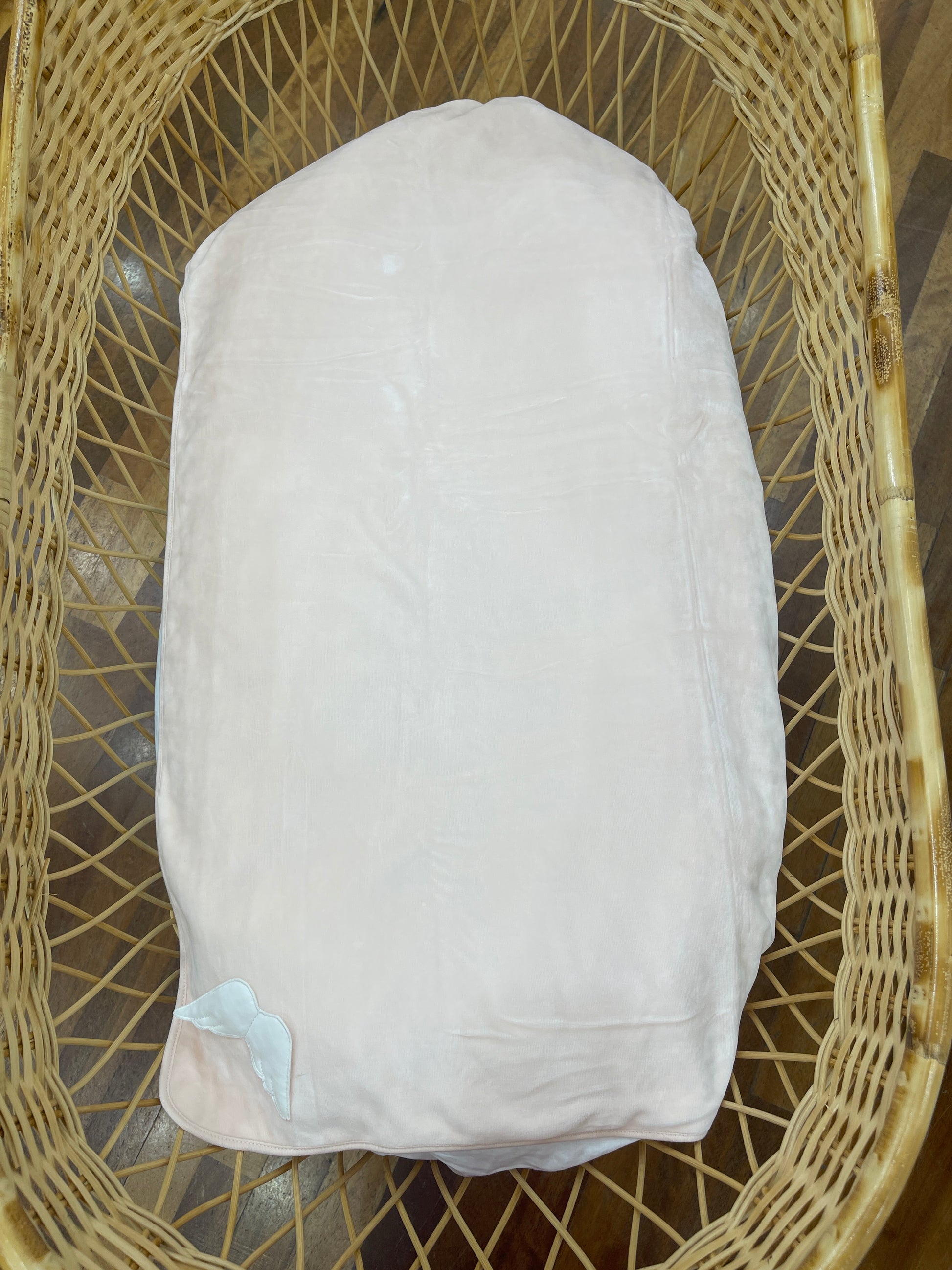 Coperta in ciniglia rosa arricchita da eleganti ali decorative bianche.