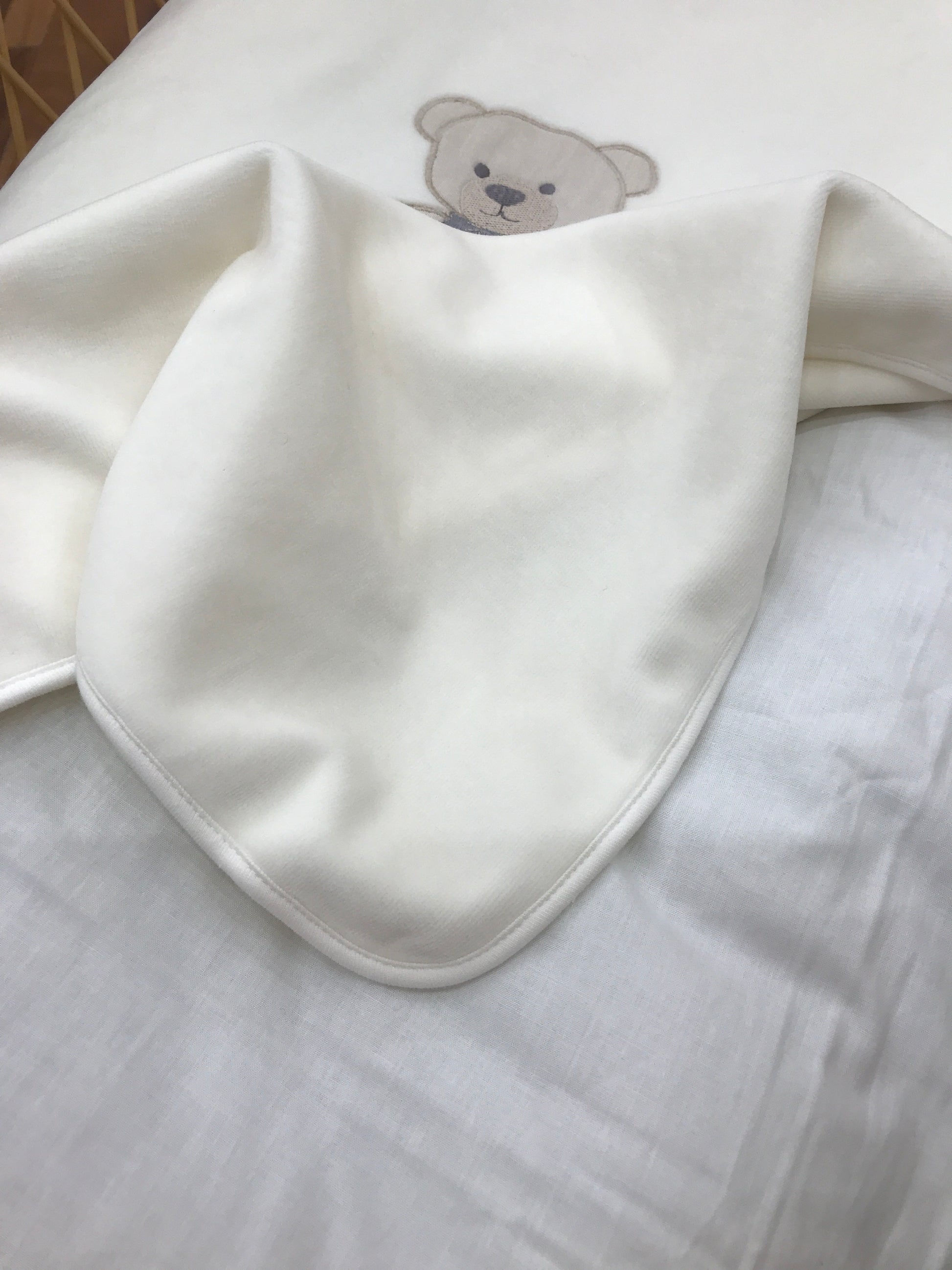 Questa coperta in ciniglia per neonati presenta un design sobrio e raffinato, realizzata in un bianco puro che ne esalta la delicatezza. Il dettaglio distintivo è la decorazione frontale a forma di orsetto, che aggiunge un tocco di dolcezza e originalità, rendendola ideale per avvolgere il bambino con morbidezza e stile.