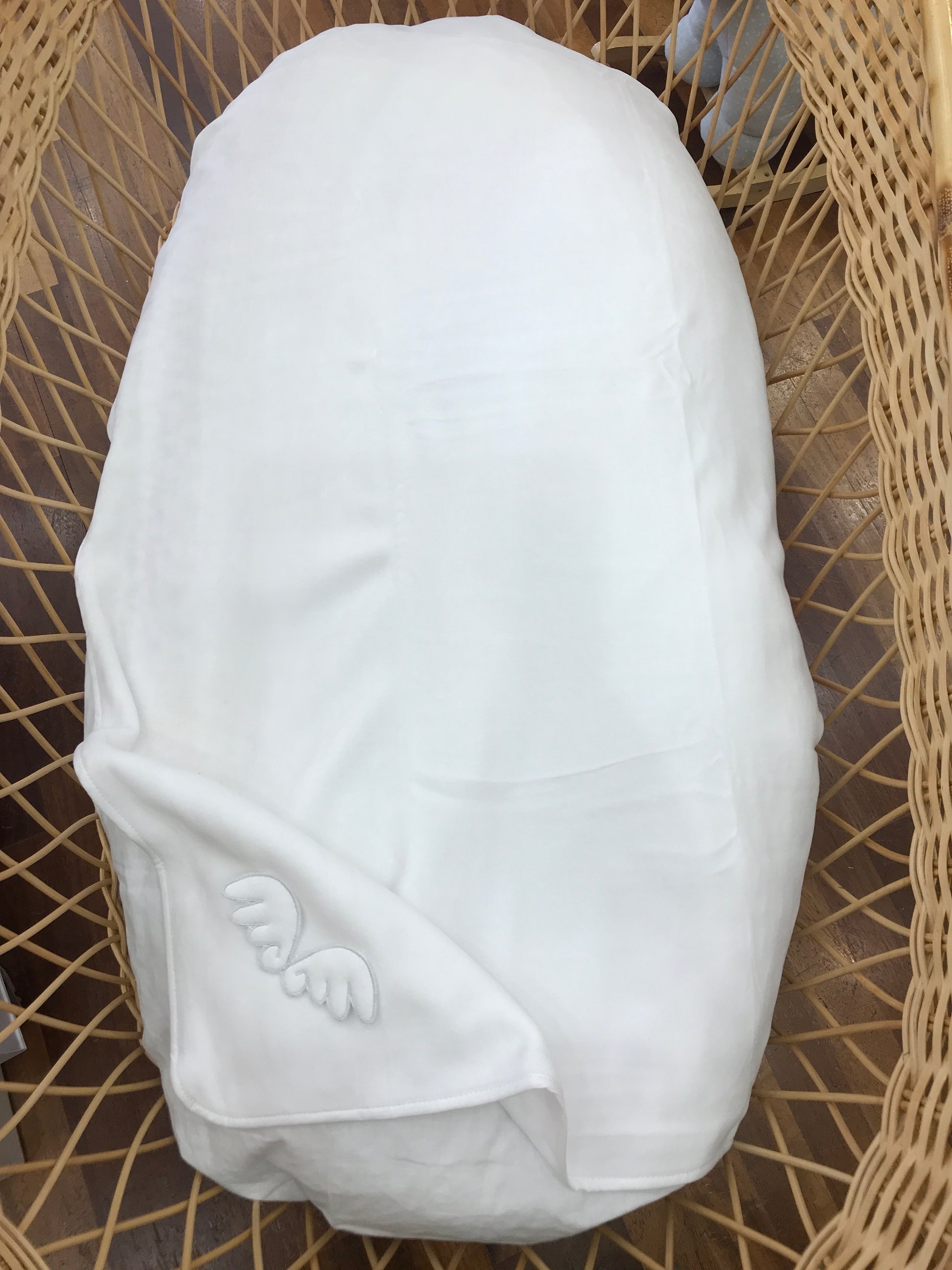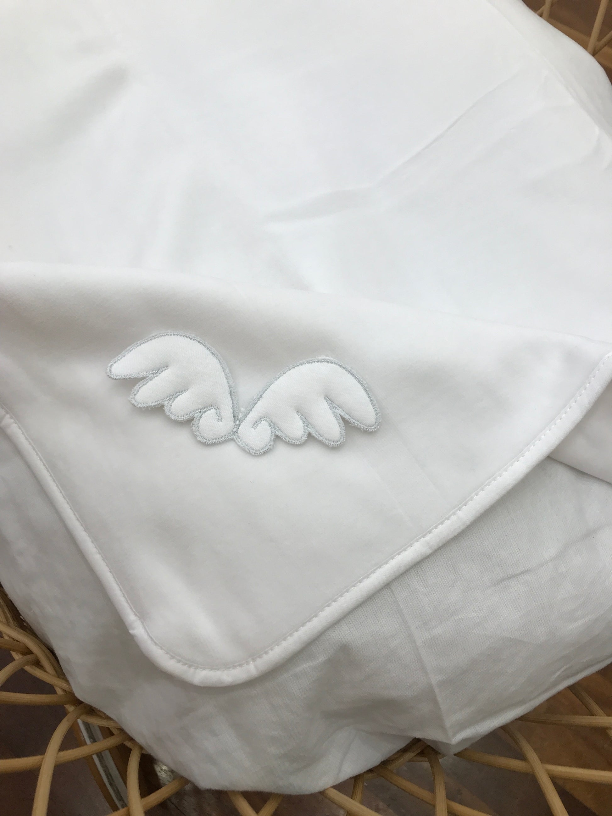 Questa coperta base in ciniglia presenta una semplice decorazione con piccole ali lungo il bordo, conferendo un tocco delicato e raffinato.