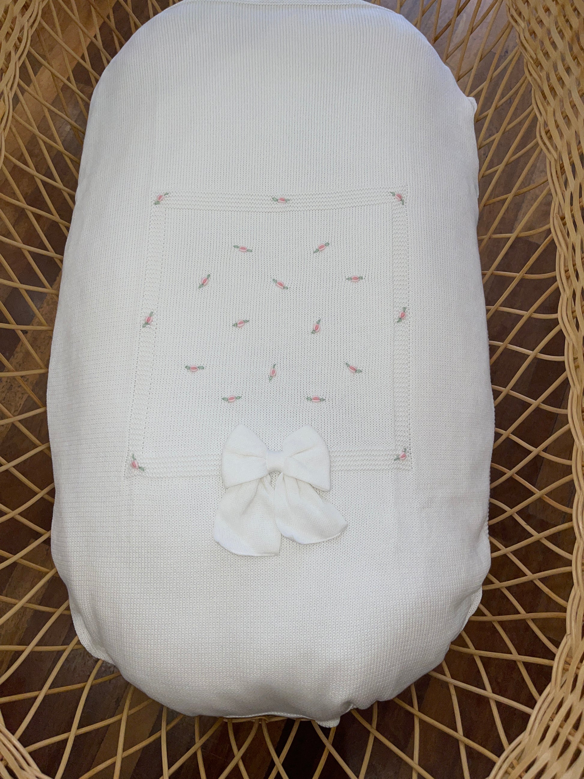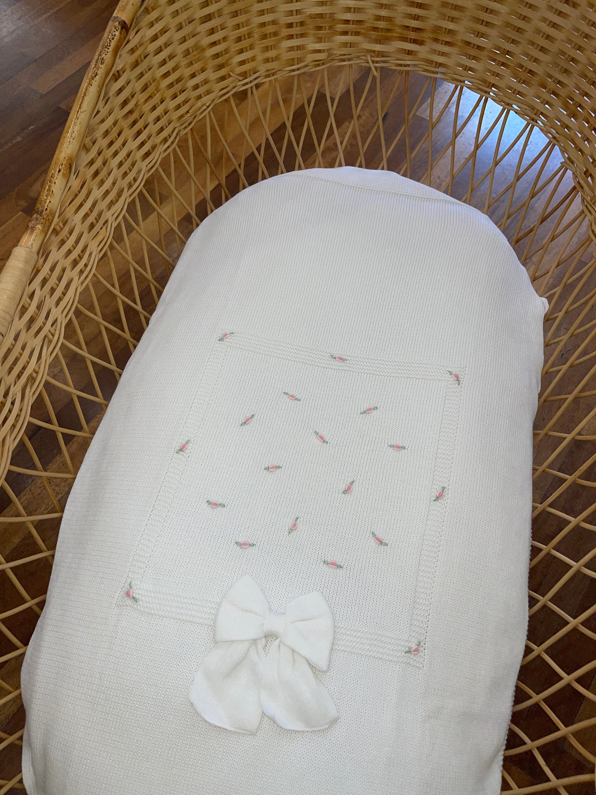 Questa coperta baby lord è perfetta per tenere al caldo il tua bambina. Realizzata in tessuto liscio, presenta al centro roselline ricamate in rilievo e un delizioso fiocco in filo per un tocco di eleganza. Confortevole e raffinata, è ideale per coccolare il tuo piccolo e aggiungere un tocco di stile al suo lettino.