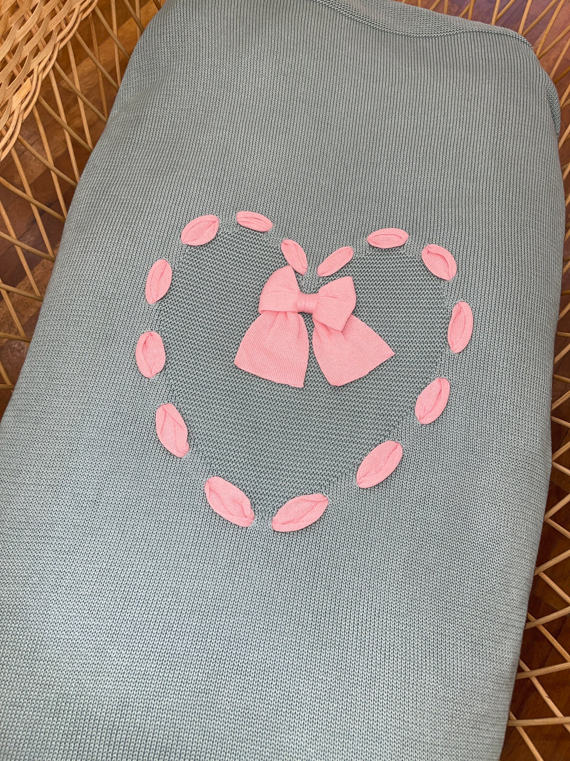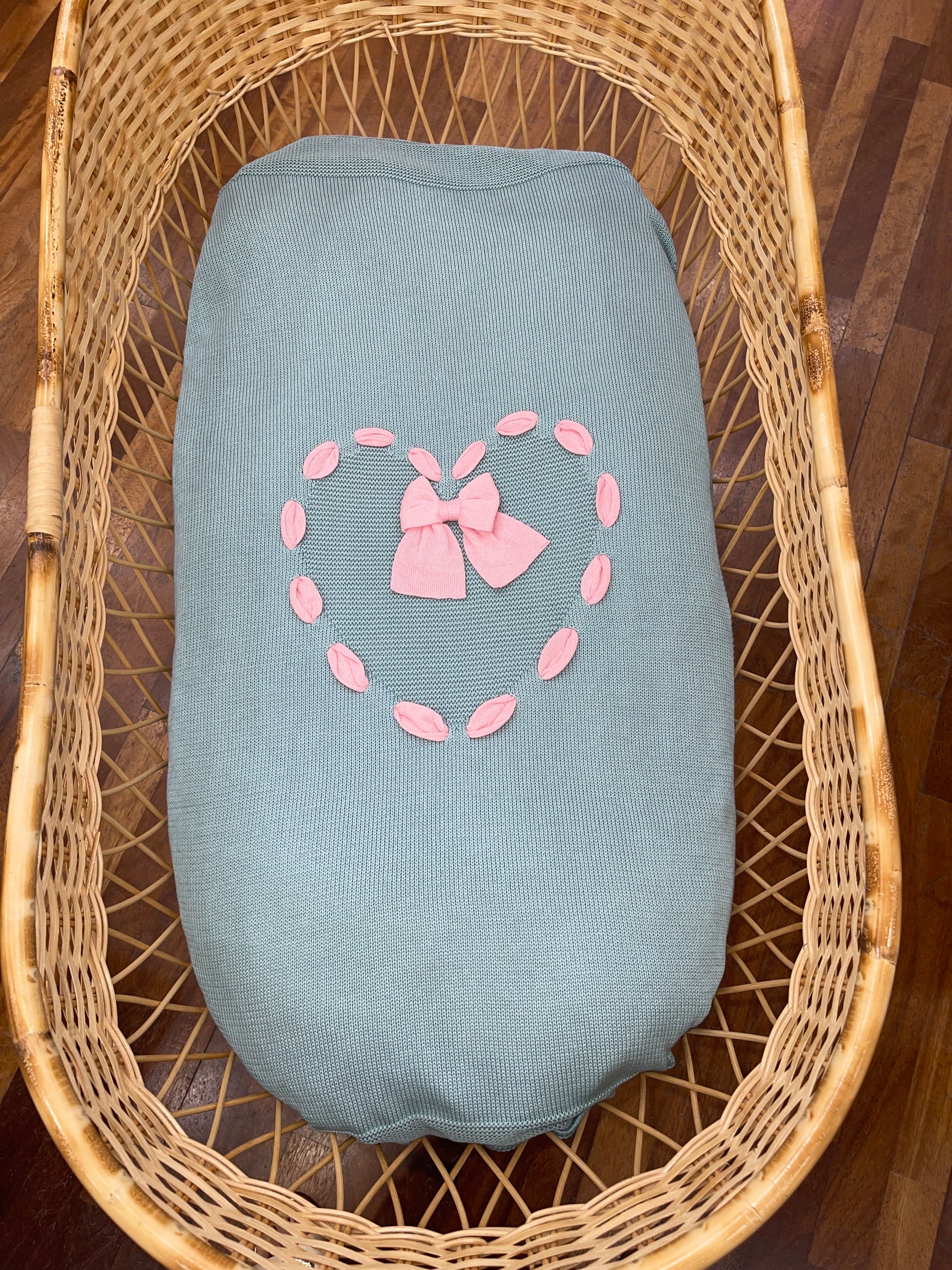 Questa coperta baby lord è un'adorabile scelta per il tuo bimbo. Realizzata in morbido materiale verde, ha un passa nastro a forma di cuore rosa e un grazioso fiocco centrale. Perfetta per un regalo o per avvolgere il tuo piccolo tenero durante il sonno.