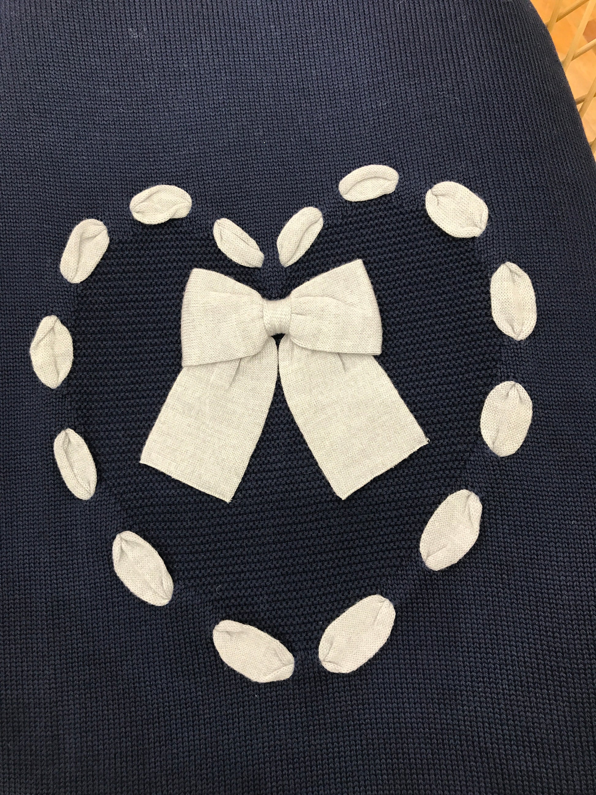 Questa coperta in lana di alta qualità è arricchita da un elegante fiocco color panna e da un delicato cuore ricamato nella stessa tonalità, offrendo un connubio perfetto tra comfort termico e raffinata estetica per il benessere del tuo bambino.