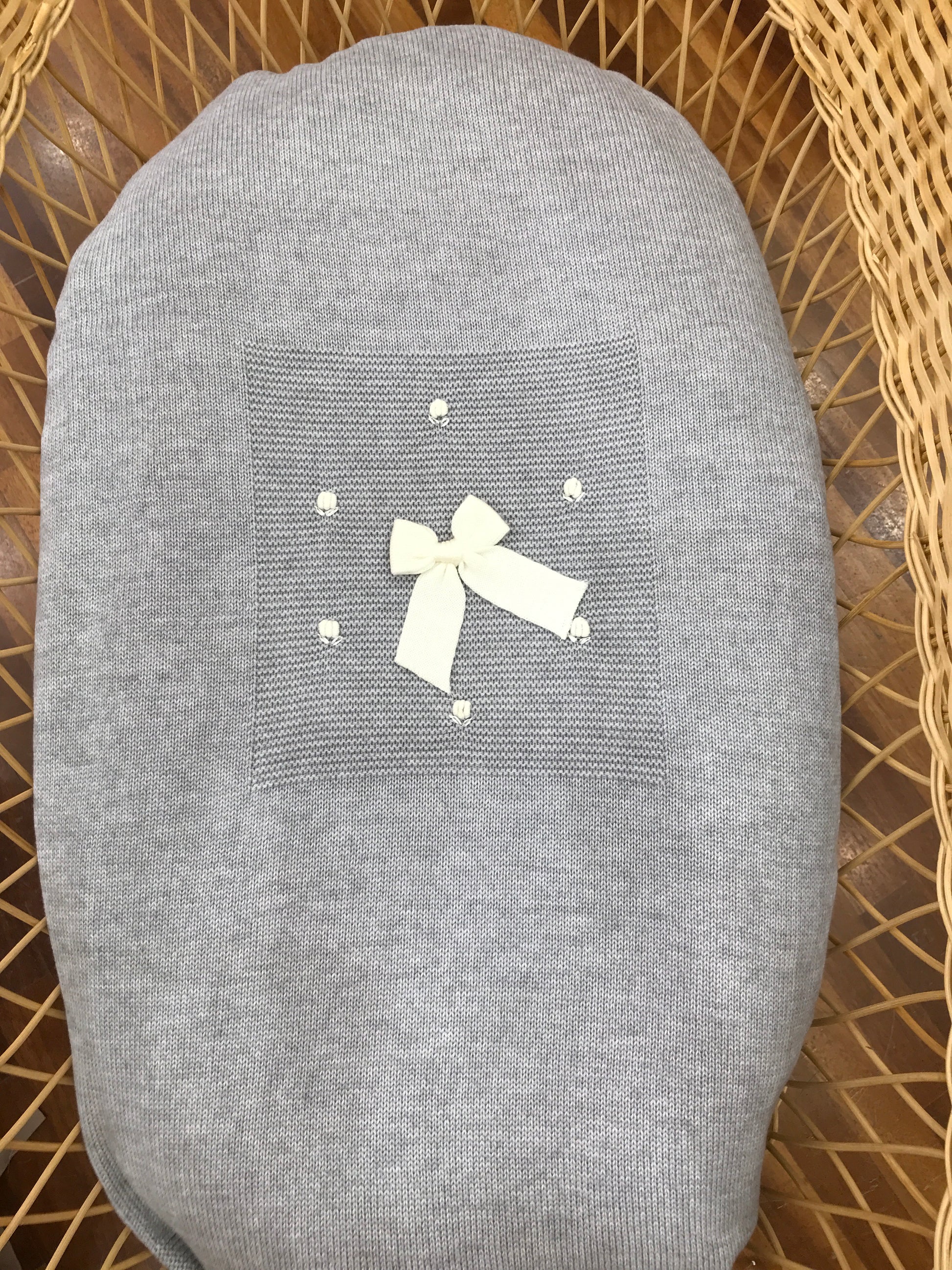 Questa coperta in lana presenta un design essenziale, caratterizzato da un unico riquadro centrale decorato con fiori bianchi ricamati e un delicato fiocco in rilievo.