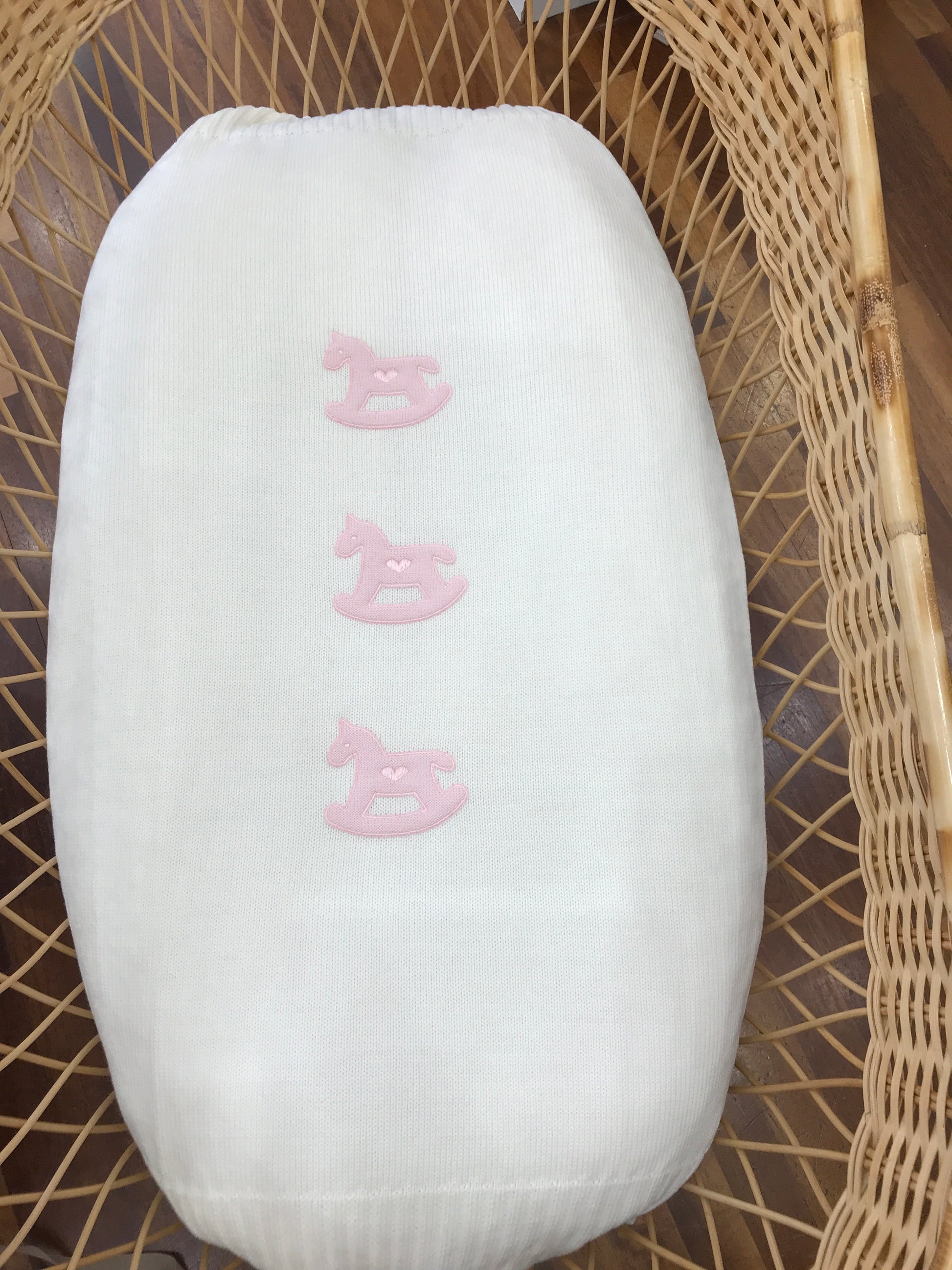 Questa coperta in lana color panna si distingue per la raffinata decorazione in rilievo sul davanti, che raffigura un cavallo a dondolo rosa. Realizzata con materiali di alta qualità, offre calore e comfort ideali per il neonato, unendo funzionalità ed eleganza in un unico prodotto.