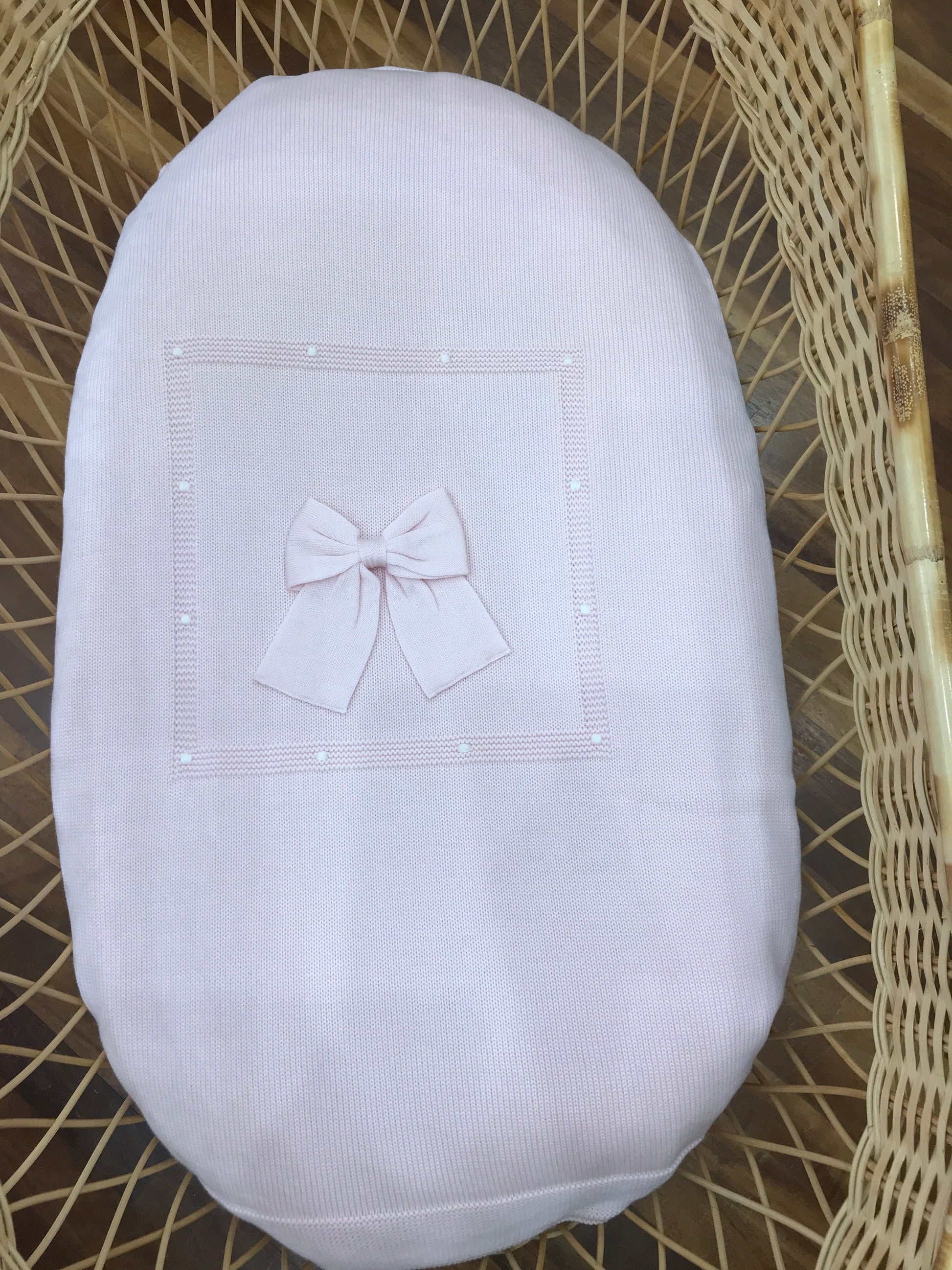 Coperta in lana caratterizzata da un riquadro centrale decorato con piccoli pois, al cui interno spicca un fiocco rosa tono su tono in rilievo.