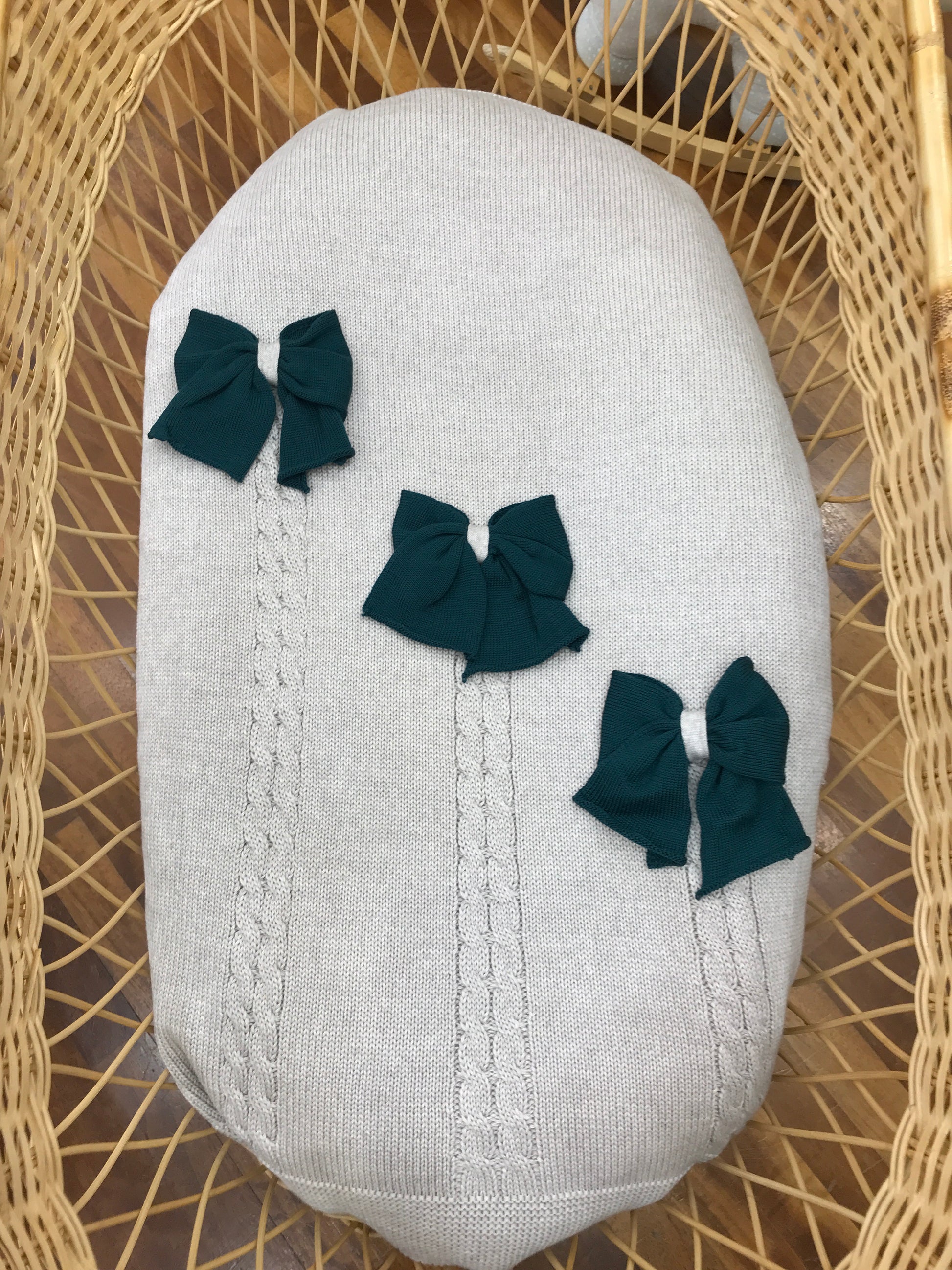 Questa coperta per neonati in lana presenta una lavorazione a trecce tono su tono e dettagli con fiocchi verdi, unendo comfort e stile raffinato per il benessere del tuo bambino.