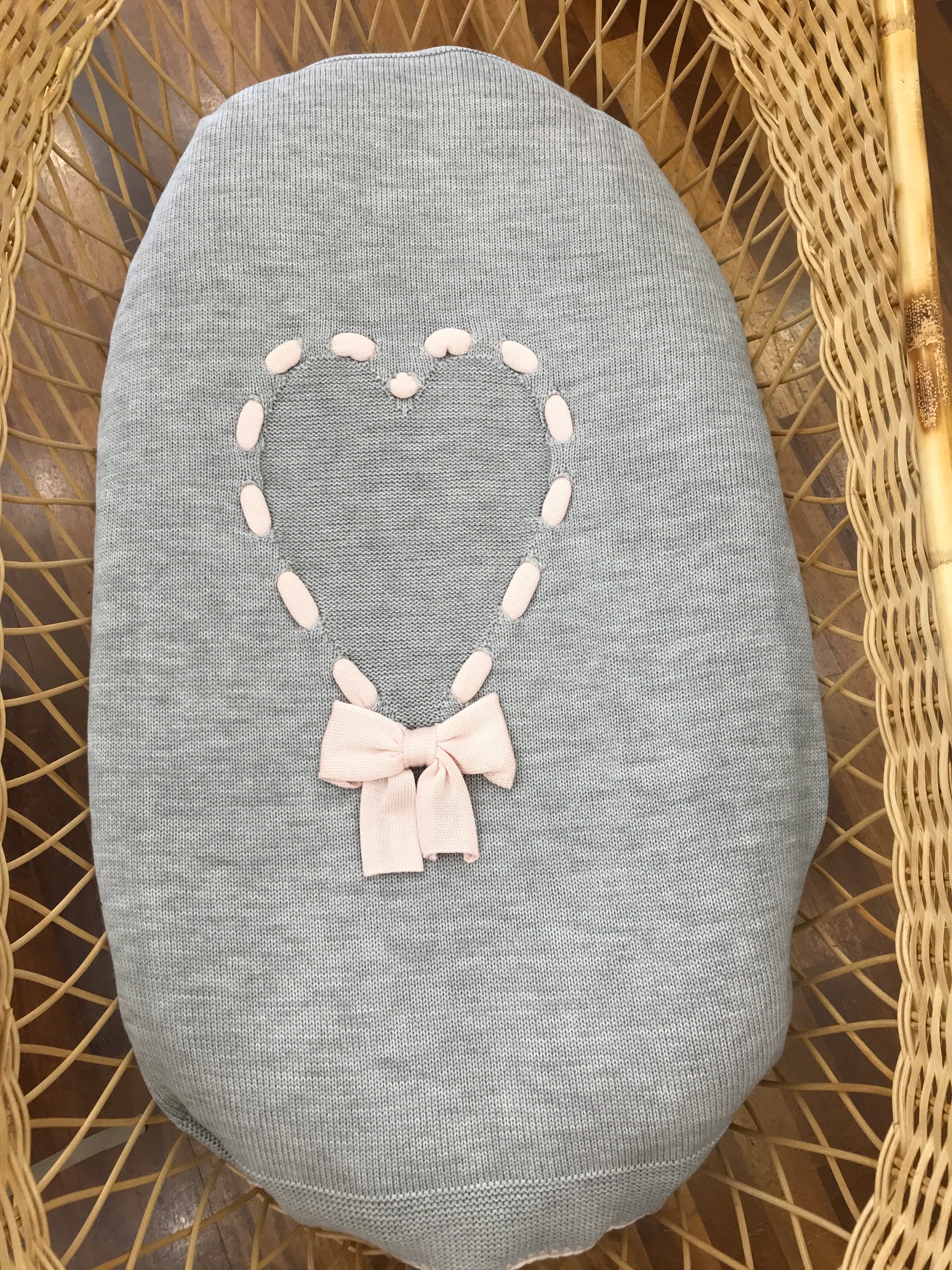 Questa coperta in lana presenta un delicato bordo traforato rosa e un cuore decorativo in passanastro rosa, completato da un elegante fiocco dello stesso colore.