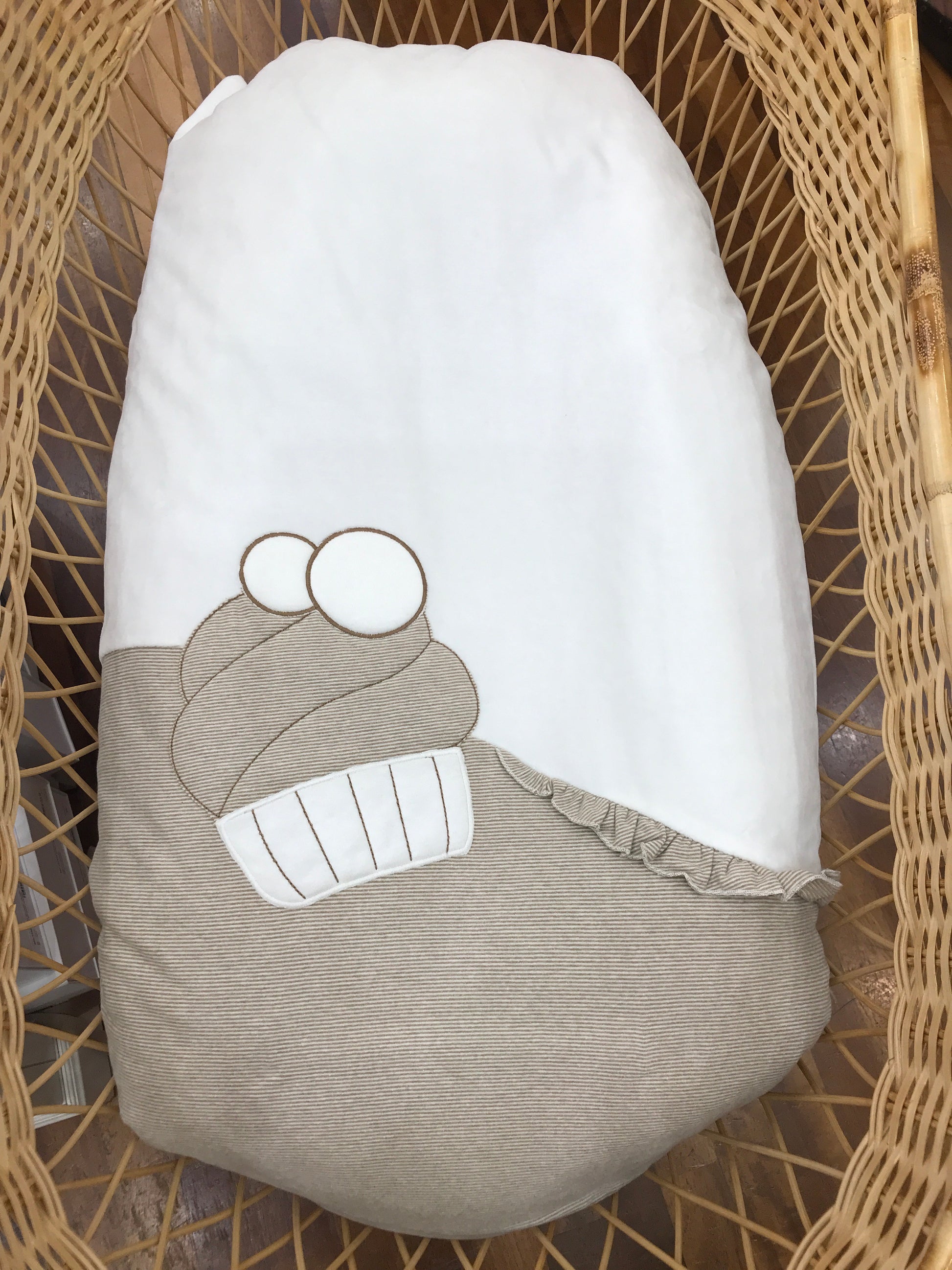 Realizzata in ciniglia soffice, questa coperta presenta un delicato cupcake applicato sul laccio e una ruches elegante in tonalità tortora, unendo comfort e stile raffinato.