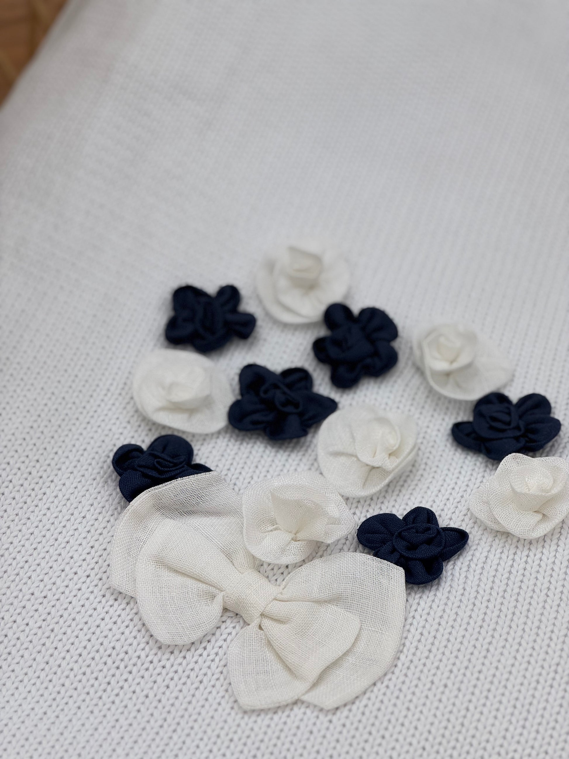 Questa coperta Colibrì è realizzata con un filo bianco di alta qualità e presenta delicati fiori realizzati a mano in lino e tessuto blu.