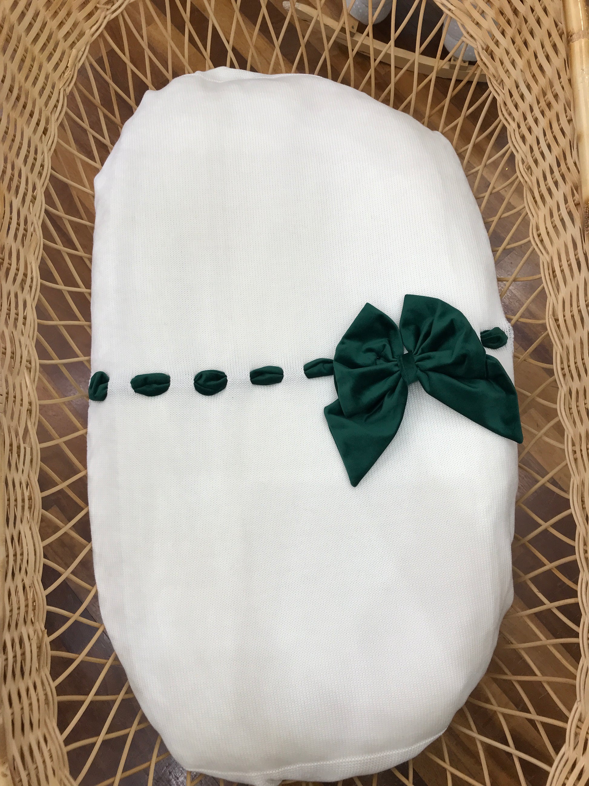 Questa coperta in lana si distingue per la sua semplicità essenziale, priva di ricami. L’unico elemento decorativo è un elegante fiocco in velluto verde bottiglia, che aggiunge un tocco raffinato senza appesantire il design.