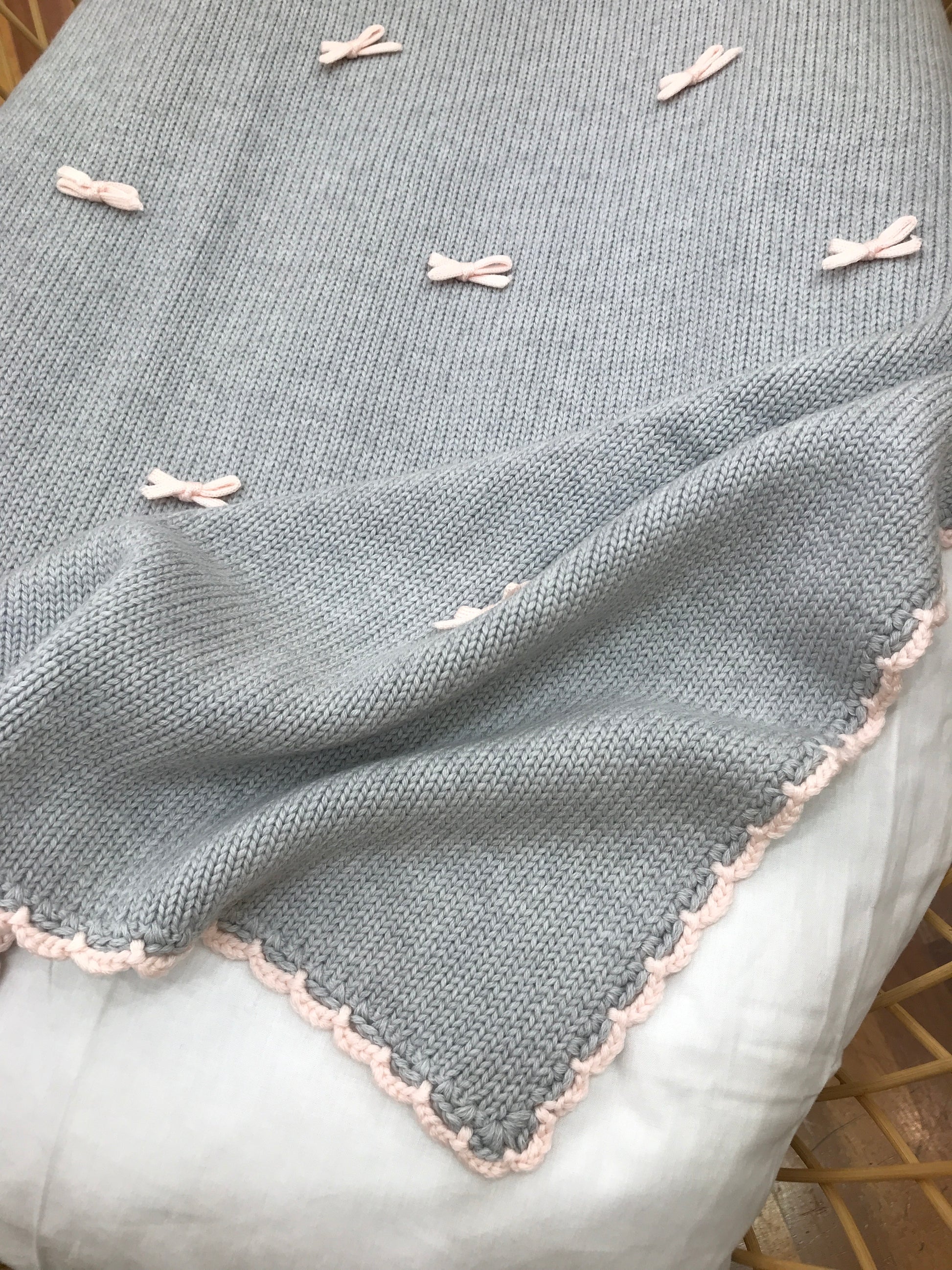 Questa coperta in lana presenta un bordo rifinito con un delicato motivo traforato ricamato in rosa e si distingue per la sua superficie interamente decorata con piccoli fiocchetti rosa, offrendo un tocco di eleganza e morbidezza.