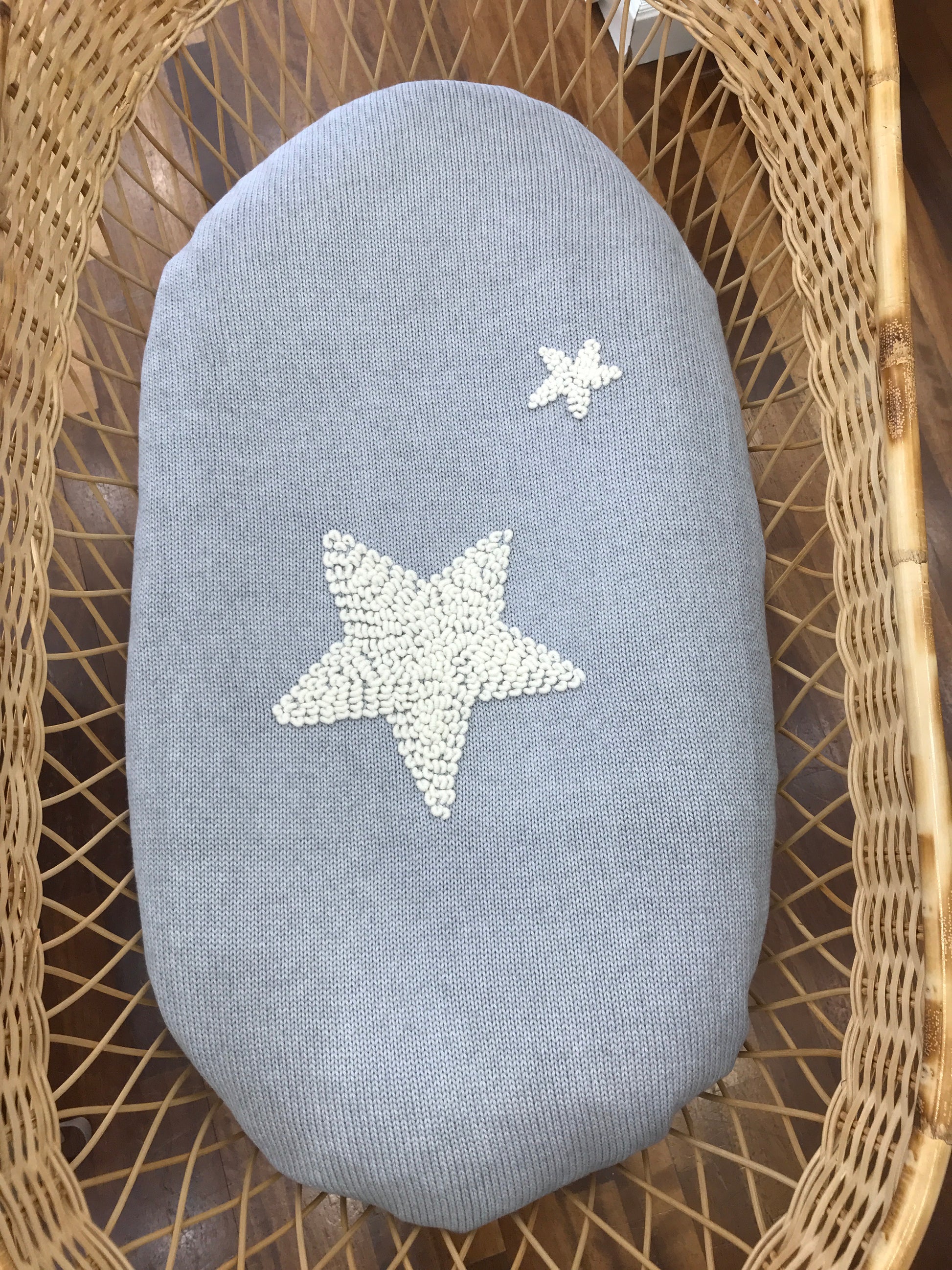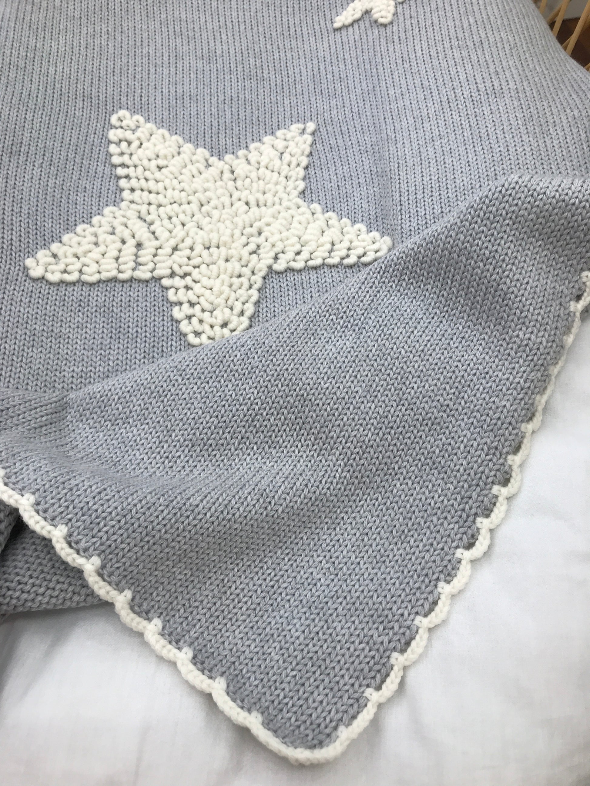 Questa coperta in lana presenta un bordo smerlato color panna e due stelle ricamate in rilievo al centro, unendo eleganza e dettagli raffinati.