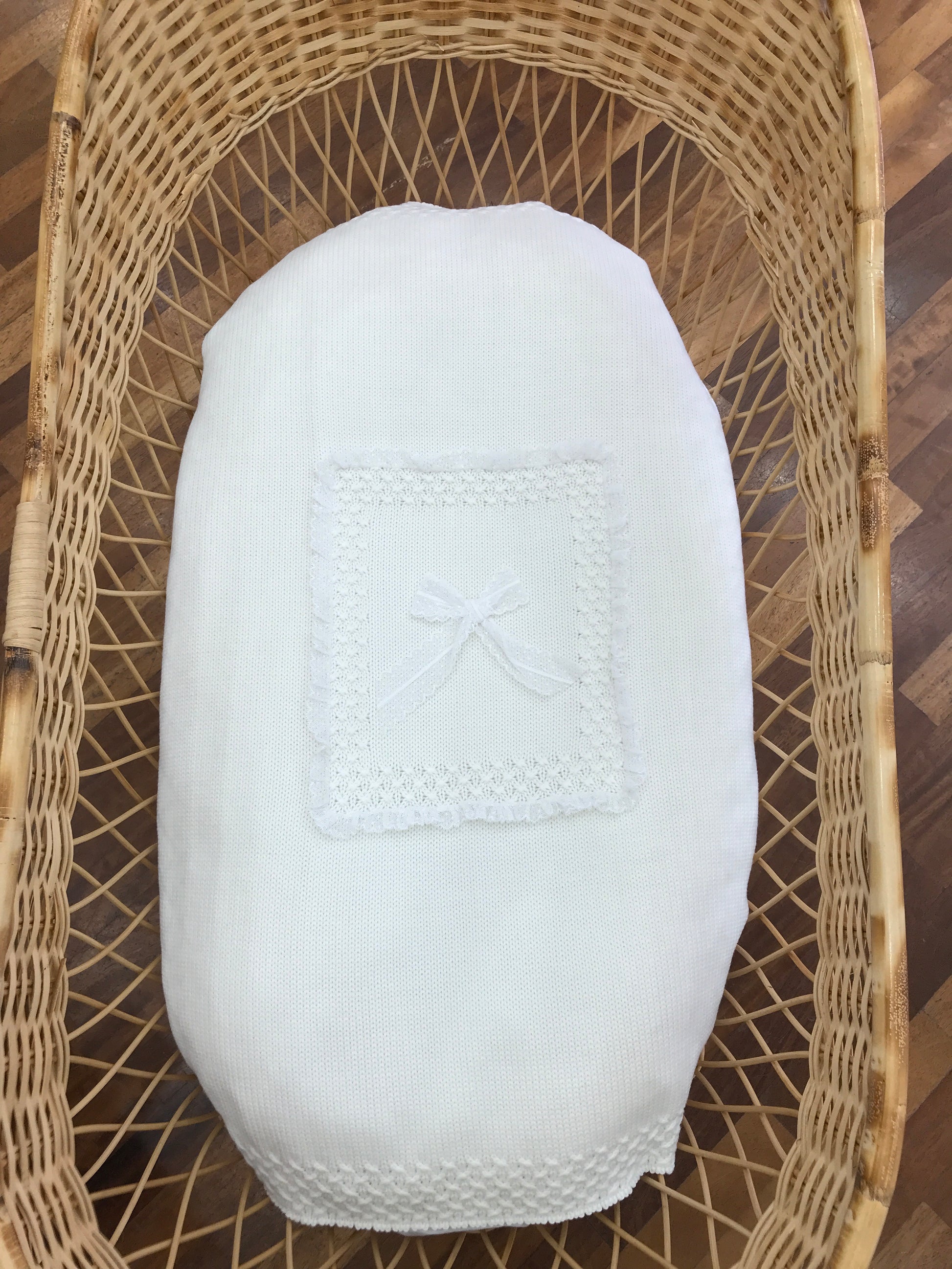 Questa coperta in lana presenta un bordo rifinito con lavorazione a maglia, un riquadro decorativo in merletto e un fiocco centrale anch’esso in merletto, unendo eleganza e artigianalità in un unico prodotto.