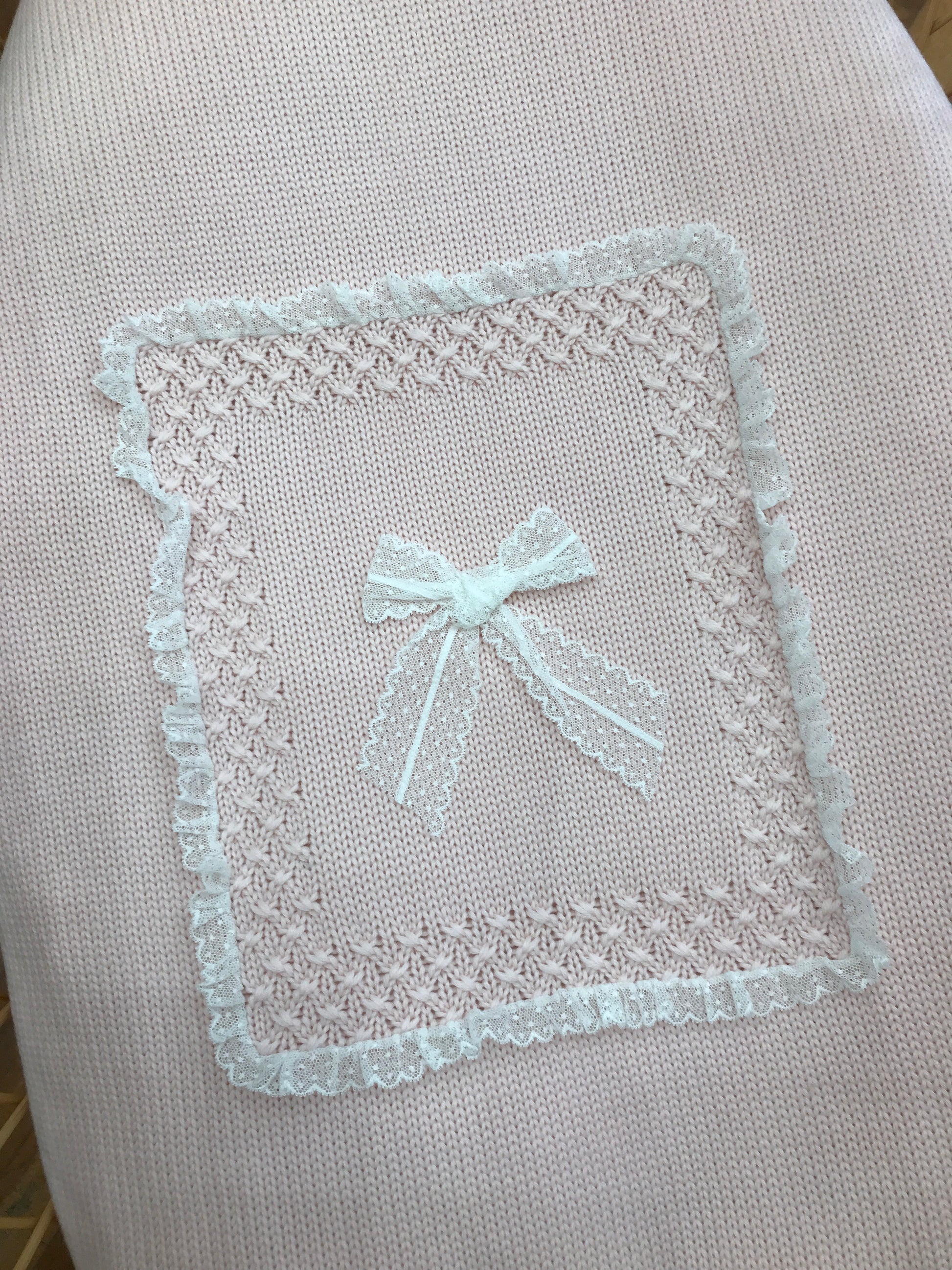 Questa coperta in lana presenta un bordo rifinito con lavorazione a maglia, un riquadro decorativo in merletto e un fiocco centrale anch’esso in merletto, unendo eleganza e artigianalità in un unico prodotto.