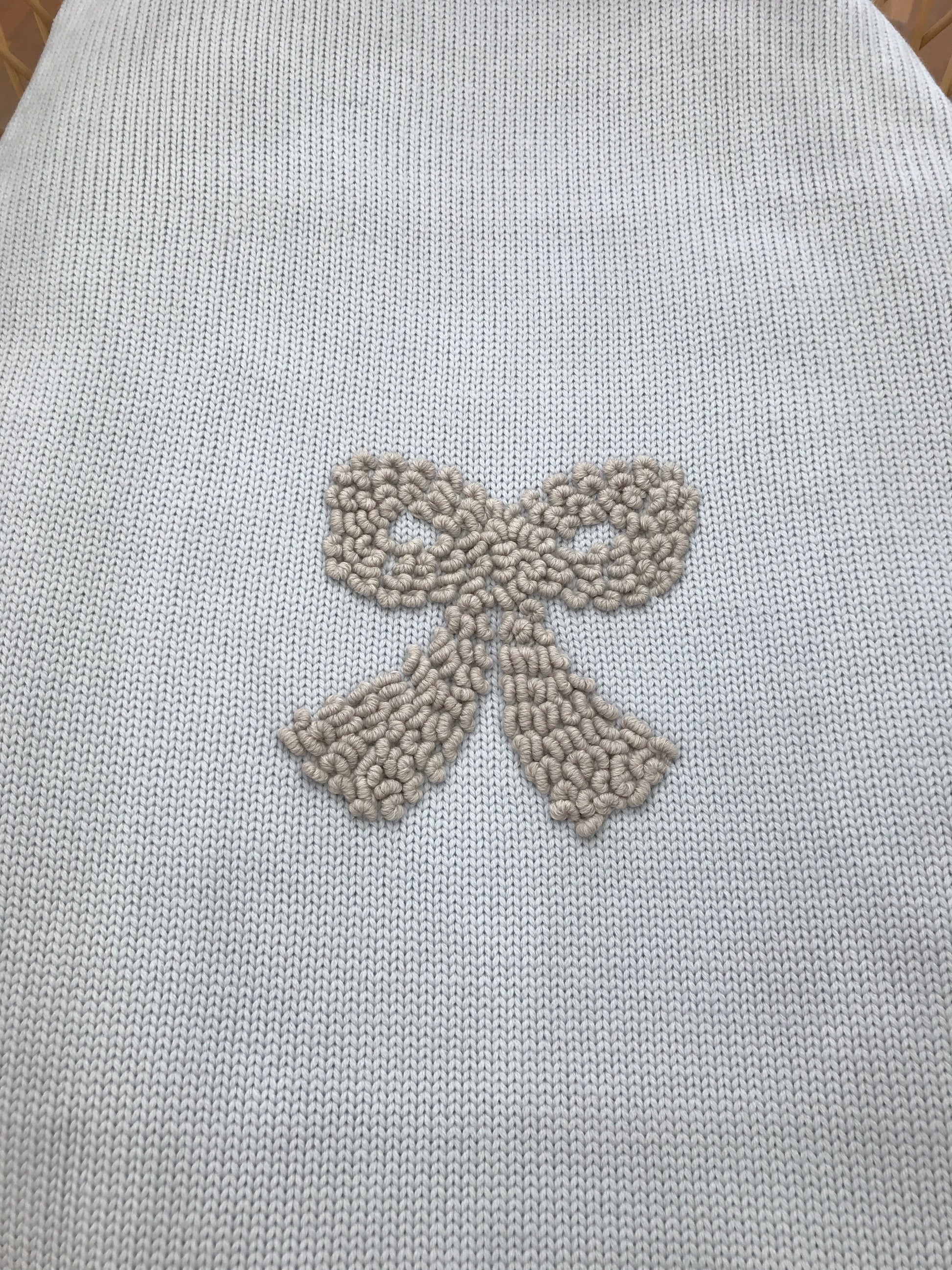 Questa coperta in lana celeste si distingue per il raffinato bordo traforato ricamato in tortora, che ne enfatizza l’eleganza. Al centro della parte frontale è presente un fiocco in rilievo dello stesso colore tortora, che aggiunge un tocco sofisticato e di pregio all’insieme, rendendo il prodotto ideale per ambienti raffinati e un comfort avvolgente.