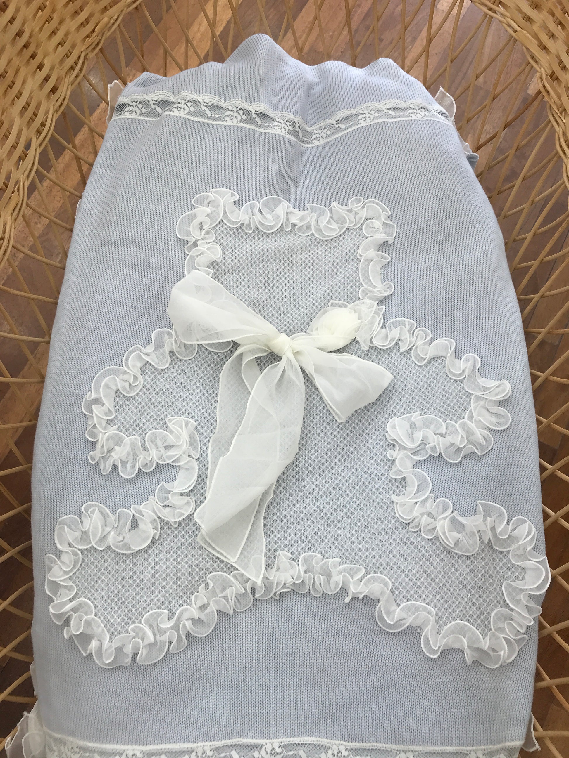 Questa coperta celeste realizzata in lana pregiata si distingue per i dettagli raffinati: i bordi sono decorati con morbide ruches che conferiscono un'eleganza delicata all'intero prodotto. Al centro, un suggestivo inserto di merletto impreziosito da rose posizionate su tutti e quattro i lati aggiunge un tocco di finezza artigianale. Nel cuore della coperta, si trova un orsetto creato con ruches, che rappresenta il punto focale del design; l’orsetto è ulteriormente arricchito da un fiocco e da una rosa, elementi che sottolineano la cura nei dettagli e la qualità superiore del prodotto. Questa combinazione di materiali e decorazioni rende la coperta l’accessorio ideale per chi cerca un equilibrio tra comfort e stile raffinato.