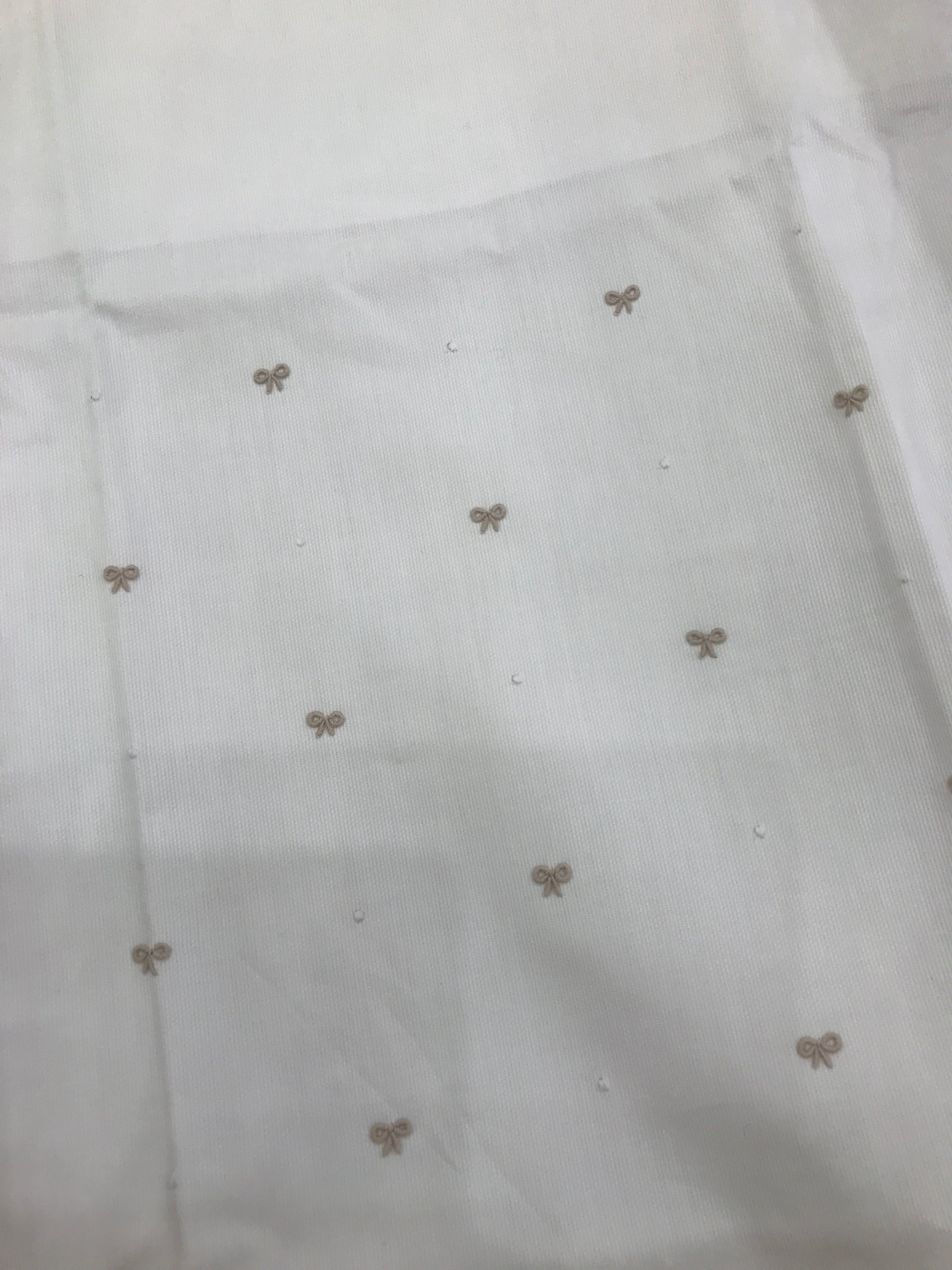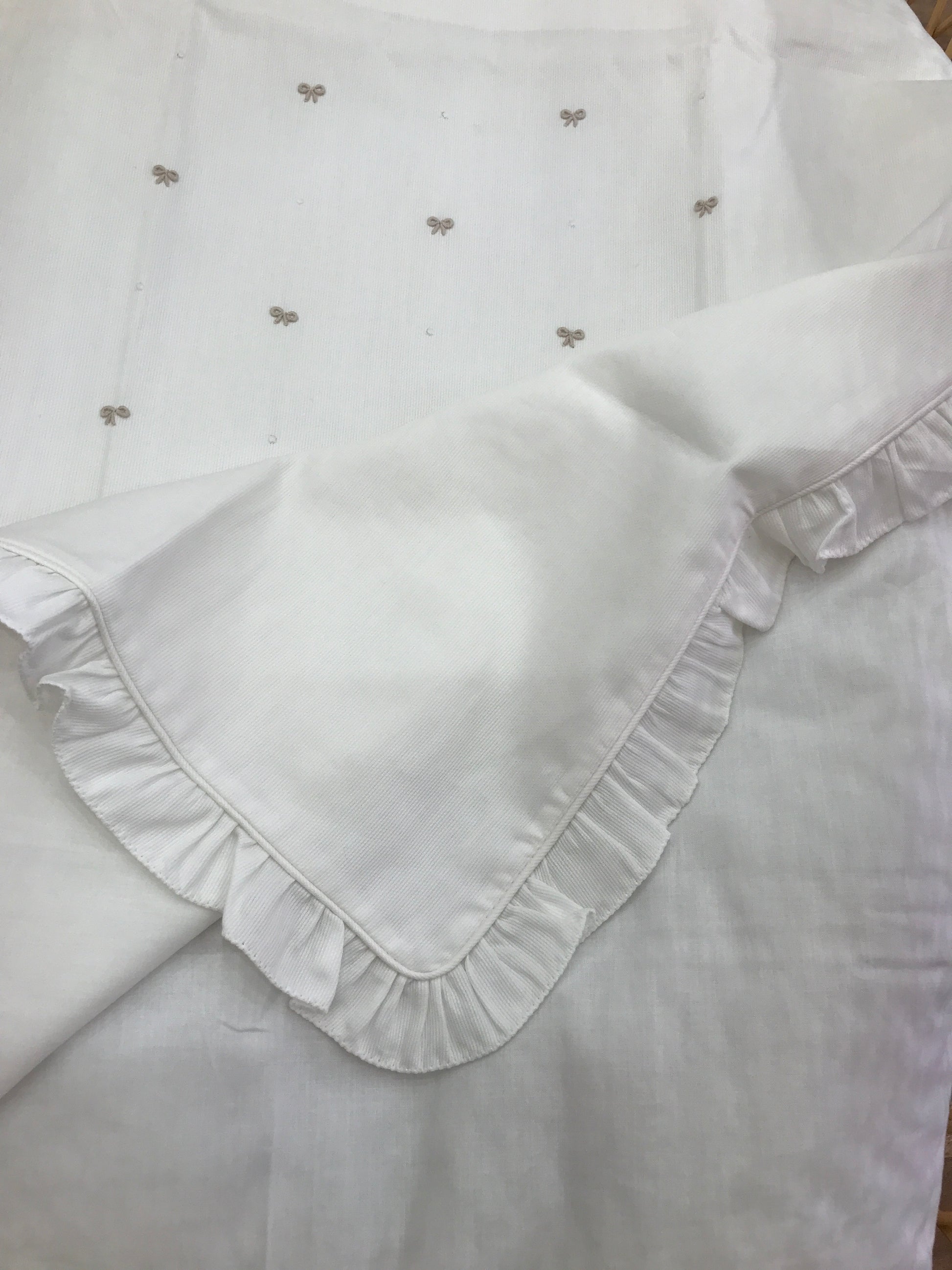 Copertina sfoderabile in piquet, versatile per tutte le stagioni grazie alla possibilità di aggiungere o rimuovere l’imbottitura. Al centro si distinguono eleganti fiocchetti ricamati beige e piccoli pois bianchi, mentre i bordi sono arricchiti da raffinati rouches bianchi.