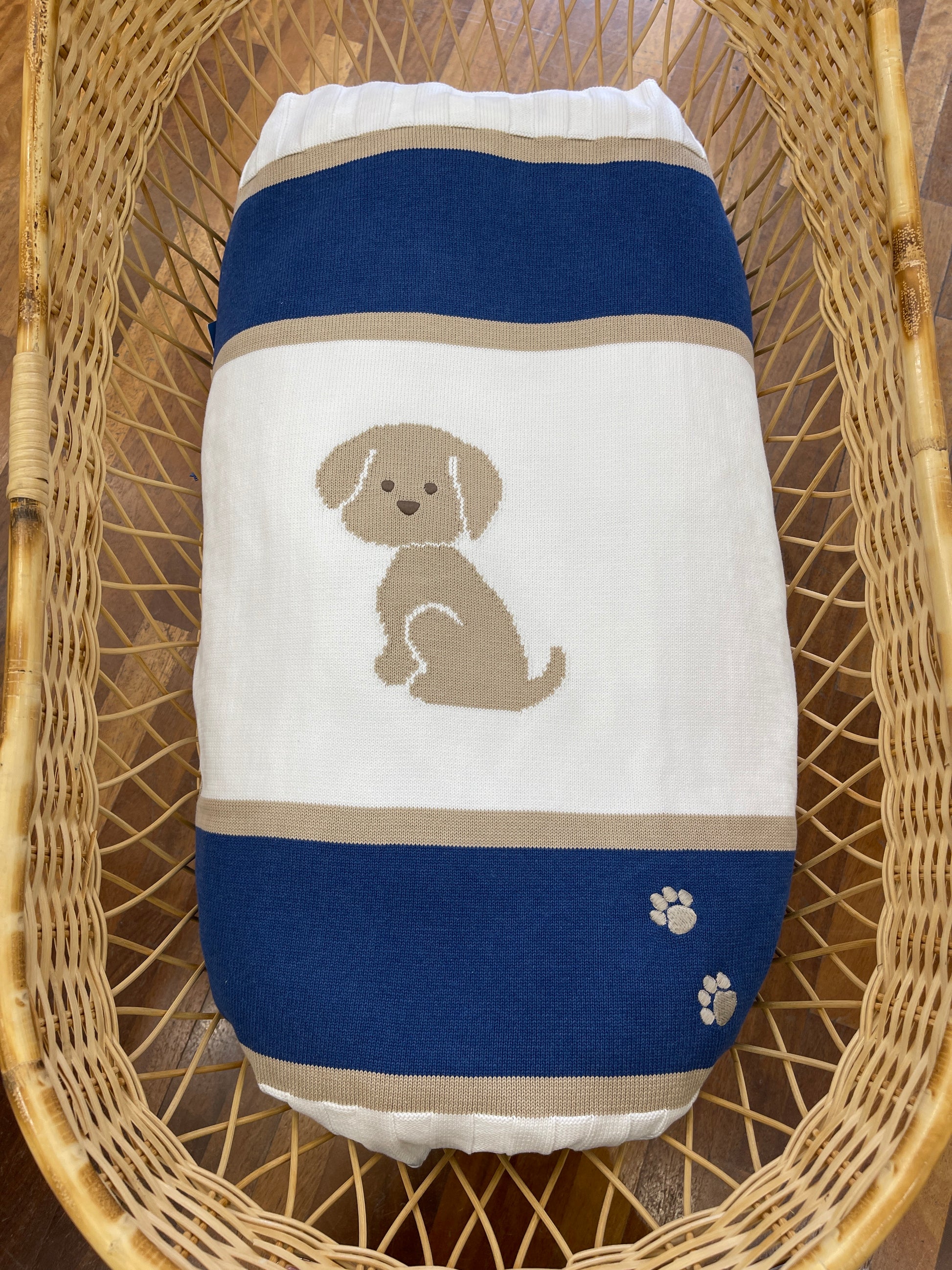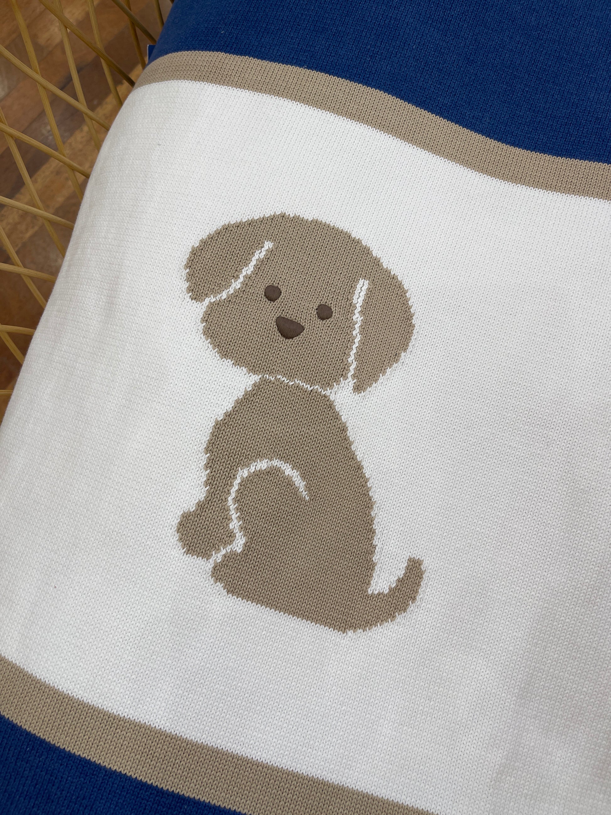Questa coperta in morbido pile presenta un disegno a tris di colori, con una fascia colorata e un adorabile cagnolino ricamato al centro. Perfetta per coccolarti durante le fredde serate invernali. Aggiungi un tocco di allegria e calore al tuo salotto con questa coperta dai colori chiari.
