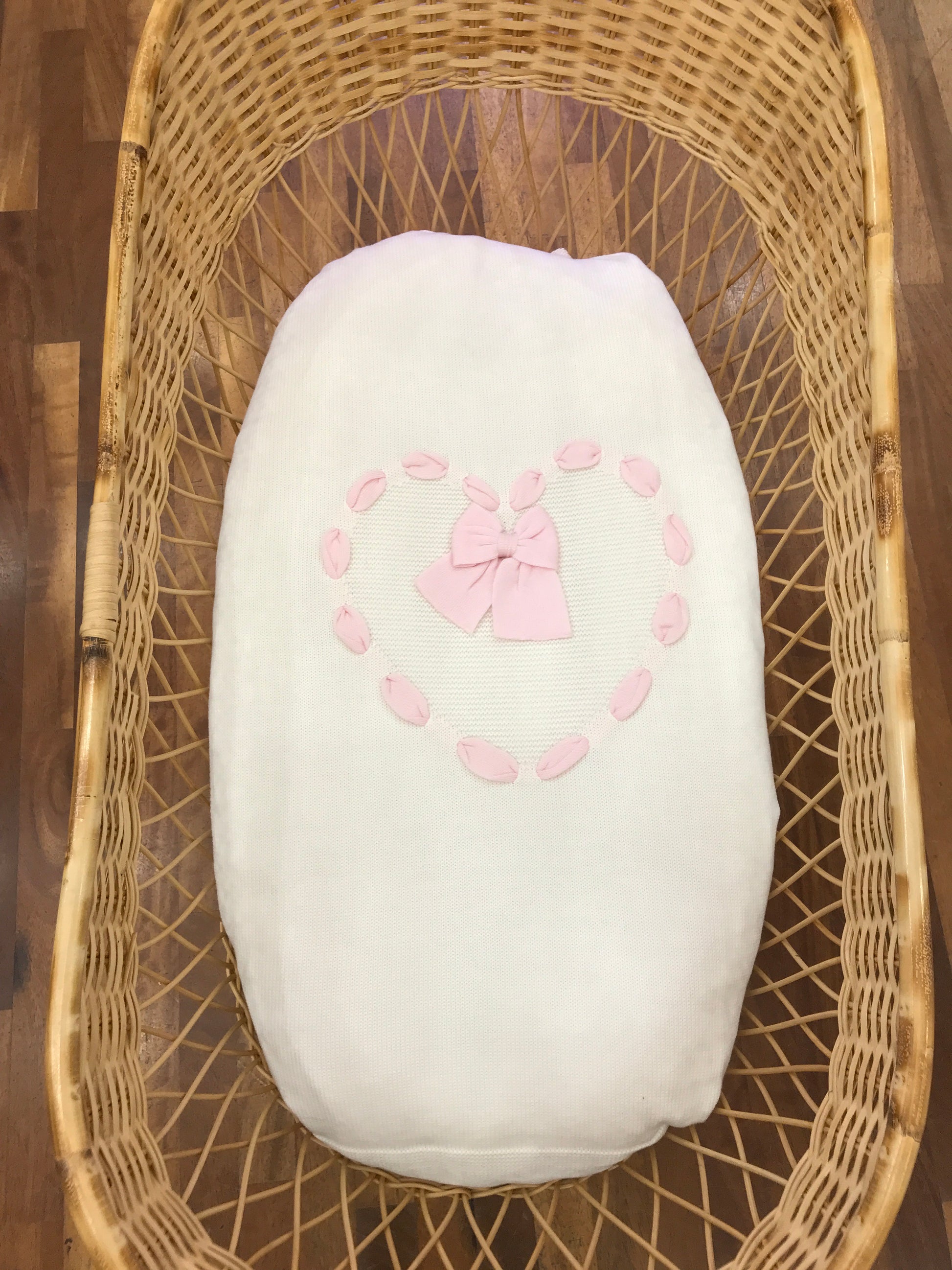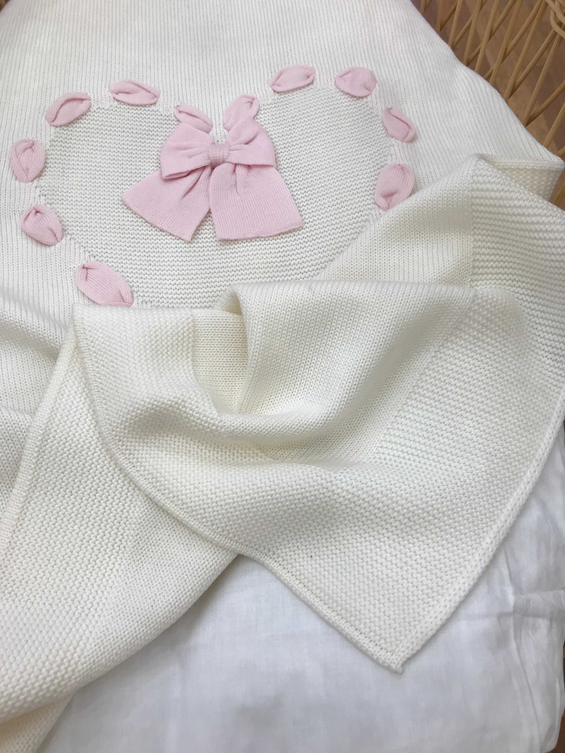 Coperta in lana color panna chiaro, decorata con un cuore passamaneria rosa al centro, impreziosito da un fiocco tono su tono.