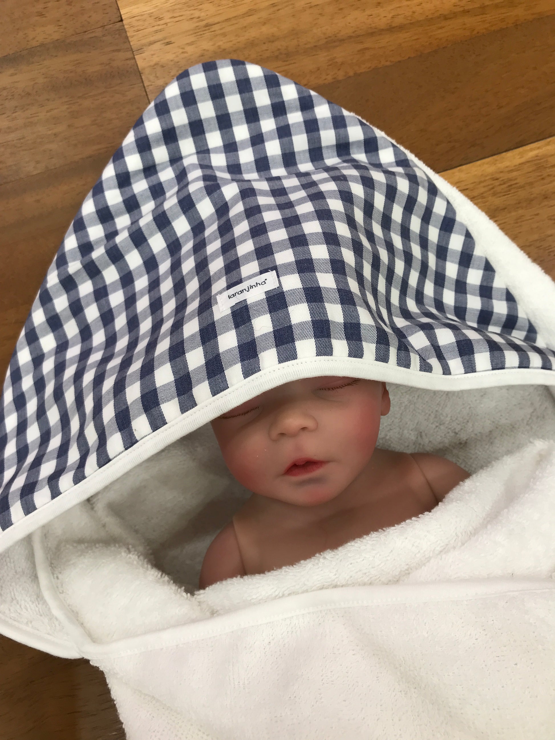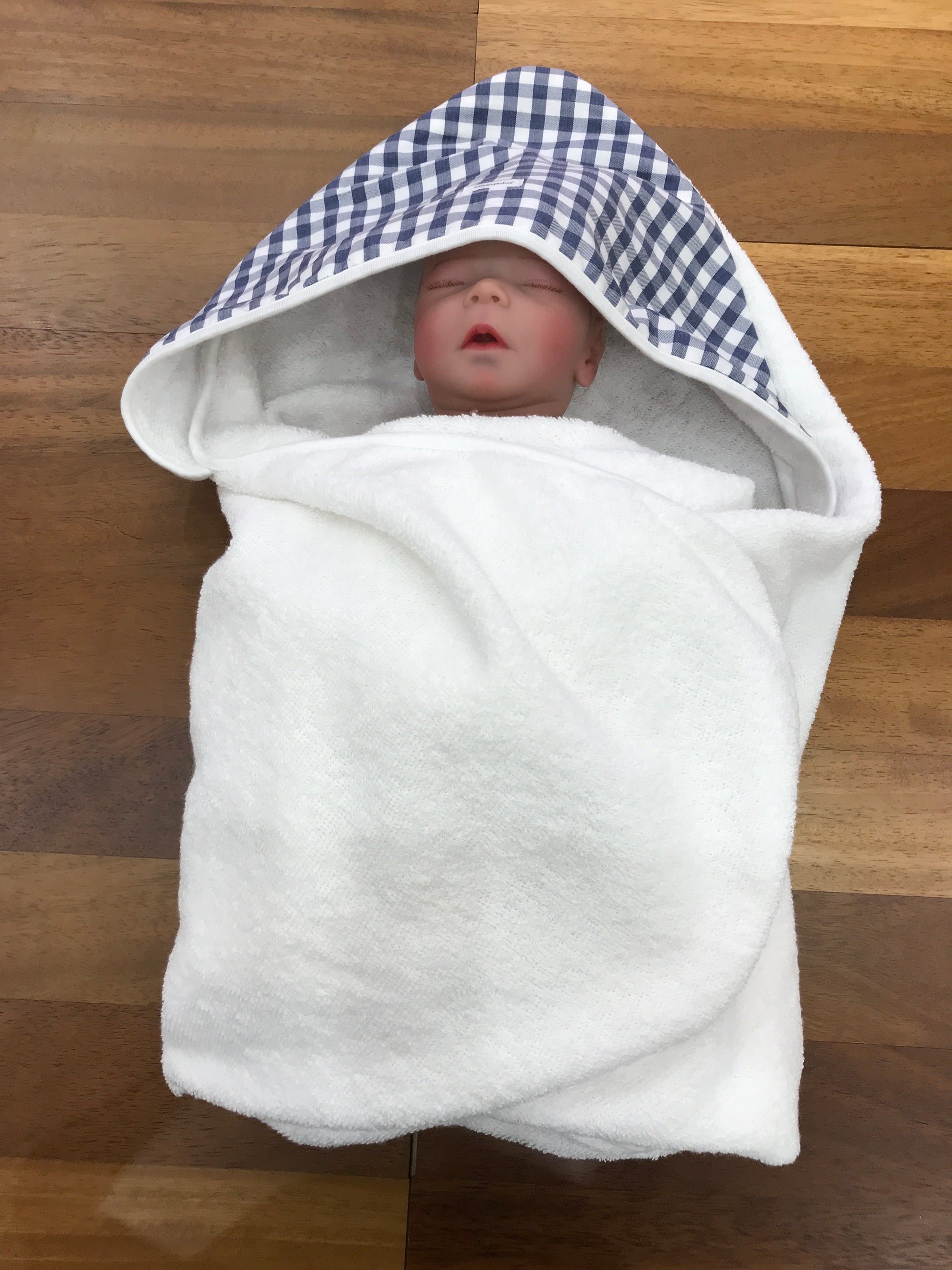 Asciugamano in spugna per il bagnetto, caratterizzato da una decorazione sul cappuccio e un motivo a quadretti bianchi e blu.