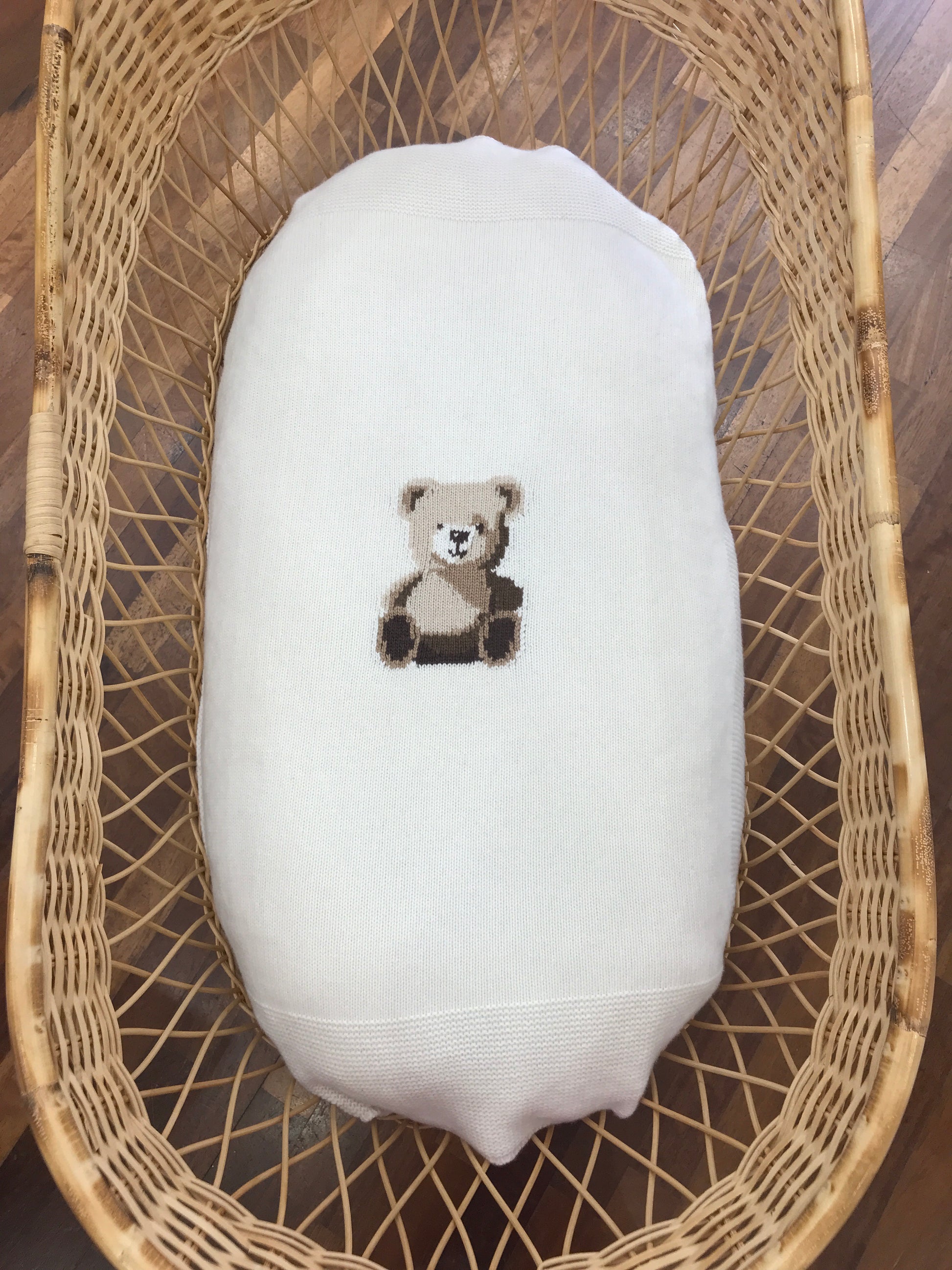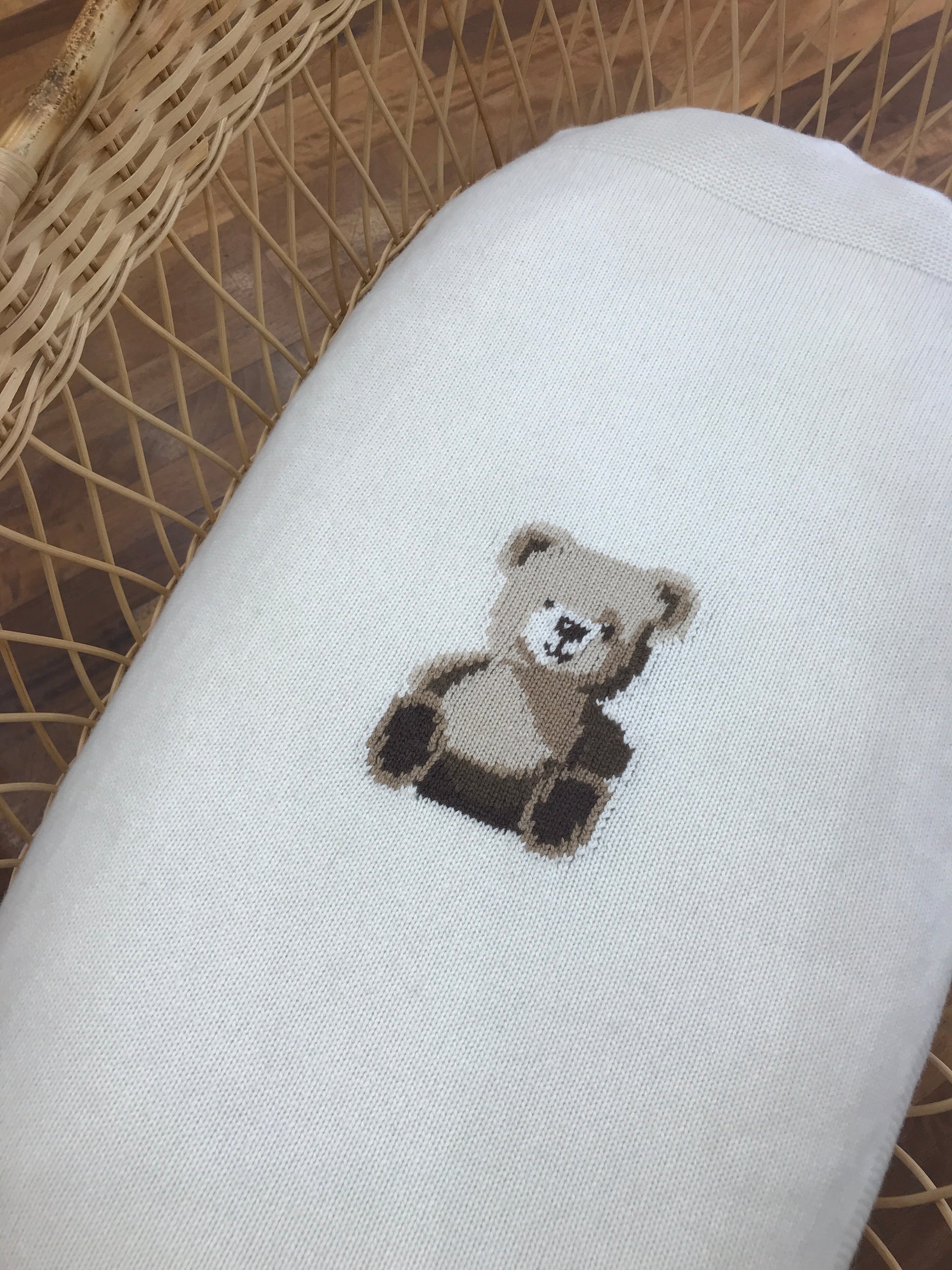 Questa coperta soffice presenta un ricamo centrale che raffigura un orsetto seduto, un dettaglio raffinato che ne esalta l’eleganza.