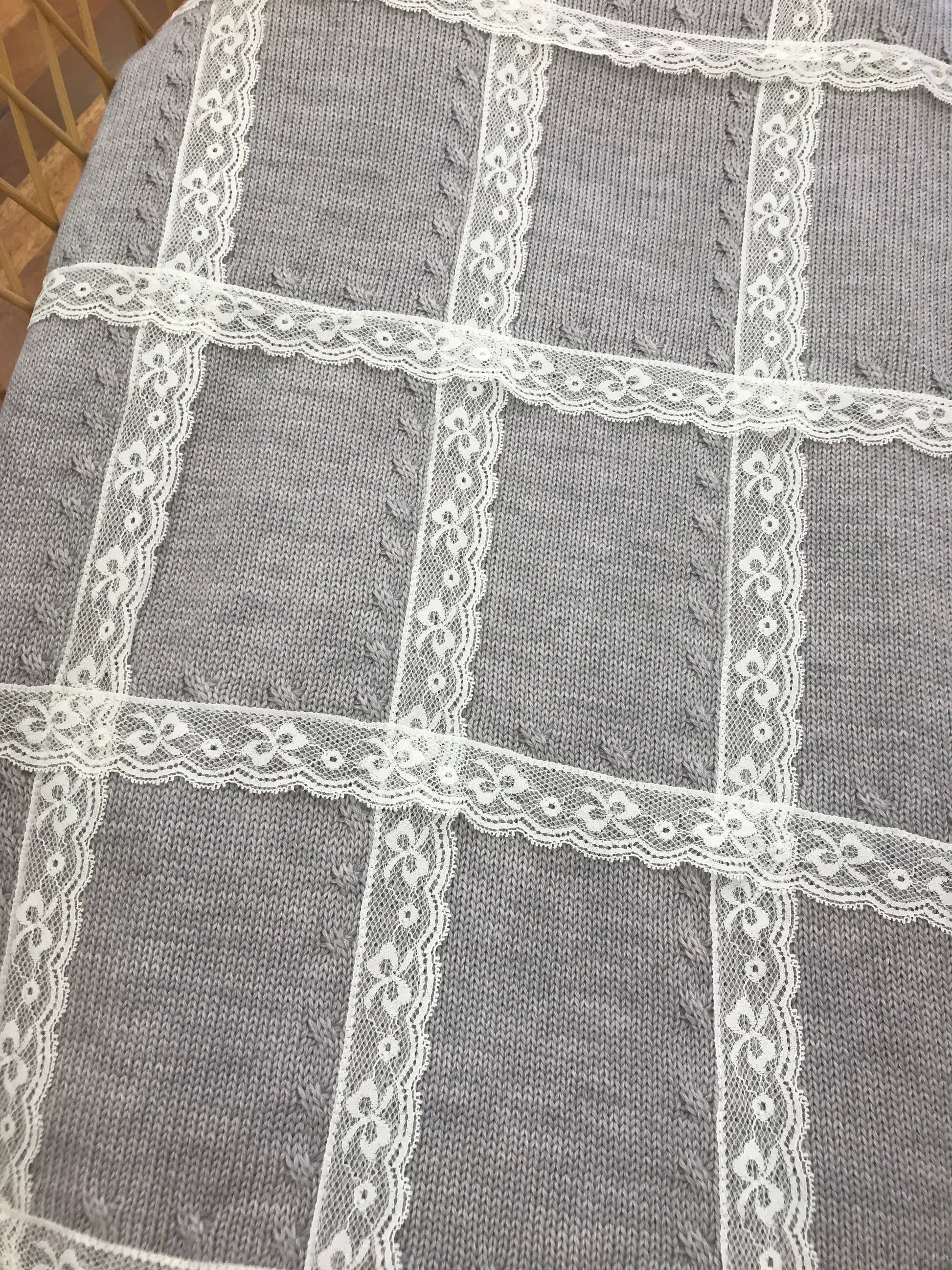 Coperta in lana di colore grigio chiaro, caratterizzata da un’applicazione di merletto sulla parte anteriore. Questo merletto, composto da piccoli quadrati, è stato progettato per migliorare significativamente l’estetica del prodotto, conferendo un tocco raffinato e dettagliato che valorizza la semplicità del tessuto senza comprometterne la morbidezza e il comfort. Un equilibrio ideale tra funzionalità e stile, perfetto per chi cerca un accessorio elegante e di qualità superiore.