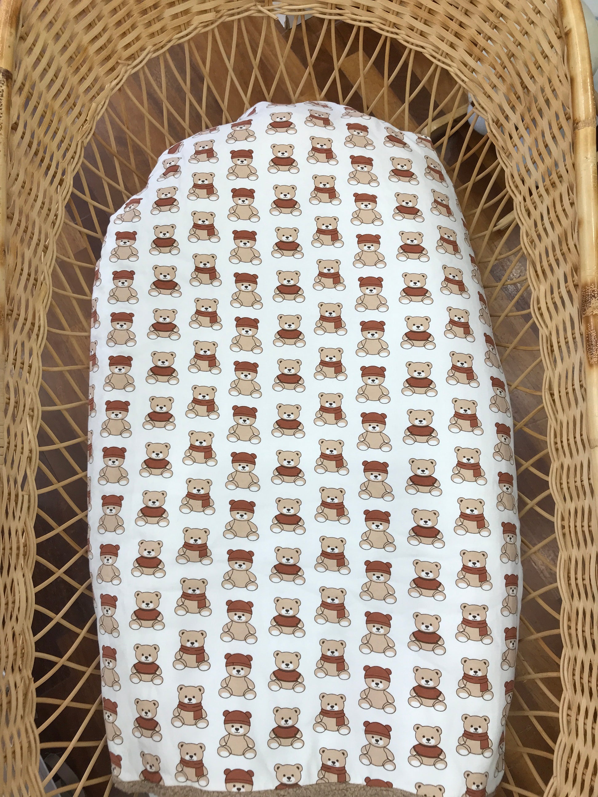 Coperta in lana, decorata con numerosi piccoli orsetti e foderata internamente con una morbida pelliccia.