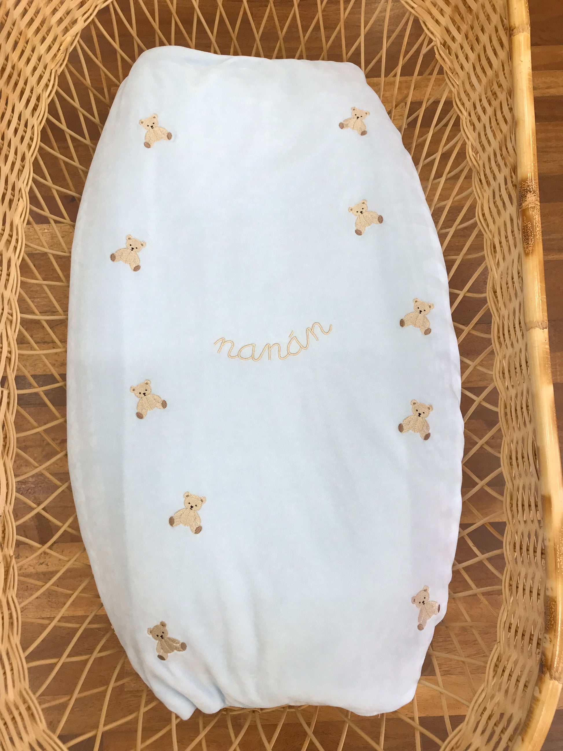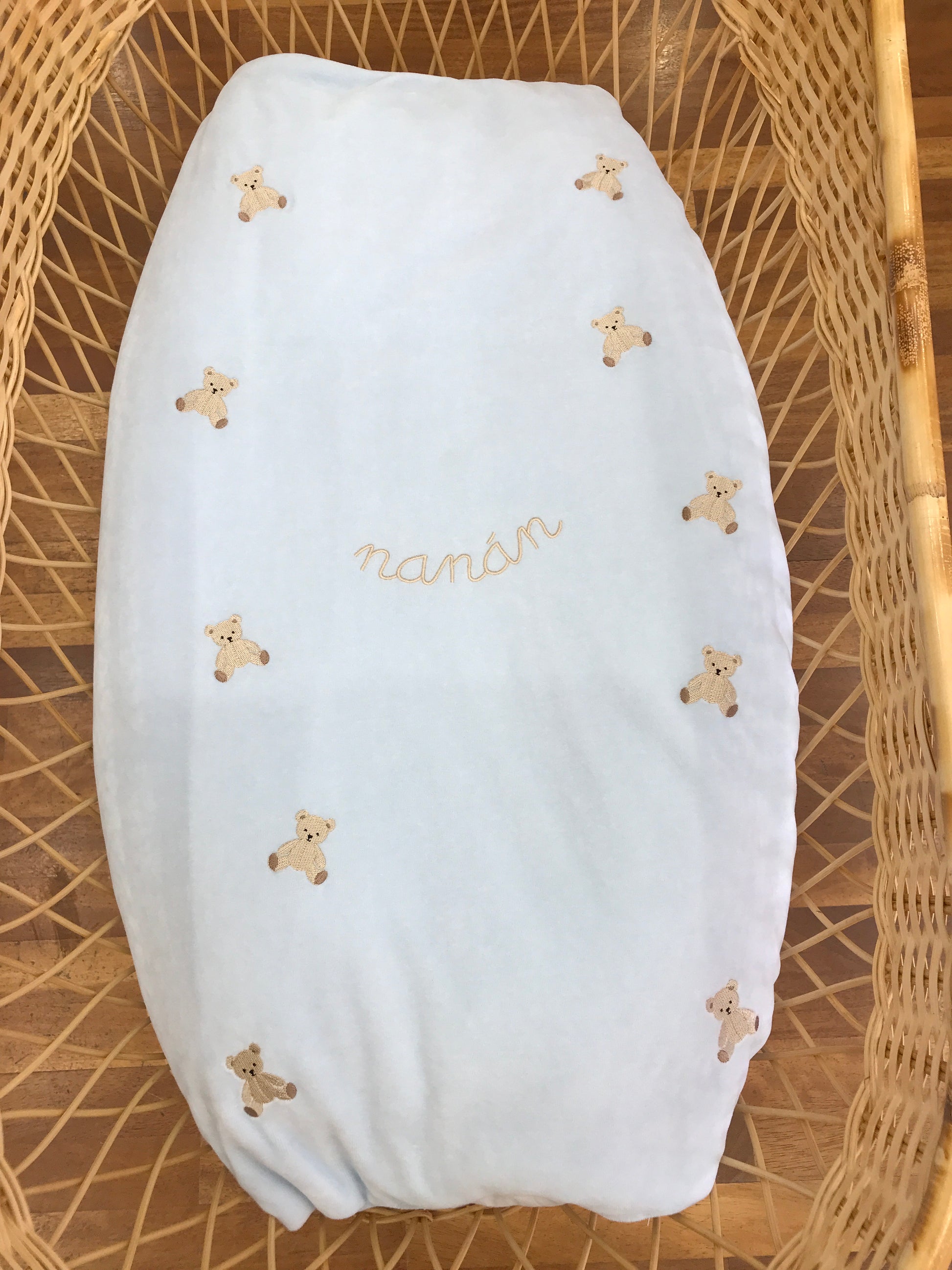 Questa coperta in ciniglia di un delicato colore celeste presenta un logo ricamato in beige posizionato al centro, accompagnato da una decorazione di orsetti ricamati dello stesso tono beige lungo i bordi, che aggiunge un tocco raffinato e distintivo al design complessivo.